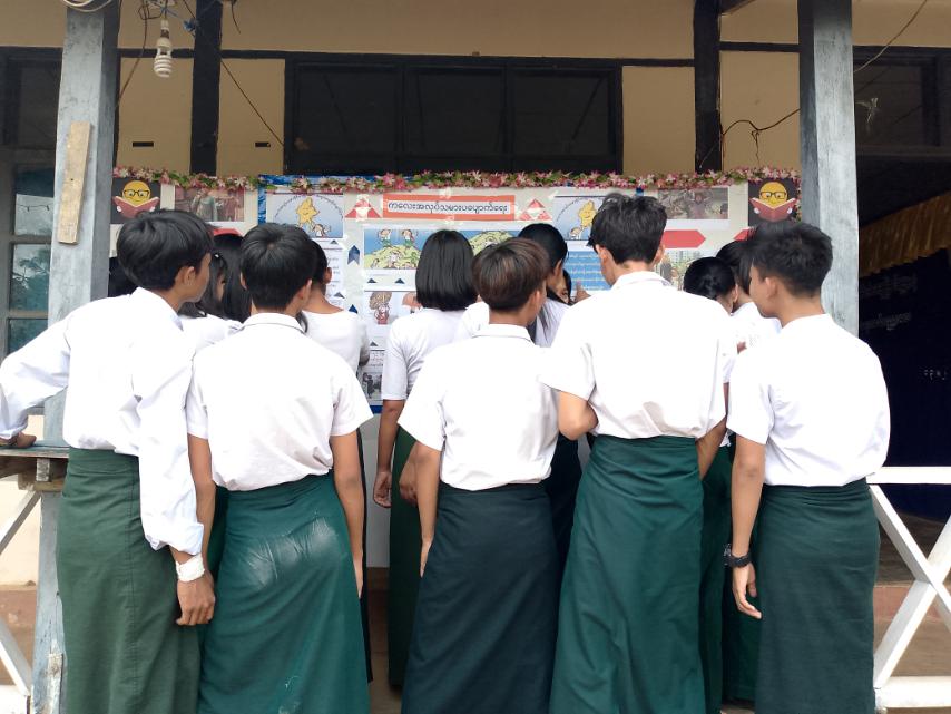 ဟောပြောပွဲအပြီးတွင် ပြန်ကြားရေးနှင့်ပြည်သူ့ဆက်ဆံရေးဦးစီးဌာနမှ ဝန်ထမ်းများခင်းကျင်းပြသထားသည့် ကလေးအလုပ်သမားပပျောက်ရေး အသိပညာပေးနံရံကပ်စာစောင်ကို ကျောင်းသား/ကျောင်းသူများက စိတ်ပါဝင်စားစွာ ကြည့်ရှုလေ့လာခဲ့ကြောင်း သိရသည်။