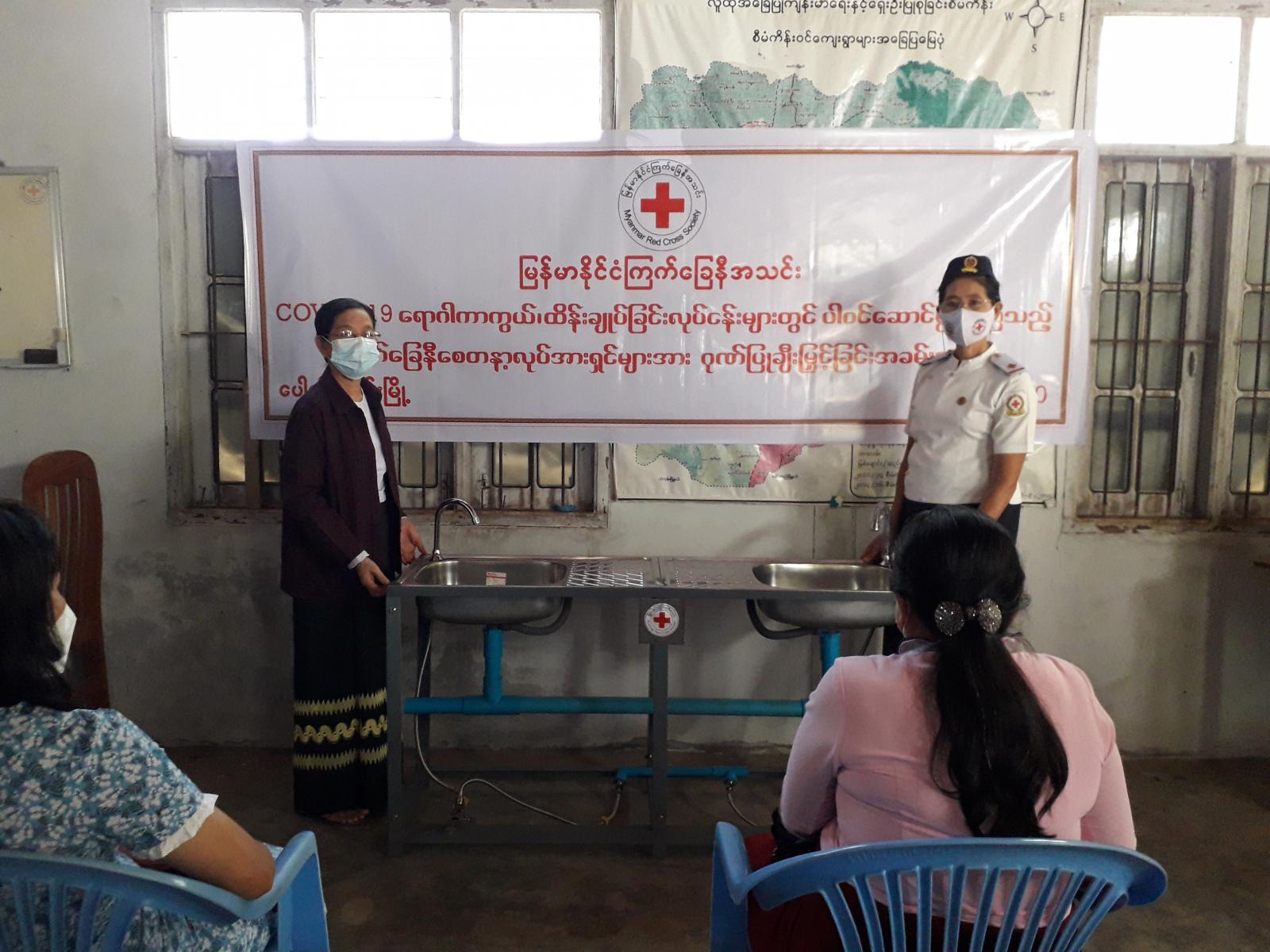 အခမ်းအနားတွင် ခရိုင်ကြက်ခြေနီတပ်ဖွဲ့မှူးဦးဝင်းကြိုင်က မြန်မာနိုင်ငံကြက်ခြေနီအသင်းမှ ခြေနင်းလက်ဆေးဘေစင်များ လှူဒါန်းပေးရခြင်းနှင့် ပက်သက်၍ရှင်းလင်းပြောကြားပြီး ခရိုင်ကြက်ခြေနီတပ်ဖွဲ့မှူးနှင့် မြို့နယ်ကြက်ခြေနီတပ်ဖွဲ့မှူးဒေါ်ဝင်းရီတို့က အဆိုပါပစ္စည်းများကို ပညာရေးဌာနသို့လွှဲပြောင်းပေးအပ်ရာမြို့နယ်ပညာရေးမှူး ဒေါ်မြင့်မြင့်ထွေးက လက်ခံရယူသည်။