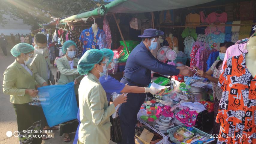 ထိုသို့ဆောင်ရွက်ရာ၌ဒဂုံမြိုနယ်တွင် စျေးရောင်းချနေသော စျေးသည်များ စျေးဝယ်ပြည်သူ များအား ကျန်းမာရေးနှင့်အားကစားဝန်ကြီးဌာနမှထုတ်ပြန်ထားသော ညွှန်ကြားချက်များနှင့် အညီ စျေးရောင်းချကြပါရန် လက်ကိုင်အသံချဲ့စက်များနှင့် လှည့်လှည်အသိပေးကြေညာခြင်း ပါးစပ်နှင့် နှာခေါင်းစည်း Mask and face shield မဖြစ်မနေတပ်ဆင်ရေး အသိပညာပေးခြင်း အခမဲ့ ပေးဝေတပ်ဆင်ခြင်းကို မြို့နယ် ကိုဗစ်−၁၉ ရောဂါထိန်းချုပ်ရေးနှင့် အရေးပေါ် တုံ့ပြန်ရေး ကော်မတီမှ ဦးဆောင်၍ မြို့နယ်အထွေထွေအုပ်ချုပ်ရေးဦးစီးဌာနမှဝန်ထမ်းများ၊ မြို့နယ် ပြည်သူ့ ကျန်းမာရေး ဦးစီးဌာနဝန်ထမ်းများ၊ မြို့နယ်စည်ပင်သာယာရေး ဝန်ထမ်းများ စုပေါင်း၍ လက်ရှိဖြစ်ပွားနေသည့် ကိုဗစ်-၁၉ ရောဂါကာကွယ်ထိန်းချုပ်ခြင်းအနေဖြင့် ပြည်သူ များ တစ်ဦးမှတစ်ဦးသို့ ရောဂါကူးစက် ပြန့်ပွားမှုမရှိစေရန် Mask နှင့် Face shield မဖြစ်မနေ တပ်ဆင်ကြရန်နှင့် အသိပညာပေးလက်ကမ်းစာစောင်များ ဖြန့်ဝေပေးခြင်းကို ဆောင်ရွက်ခဲ့ ကြောင်း သိရှိရသည်။