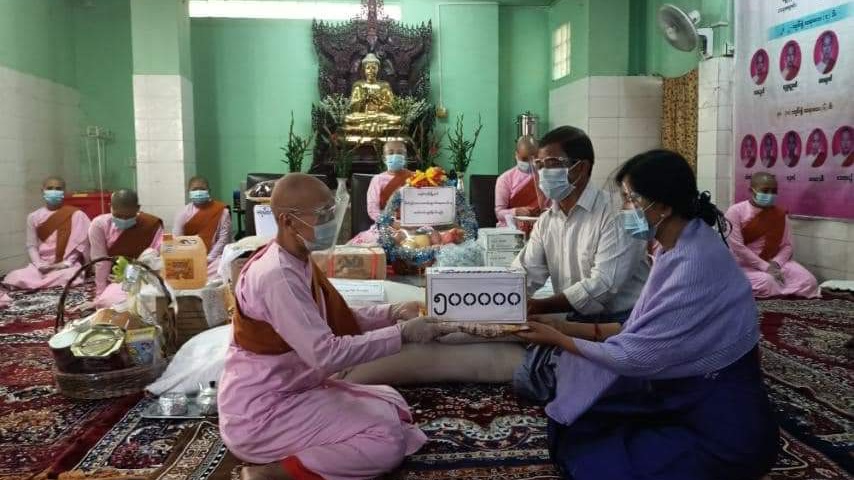 ထိုသို့လှူဒါန်းရာတွင် အလှူရှင်များဖြစ်သည့် ဦးမျိုးအောင်ဌေး(တိုင်းအုပ်ချုပ်ရေးမှူးငြိမ်း)နှင့် ဇနီးသုဓမ္မသိင်္ဂီ ဒေါ်အေးအေးမြင့် မိသားစုမှ ဆွမ်းနဝကမ္မ အလှူငွေ(၅)သိန်းကျပ် ၊ ဦးစိုးစိုးဇော် (ရန်ကုန်တိုင်းအုပ်ချုပ်ရေးမှူး) နှင့်ဇနီး ဒေါ်နန်းချိုချိုပြုံး မိသားစုမှ ဆွမ်းဆန်(၅)အိတ်၊ အနောက်ပိုင်းခရိုင် မိခင်နှင့်ကလေး ဥက္ကဋ္ဌမှ လှူဖွယ်ခြင်းနှင့် မြို့နယ်အုပ်ချုပ်ရေးမှူး ဦးထွန်းချစ်နှင့် ဇနီးဒေါ်သောင်းခင် မိသားစုမှ သစ်သီးခြင်း၊ ဆီ(၁၂)ပိဿာ၊ ကြက်သွန်နီ(၃၀) ပိဿာ၊ ငါးသေတ္တာ ဗူးသေး (၁၀၀)ဗူး ၊ Mask(၁၀၀၀)ခု၊ Face shields (၅၀)ခု၊ လက်သန့်ဆေးရည်နှင့် ခေါက်ဆွဲခြောက်များ ဆပ်ကပ်လှူဒါန်းခဲ့ကြောင်း သိရသည်။
