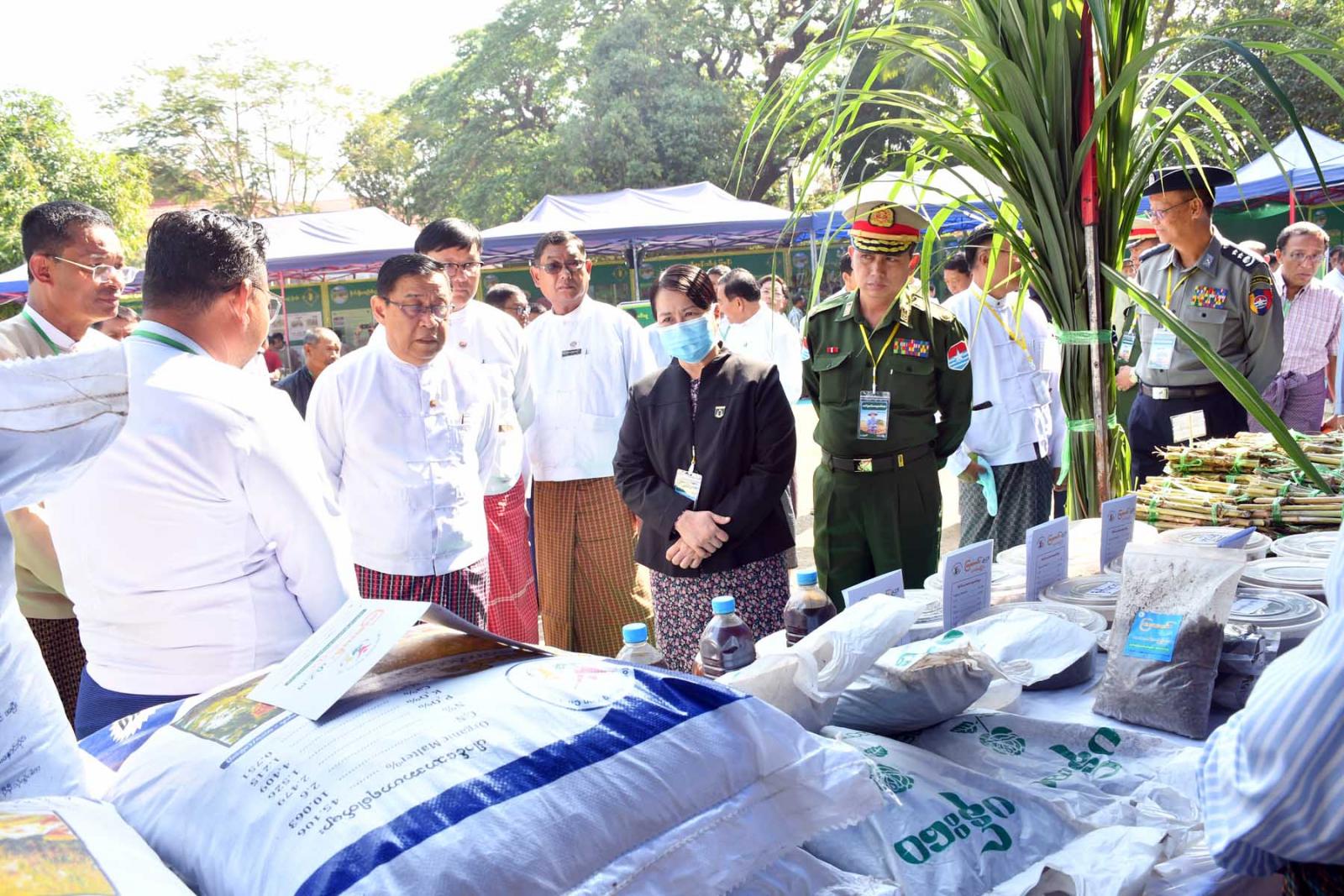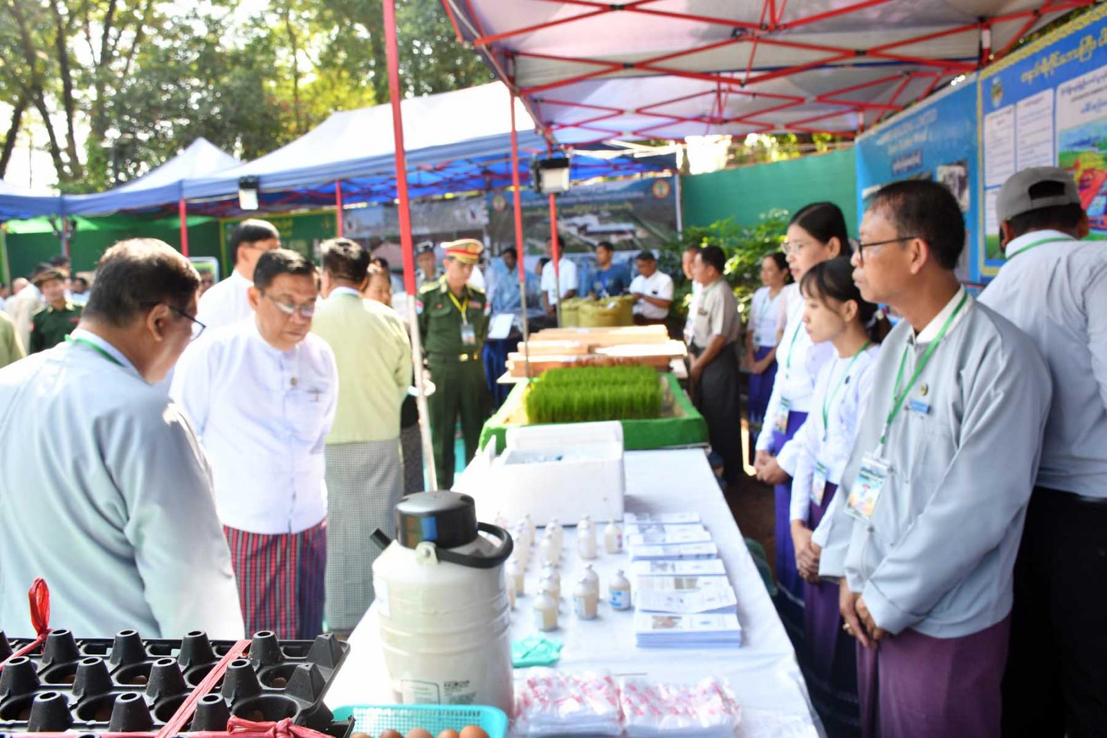 ဆက်လက်၍ တိုင်းဒေသကြီးဝန်ကြီးချုပ် ဦးမြတ်ကိုနှင့်တာဝန်ရှိသူများ၊ အကျိုးဆောင်တောင်သူများတို့က ခင်းကျင်းပြသထားသည့် ဌာနအလိုက်လုပ်ငန်းဆောင်ရွက်မှု၊ တိုင်းဒေသကြီးအတွင်းမှ ထွက်ရှိသောဒေသထွက်ကုန်များ၊ ဒေသမှထွက်ရှိသော MSME ပြခန်းများ၊ သစ်သီးဝလံများ၊ ဒေသထွက်သစ်သားလက်မှုပစ္စည်းများ၊ တန်းဖိုးမြှင့်ရေရှည် စားသောက်ကုန်ပစ္စည်များ၊ စိုက်ပျိုးရေးမွေးမြူရေး၊ မျိုးစေ့၊ သွင်အားစုနှင့်ဒေသထွက်ကုန်အရောင်းပြခန်း၊ စိုက်ပျိုးရေးကဏ္ဍဖွံ့ဖြိုးတိုးတက်စေရေး တောင်သူလယ်သမားများအတွက် တန်ဖိုးသင့်ကောက်စိုက်စက်များစသည့် ပြခန်း(၁၈)ခန်းအား စိတ်ပါဝင်စားစွာလှည့်လည်ကြည့်ရှုအားပေးပြီး တိုင်းဒေသကြီးဝန်ကြီးချုပ်က တောင်သူများအား ရင်းရင်းနှီးနှီးလိုက်လံနှုတ်ဆက်ကြောင်း သတင်းရရှိသည်။