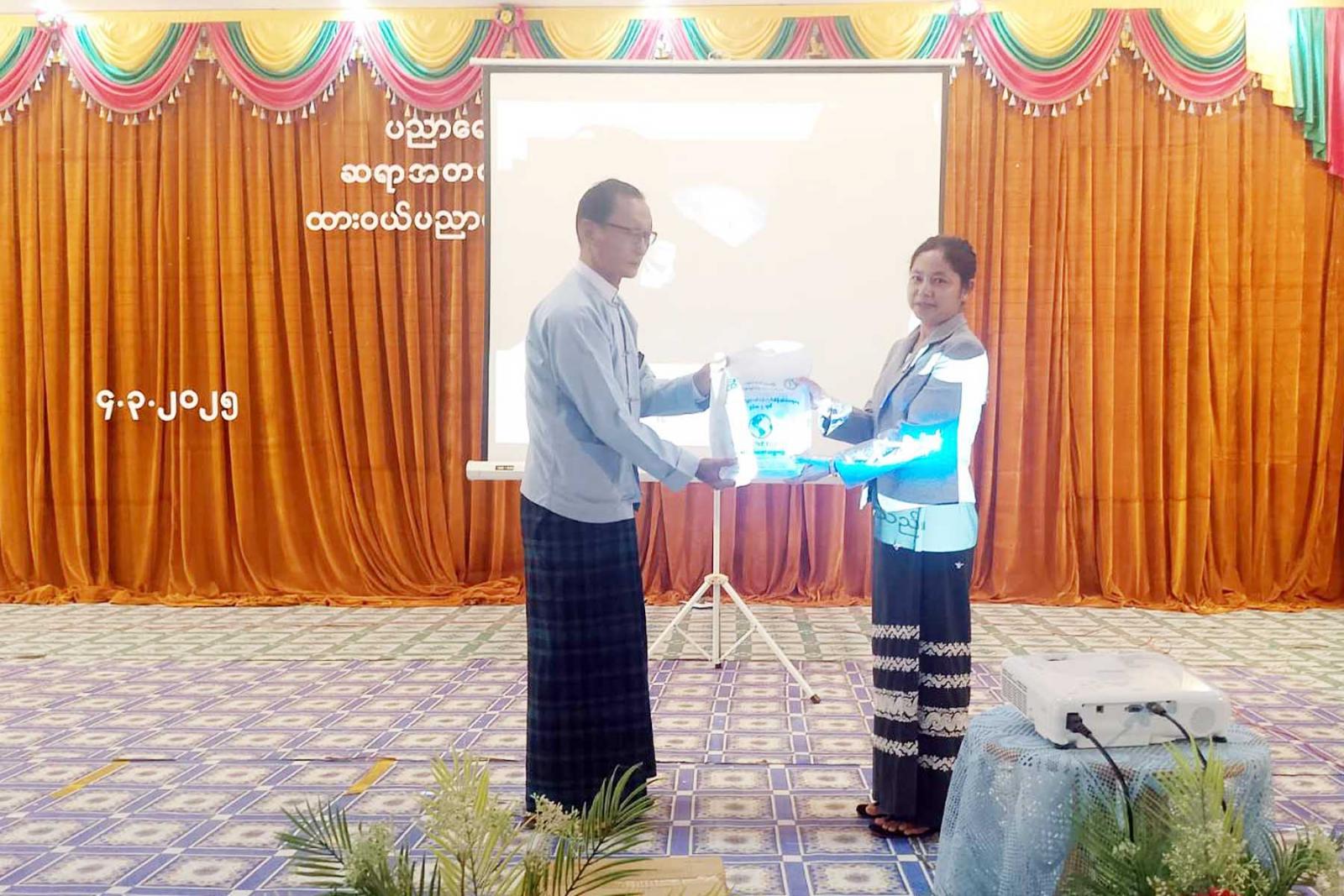 ဆက်လက်၍ လက်ထောက်ညွှန်ကြားရေးမှူးက ပတ်ဝန်းကျင်ထိန်းသိမ်းရေးဥပဒေ၊ နည်းဥပဒေများ၊ ပတ်ဝန်းကျင် အရည်အသွေး(ထုတ်လွှတ်မှု)လမ်းညွှန်ချက်များ၊ အခြေခံပတ်ဝန်းကျင်ဆိုင်ရာ ဘာသာရပ်ဆရာများ လက်စွဲ Level 1, 2, 3, 4, 5, Summary စာအုပ်တို့အား အမှတ်တရလက်ဆောင်ပေးအပ်ရာ တာဝန်ရှိသူတစ်ဦးက လက်ခံယူပြီး ပတ်ဝန်းကျင်ထိန်းသိမ်းရေးဦးစီးဌာန ဝန်ထမ်းများက ဆရာ/မများ၊ သင်တန်းသား၊ သင်တန်းသူများအား အသိပညာပေးလက်ကမ်းစာစောင်များ ဖြန့်ဝေပေးခဲ့ကြောင်း သိရသည်။