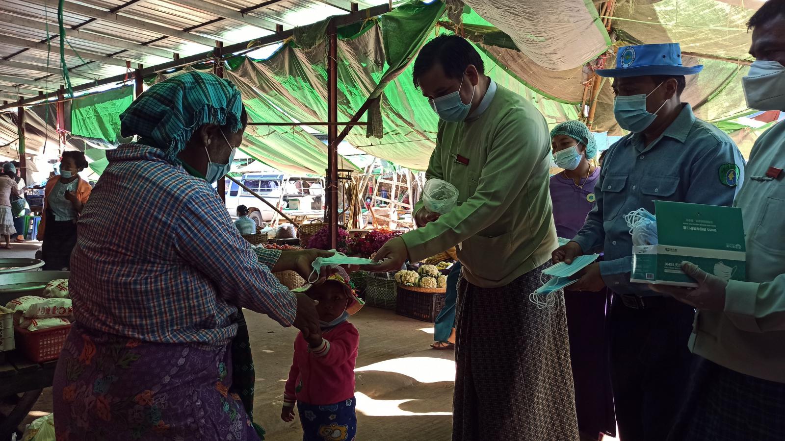 ထိုသို့ဆောင်ရွက်ရာတွင် မြို့နယ်အုပ်ချုပ်ရေးမှူး ဦးဟန်ဇော်မြင့်နှင့် ဝန်ထမ်းများ၊ မြို့နယ် စည်ပင်သာယာရေးအဖွဲ့မှ ဝန်ထမ်းများ၊ မြို့နယ်ပြန်ကြားရေးနှင့် ပြည်သူ့ဆက်ဆံရေး ဦးစီးဌာနမှ ဝန်ထမ်းများ၊ ကျန်းမာရေးဝန်ထမ်းများ၊ မြို့နယ်မိခင်နှင့်ကလေး စောင့်ရှောက် ရေးအသင်းဉက္ကဋ္ဌ ဒေါနီဇာလှိုင်နှင့် အသင်းဝင်များ၊ မြို့နယ်အမျိုးသမီးရေးရာ အဖွဲ့ဝင်များ ပူးပေါင်း၍ ဈေးသွားဈေးလာ ပြည်သူများနှင့် ဒေသခံပြည်သူများအား Surgical Mask (၂၀၀၀) ဖြင့် Mask Campaign ပြုလုပ်ဆောင်ရွက်ပေးခဲ့ကြောင်း သိရသည်။