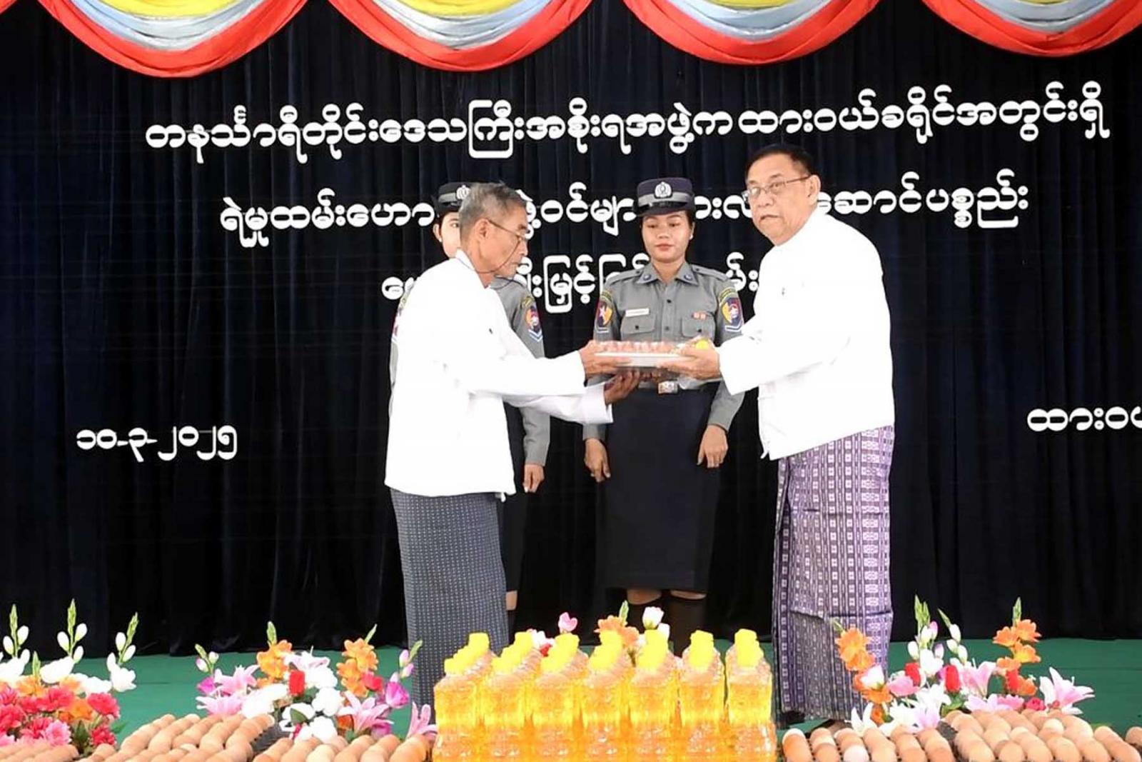 ထို့နောက် တိုင်းဒေသကြီးဝန်ကြီးချုပ်နှင့် တာဝန်ရှိသူများက ရဲမှုထမ်းဟောင်း အဖွဲ့ဝင်များအား ဆန်၊ ဆီ၊ ကြက်ဥနှင့် လက်ဆောင်ပစ္စည်းပေးအပ်ပြီး ထားဝယ်မြို့နယ်ရဲမှုထမ်းဟောင်းအဖွဲ့အတွင်းရေးမှူးက ကျေးဇူးတင်စကားပြောကြားခဲ့သည်။