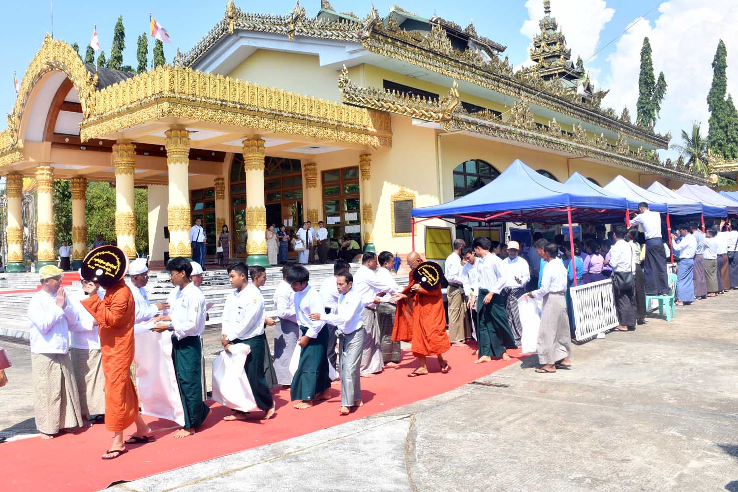 ၄င်းနောက် တက်ရောက်လာကြသော ဧည့်သည်တော်များက ဗုဒ္ဓသာသနံစိရံတိဌတု သုံးကြိမ်ရွတ်ဆိုဆုတောင်း၍ အခမ်းအနားကို ရုပ်သိမ်းလိုက်ကြပြီး မင်္ဂလာဝိုင်းတော်အဖွဲ့က အောင်စေပိုင်စေဓမ္မတေးဖြင့် သီဆိုပူဇော်ကာ သံဃာတော်အရှင်သူမြတ်များနှင့် သီလရှင်များအား တိုင်းဒေသကြီးအစိုးရအဖွဲ့မှ ဦးဆောင်၍ ဌာနဆိုင်ရာများ၊ စေတနာရှင်အလှူရှင်များက ဆွမ်းဆန်တော်များ လောင်းလှူကြကြောင်း သတင်းရရှိသည်။