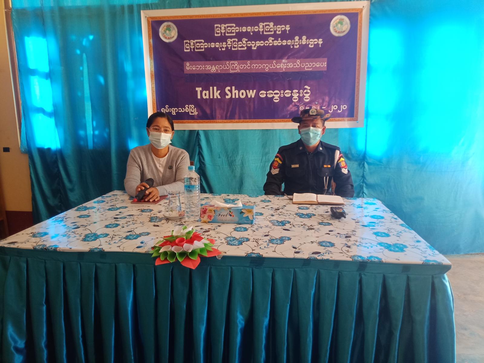 ဆွေးနွေးပွဲတွင် ပြန်ကြားရေးနှင့်ပြည်သူ့ဆက်ဆံရေးဦးစီးဌာန မြို့ဦးစီးမှူး ဒေါ်အေးအေးနွဲ့က ပြည် သူများအနေဖြင့် နွေရာသီပွင့်လင်းရာသီရောက်ပြီဖြစ်၍ မီးဘေးအန္တရာယ်ကြိုတင်ကာကွယ်ရေးကို သိရှိနိုင်ရန်အတွက် အသိပညာပေး(Talk Show)ဆောင်ရွက်ရခြင်းနှင့် ပတ်သက်၍ ရှင်းလင်းပြောကြားပြီး မြို့မီးသတ်ဦးစီးဌာနမှ တာဝန်ခံတပ်ကြပ်ကြီး ဦးရီဝင်းက မီးသတ်ဦးစီးဌာန၏ ရည်ရွယ်ချက်များ၊ မီးဘေးအန္တရာယ် ကြိုတင်ကာကွယ်ရေးအတွက် ဆောင်ရွက်ရမည့်အချက်များ၊ မီးသတ်ဆေးဘူး အသုံးပြုပုံ နည်းလမ်းများ၊ မီးဘေးအန္တရာယ် ကြိုတင်ကာကွယ်ရေး လုပ်ငန်းများ၊ မီးဘေးအန္တရာယ် ကြိုတင် ကာကွယ်ရန်အတွက် ကြိုတင်ပြင်ဆင်ဆောင်ရွက်ရမည့် အကြောင်းအရာများ လက်ရှိဆောင်ရွက်နေသည့် အခြေအနေများ စသည့်မီးဘေး အန္တရာယ်နှင့်ဆိုင်သော သိကောင်းစရာများကို ရှင်းလင်းဆွေးနွေးခဲ့ကြောင်း သိရှိရသည်။