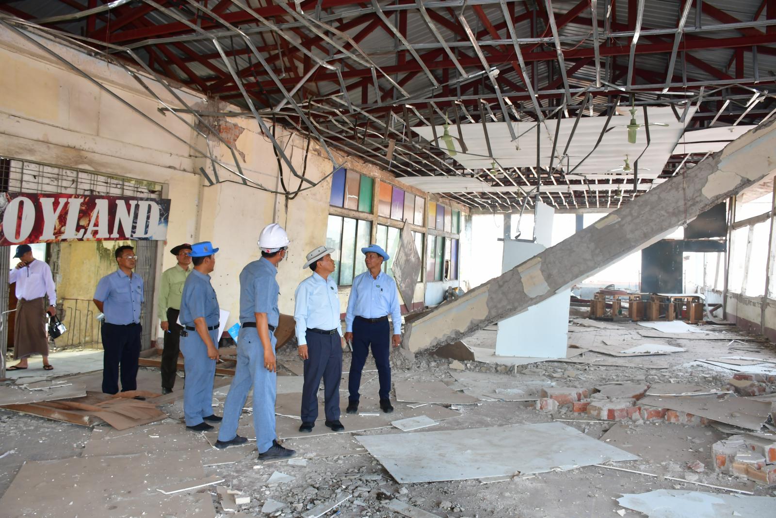 ဆက်လက်၍ နေပြည်တော်ကောင်စီဥက္ကဋ္ဌ ဦးသန်းထွန်းဦးနှင့် တာဝန်ရှိသူများသည် အင်အားပြင်း မြေငလျင်လှုပ်ခတ်မှုကြောင့် ထိခိုက်ပျက်စီးခဲ့သည့် မင်္ဂလာကန်တော်ခန်းမ၊ ရှမ်းကန်ကန်ပတ်လမ်းနှင့် မြို့နယ်စည်ပင်သာယာအုပ်ချုပ်ရေးမှူးရုံးတို့အား ကြည့်ရှုစစ်ဆေးပြီး ငလျင်ဒဏ်သင့်အဆောက်အအုံများ ပြုပြင်ဆောင်ရွက်ရာတွင် လုပ်ငန်းခွင်ဘေးအန္တရာယ်ကင်းရှင်းရေးအတွက် အထူးအလေးထားဆောင်ရွက်ရန်နှင့် အဆောက်အအုံများအား သတ်မှတ်ထားသည့် စံချိန်စံညွှန်းများနှင့်အညီ ရေရှည်ခိုင်ခံ့မှုအတွက် ပြုပြင်တည်ဆောက်ရန်မှာကြားခဲ့ကြောင်း သိရသည်။