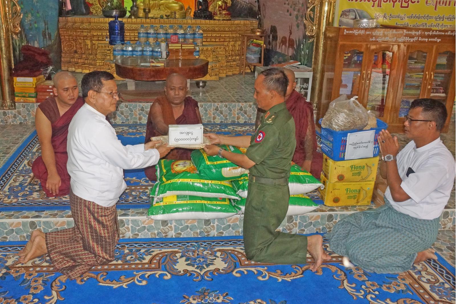 နေပြည်တော်ကောင်စီဝင်များဖြစ်ကြသည့် ဗိုလ်မှူးကြီး ရဲမိုးနှင့် ဦးမြင့်စိုးတို့သည် ယမန်နေ့မွန်းလွဲပိုင်းတွင် ပုဗ္ဗသီရိမြို့နယ်အတွင်းရှိ ဘုန်းတော်ကြီးကျောင်းများအတွက် ဆန်၊ ဆီနှင့် လှူဖွယ်ပစ္စည်းများ ဆက်ကပ်လှူဒါန်း၍ ငလျင်ဘေးသင့်ပြည်သူများအား စားသောက်ဖွယ်ရာများပေးအပ်ခဲ့ပြီး နေပြည်တော်အတွင်းရှိ ငလျင်ဘေးသင့်ပြည်သူများအတွက် လှူဒါန်းသည့် အလှူငွေများ လက်ခံရယူခဲ့သည်။