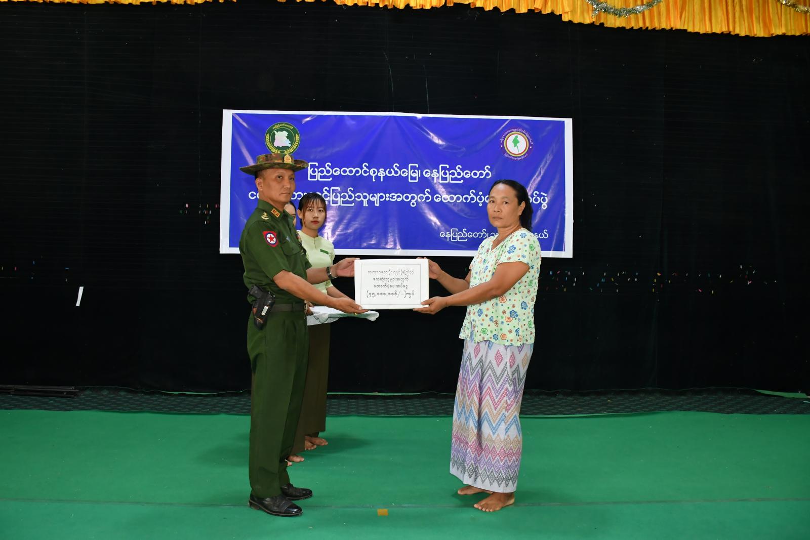ထို့နောက် ငလျင်ဘေးကြောင့် အသက်ဆုံးရှုံးခဲ့သည့် ပြည်သူများအတွက် နိုင်ငံတော်မှ ထောက်ပံ့ငွေကျပ်သိန်း ၄၅၀၊ ဘေးအန္တရာယ်ဆိုင်ရာစီမံခန့်ခွဲမှုဦးစီးဌာနမှ ထောက်ပံ့ငွေကျပ် ၁၄၇ သိန်းနှင့် နေပြည်တော်ကောင်စီမှလှူဒါန်းသည့် ပန်းပေါင်းစုံဗုဒ္ဓရုပ်ပွားတော်များကို နေပြည်တော် ကောင်စီဝင်များဖြစ်ကြသည့် ဗိုလ်မှူးကြီးရဲမိုး၊ ဦးဇေယျာလင်းနှင့် ဦးမြင့်စိုးတို့က ပေးအပ်ရာ ငလျင် ဘေးသင့်သေဆုံးသူ မိသားစုဝင်များ ကိုယ်စား တာဝန်ရှိသူများက လက်ခံရယူခဲ့ကြောင်း သိရသည်။