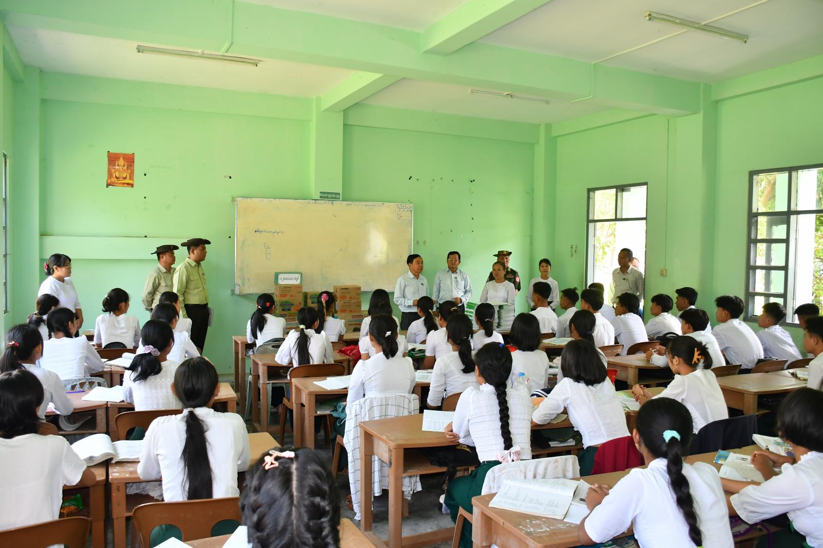 ထို့နောက် နေပြည်တော်ကောင်စီဥက္ကဋ္ဌ ဦးသန်းထွန်းဦးသည် လယ်ဝေးမြို့နယ်၊ သပြေပင် ကျေးရွာ အခြေခံပညာအထက်တန်းကျောင်း၊ လယ်ဝေးမြို့ အမှတ်(၂) အခြေခံပညာ အထက်တန်းကျောင်းနှင့် အမှတ်(၁)အခြေခံပညာ အထက်တန်းကျောင်းများသို့ သွားရောက်ပြီး ၂၀၂၅ ခုနှစ်၊ တက္ကသိုလ်ဝင်တန်း စာမေးပွဲ ပြန်လည်ဖြေဆိုမည့် ကျောင်းသား၊ ကျောင်သူများအား စခန်းသွင်းလေ့ကျင့်နေမှု အခြေအနေများ၊ ကျောင်းအိပ်၊ ကျောင်းစား ထားရှိမှုအခြေအနေများကို ကြည့်ရှုစစ်ဆေးရာ တာဝန်ရှိသူများ၏ တင်ပြချက်များအပေါ် လိုအပ်သည်များကို ပေါင်းစပ်ညှိနှိုင်းဆောင်ရွက်ပေးပြီး ကျောင်းသား၊ ကျောင်းသူများ စိတ်ချမ်းမြေ့စွာ သင်ကြားလေ့ကျင့်နိုင်ရေး အုပ်ချုပ်ရေးပိုင်း တာဝန်ရှိသူများနှင့် ဆရာ၊ ဆရာမများမှ စနစ်တကျကြီးကြပ်ဖြည့်စည်း ဆောင်ရွက်ပေးရေး တို့ကိုမှာကြားပြီး ကျောင်းသား၊ ကျောင်းသူများအား တွေ့ဆုံ၍ အားပေးစကားပြောကြားကာ စားသောက်ဖွယ်ရာများနှင့် စားသောက်စရိတ်များ ပေးအပ်ခဲ့သည်။