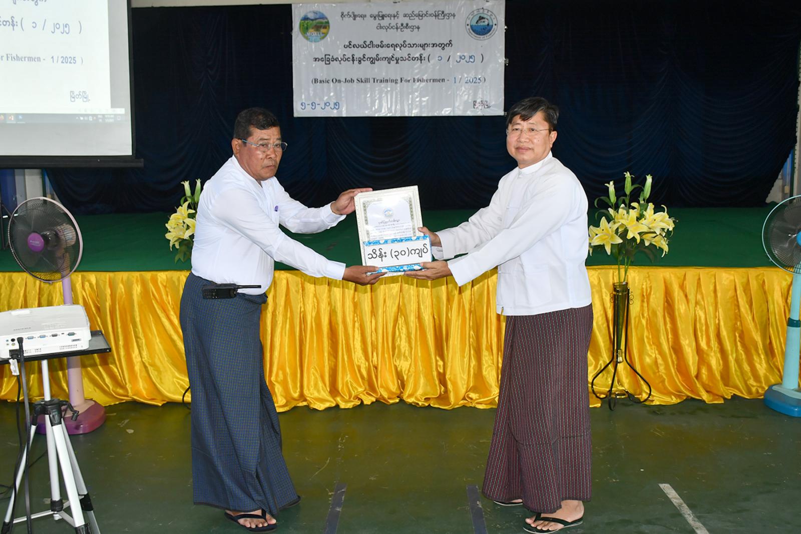 သင်တန်းကို မြိတ်ခရိုင်စီမံအုပ်ချုပ်ရေးအဖွဲ့ဥက္ကဋ္ဌ ဦးမျိုးဦးကအမှာစကားပြောကြား၍ ဖွင့်လှစ်ပေးပြီး တိုင်းဒေသကြီးငါးလုပ်ငန်းအဖွဲ့ချုပ် အတွင်းရေးမှူး ဦးသက်စိုးက သင်တန်းနှင့်ပတ်သက်၍ ရှင်းလင်းပြောကြားသည်။ ထို့နောက် မြိတ်ခရိုင်ငါးလုပ်ငန်းဦးစီးဌာနမှူး ဦးဇော်မင်းဦးက သင်တန်းဖွင့်လှစ်ရခြင်းနှင့်ပတ်သက်၍ ရှင်းလင်းပြောကြား၍ ပင်လယ်ပြင်တွင် အောင်သူဇော်-၁၁၇ ဝိုင်းချုပ်ငါးဖမ်းရေယာဉ်မှ ငါးဖမ်းဆီးနေစဉ် လင်းပိုင်(၉)ကောင်အား ဖမ်းဆီးရမိသဖြင့် ပြန်လည်လွှတ်ပေးခြင်းအတွက် ပဲ့နင်းနှင့်ရေလုပ်သားများအား ဂုဏ်ပြု မှတ်တမ်းနှင့် ဂုဏ်ပြုချီးမြှင့်ငွေ ကျပ်သိန်း(၃၀)ကို တာဝန်ရှိသူများက ပေးအပ်ခဲ့ကြသည်။