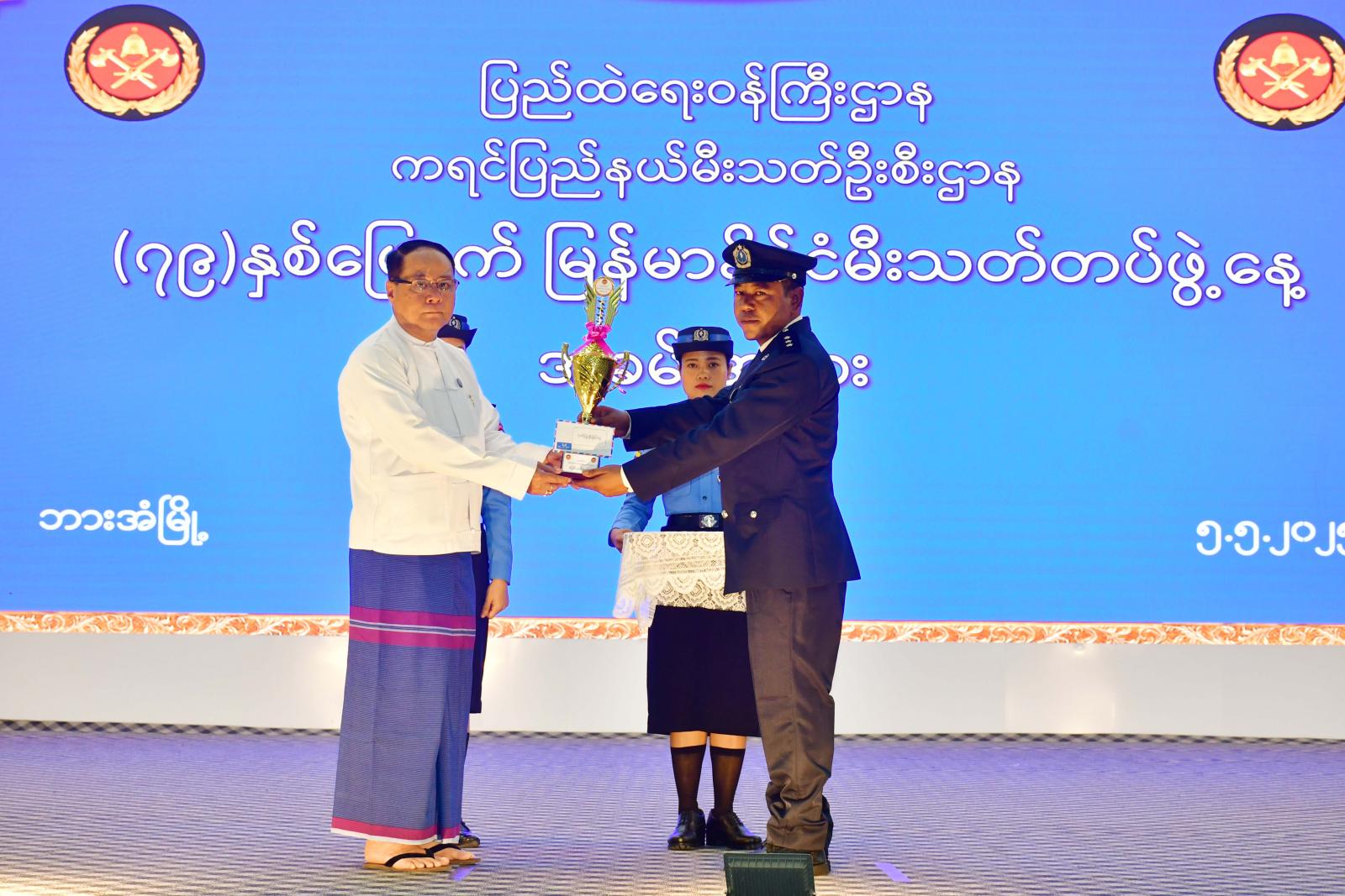 ထို့နောက် ပြည်နယ်ဝန်ကြီးချုပ်၊ ပြည်နယ်လုံခြုံရေးနှင့် နယ်စပ်ရေးရာဝန်ကြီးဗိုလ်မှူး ကြီးမင်းသူကျော်တို့က စံပြမီးသတ်စခန်းဆုရရှိသည့် ဘားအံမြို့နယ်မီးသတ်စခန်းနှင့် ဌာနတွင်းသင်တန်းများတွင် ထူးချွန်ဆုရရှိကြသူများအား ဂုဏ်ပြုဆုများပေးအပ်ချီးမြှင့်ကြပြီး (၇၉)နှစ်မြောက် မြန်မာနိုင်ငံမီးသတ်တပ်ဖွဲ့နေ့အထိမ်းအမှတ်အဖြစ် မြန်မာနိုင်ငံမီးသတ်တပ်ဖွဲ့ ဌာနချုပ်မှပေးပို့သော Video Clip ကို တက်ရောက်လာသူများနှင့်အတူ ကြည့်ရှုအားပေးခဲ့ကြသည်။