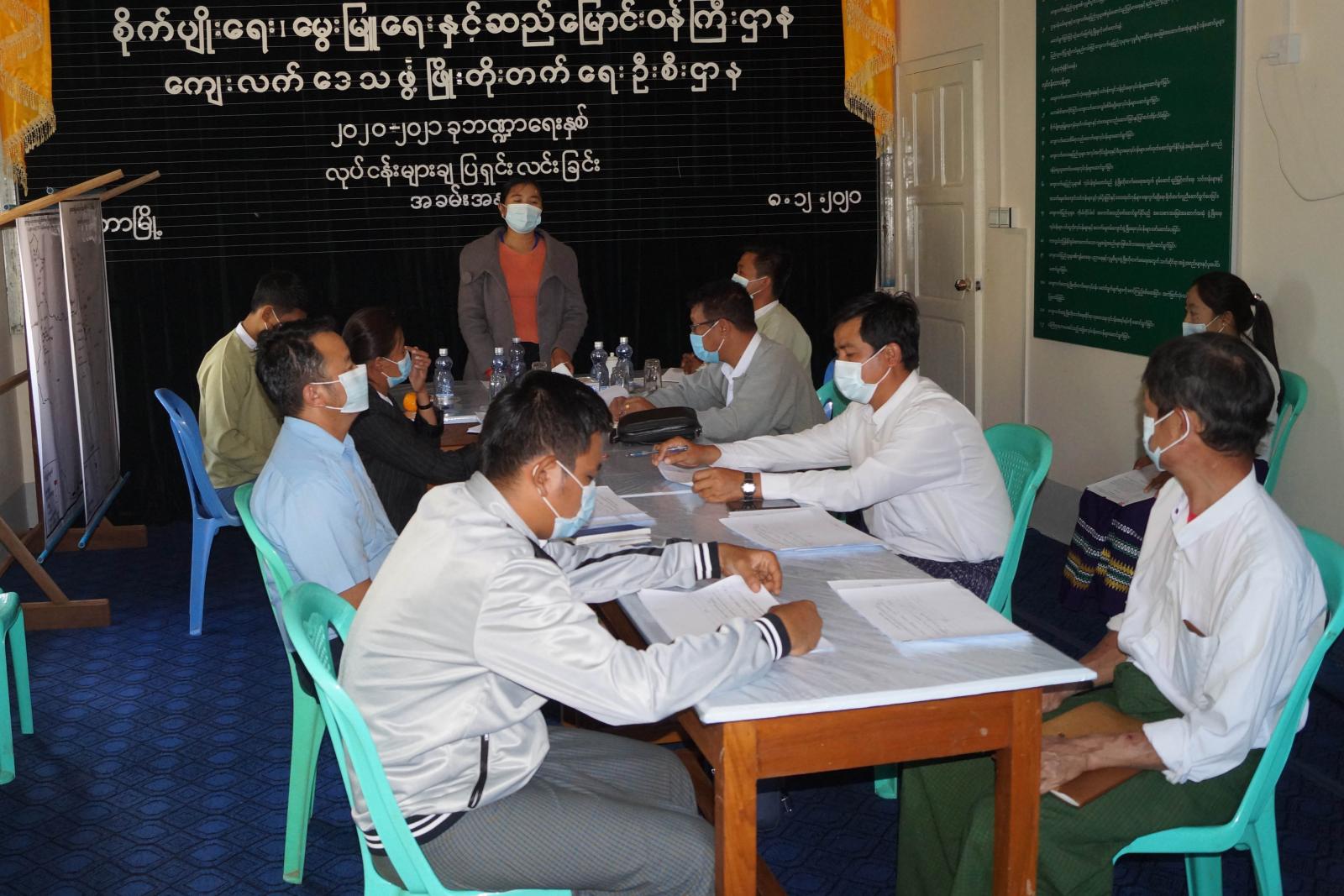 ရှေးဦးစွာ ပြည်သူ့လွှတ်တော်ကိုယ်စားလှယ် ဒေါ်ဝင့်ဝါထွန်းက အဖွင့်အမှာစကား ပြောကြားပြီး ကျေးလက် ဒေသဖွံ့ဖြိုး တိုးတက်ရေးဦးစီးဌာန မြို့နယ်ဦးစီးမှူး ဦးထွေးအောင်က ၂၀၂၀-၂၀၂၁ ဘဏ္ဍာနှစ်တွင် ဆောင်ရွက်မည့် အသက်မွေးဝမ်း ကျောင်းအထောက်အကူပြု သင်တန်းများ၊ လမ်း၊ တံတား၊ သောက်သုံးရေ ရရှိရေး၊ မြစိန်းရောင်အတိုးရငွေဖြင့် ဆောင်ရွက်မည့် လုပ်ငန်းများနှင့် ကျေးရွာဖွံ့ဖြိုးရေးစီမံကိန်း(VDP) ဆောင်ရွက်မည့် လုပ်ငန်းများအား ရှင်းလင်းတင်ပြခဲ့ သည်။ ထို့နောက် တက်ရောက်လာကြသော ဌာနဆိုင်ရာ များ၊ ရပ်/ကျေးအုပ်ချုပ်ရေးမှူးများက ဆောင်ရွက်မည့် လုပ်ငန်း များနှင့် ပတ်သက်၍ ဆွေးနွေးခဲ့ကြပြီး မြို့နယ်အုပ်ချုပ်ရေးမှူး ဦးရန်နိုင်မောင်က နိဂုံးချုပ်အမှာစကား ပြောကြားခဲ့ကြောင်း သိရသည်။
