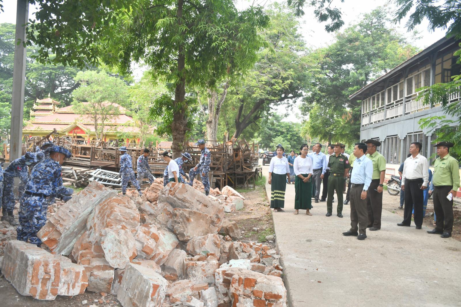 ထို့နောက် နေပြည်တော်ကောင်စီဥက္ကဋ္ဌ ဦးသန်းထွန်းဦးသည် မြန်မာအပြည်ပြည်ဆိုင်ရာ ကွန်ဗင်းရှင်း ဗဟိုဌာန(၁)သို့ သွားရောက်ပြီး ငလျင်ဘေးကြောင့် ထိခိုက်ပျက်စီးမှုများအား ပြန်လည်ပြုပြင်နေမှုအခြေအနေများကို လှည့်လည်ကြည့်ရှုစစ်ဆေးပြီး တာဝန်ရှိသူများမှ တင်ပြချက်များအပေါ် ပျက်စီးသည့် အစိတ်အပိုင်းများအား စနစ်တကျ ဖယ်ရှားရှင်းလင်းထားရှိရေး၊ သတ်မှတ်စံချိန်စံညွှန်းနှင့်အညီ ပြုပြင်ဆောင်ရွက်ရေး၊ လုပ်ငန်းအား အပိုင်းလိုက် အမြန်ဆုံးပြီးစီးအောင်ဆောင်ရွက်ရေးတို့ကို မှာကြားပြီး လိုအပ်သည်များ ပေါင်းစပ်ညှိနှိုင်းဆောင်ရွက်ပေးခဲ့သည်။