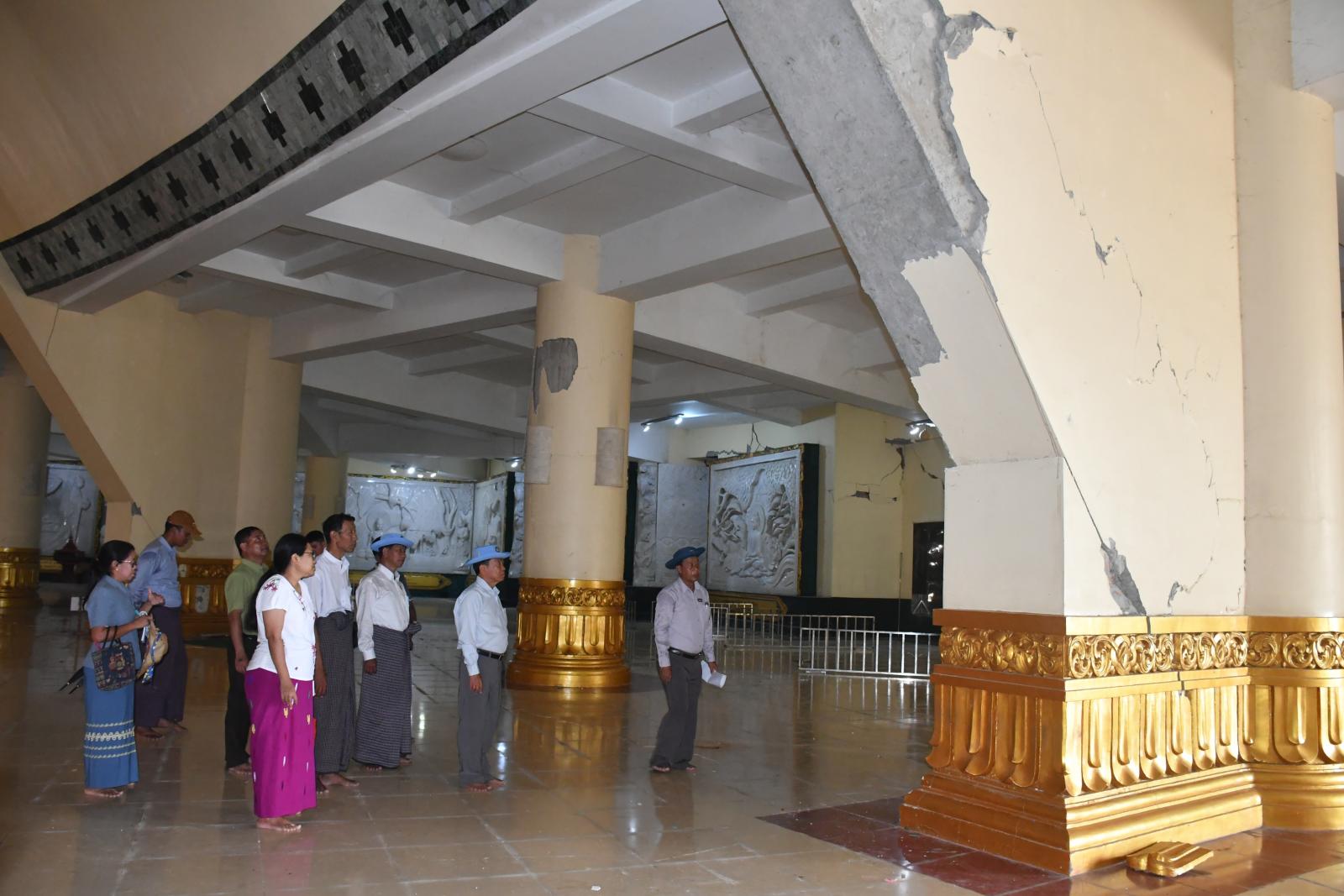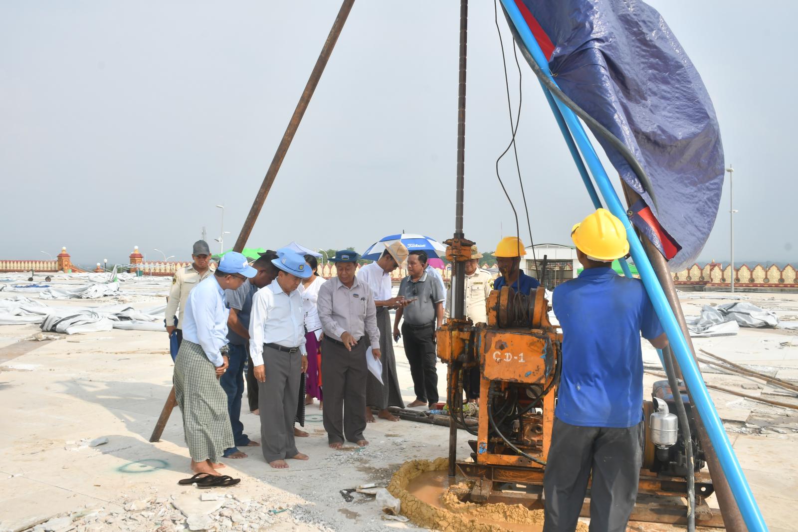 ကြည့်ရှုစစ်ဆေးစဉ် တာဝန်ရှိသူများမှ ငလျင်ဒဏ်ကြောင့်ဖြစ်ပေါ်ခဲ့သည့် ဥပ္ပါတသန္တိစေတီတော်မြတ်ကြီး ရင်ပြင်တော်၊ ပစ္စယာနှင့်ပရိဝုဏ်များ ထိခိုက်ပျက်စီးမှုနှင့် ပြုပြင်မွမ်းမံရေးလုပ်ငန်းများဆောင်ရွက်နေမှုအခြေအနေများ၊ Cement grouting အတွက် ဆောင်ရွက်နေမှုအခြေအနေများ၊ Soil stabilization လုပ်ရန်အတွက် Backhoe breaker ဖြင့် မူလရင်ပြင်တော်ကြမ်းခင်းအား တူးထုတ်နေမှုအခြေအနေများအား ရှင်းလင်းတင်ပြကြရာ တင်ပြချက်များအပေါ် နေပြည်တော်ကောင်စီဥက္ကဋ္ဌက လုပ်ငန်းများအမြန်ဆုံးပြီးစီးအောင်ဆောင်ရွက်ရေး၊ လုပ်ငန်းသုံးစက်ပစ္စည်းကိရိယာများ ထပ်မံဖြည့်ဆည်းဆောင်ရွက်ရေး၊ သတ်မှတ်စံချိန်စံညွှန်းများနှင့်အညီ ရေရှည်ခိုင်ခံ့မှုရှိအောင်ဆောင်ရွက်ရေး၊ နည်းပညာဆိုင်ရာပြုပြင်မွမ်းမံရေးလုပ်ငန်းများကို စနစ်တကျစီမံဆောင်ရွက်နိုင်ရေးတို့ကိုမှာကြားပြီး လိုအပ်ချက်များကို ပေါင်းစပ်ညှိနှိုင်းဆောင်ရွက်ပေးခဲ့ကြောင်း သိရသည်။