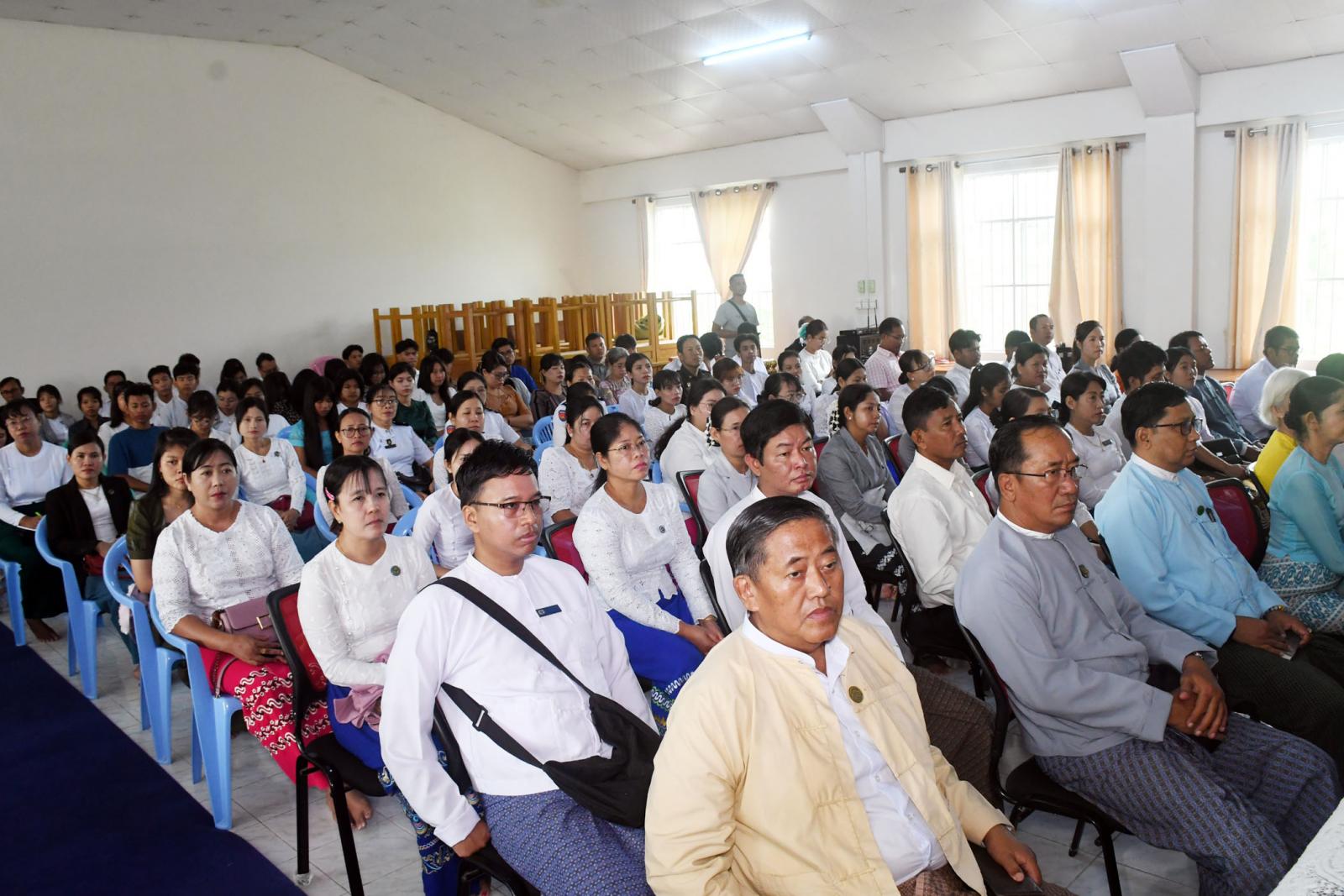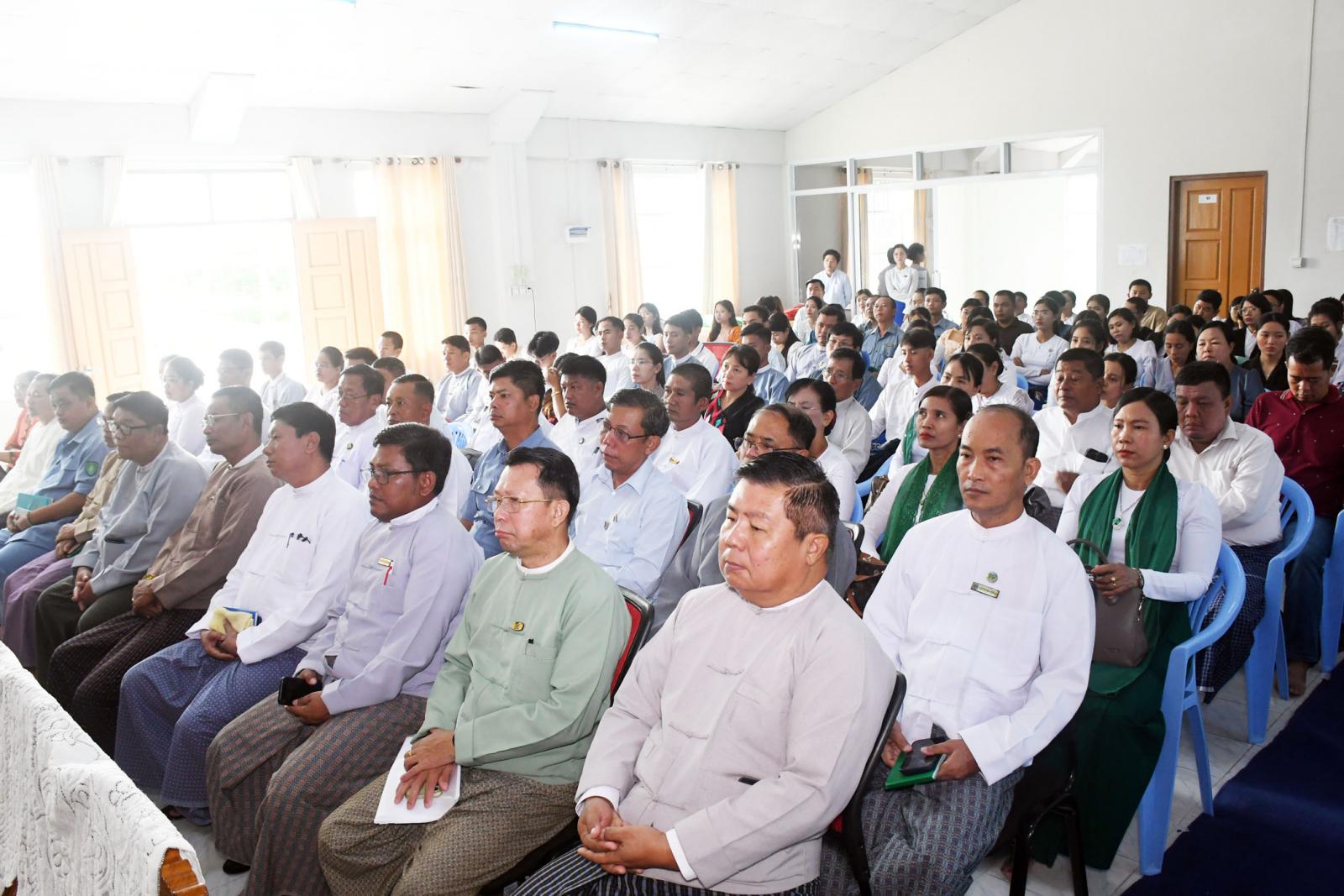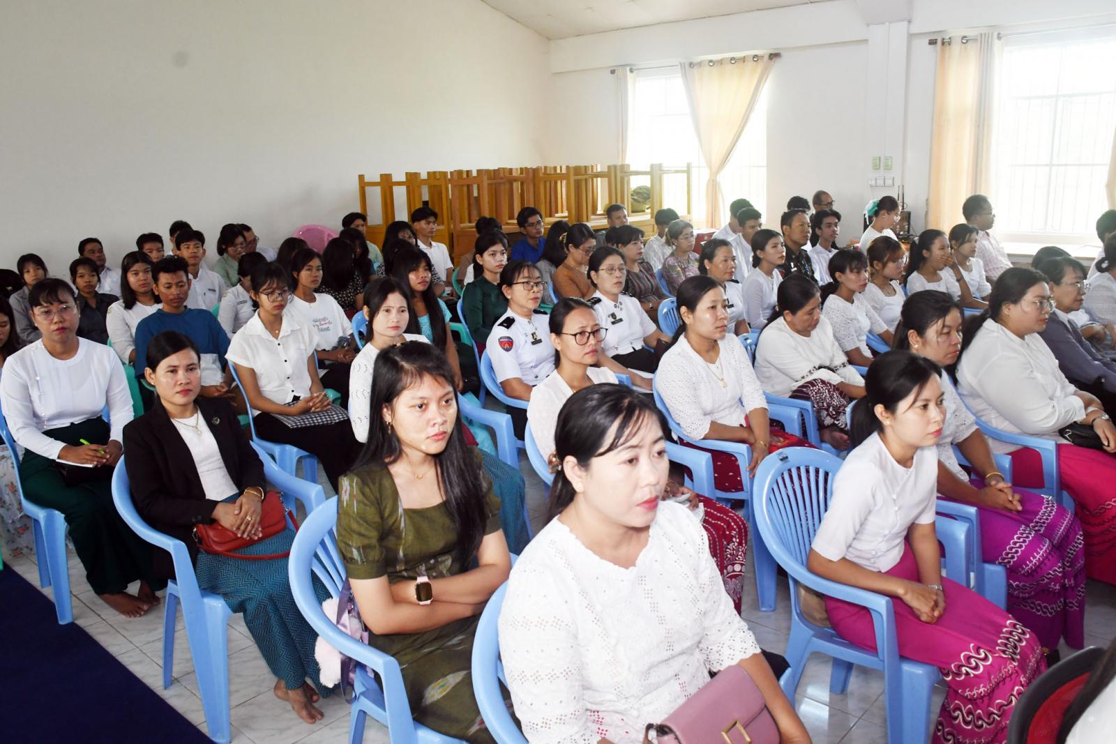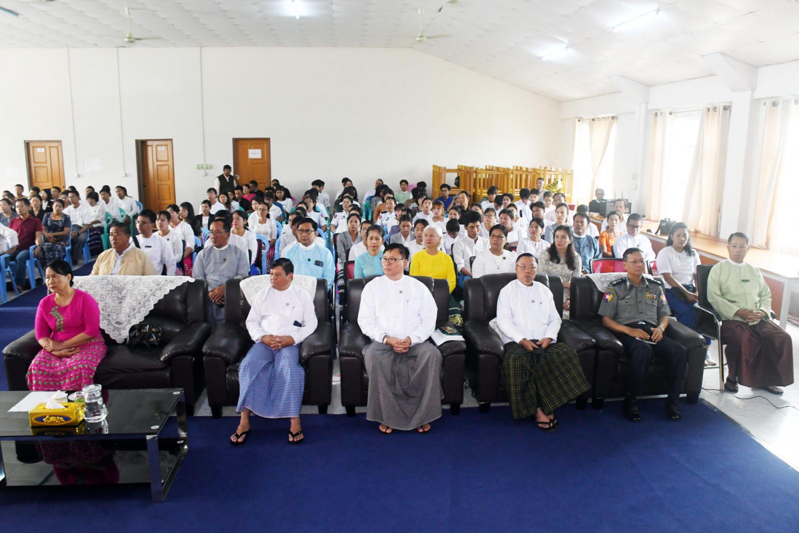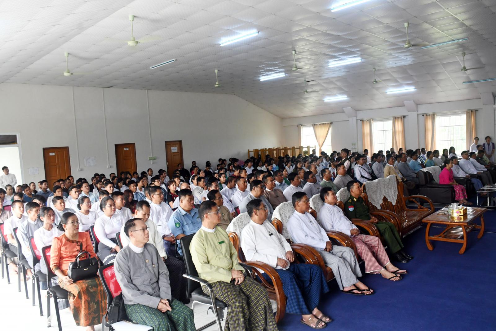 ထို့နောက် တိုင်းဒေသကြီးဝန်ကြီးချုပ်က သင်တန်းသား/ သူများအား သင်ထောက်ကူပစ္စည်းများ ပေးအပ်ပြီး တိုင်းဒေသကြီးဝန်ကြီးချုပ်၊ တိုင်းဒေသကြီးတရားလွှတ်တော်တရားသူကြီးချုပ်၊ တိုင်းဒေသကြီးဝန်ကြီးများ၊ သင်တန်းသို့ တက်ရောက်လာကြသူများက စုပေါင်းမှတ်တမ်းဓာတ်ပုံ ရိုက်ကူးကြသည်။