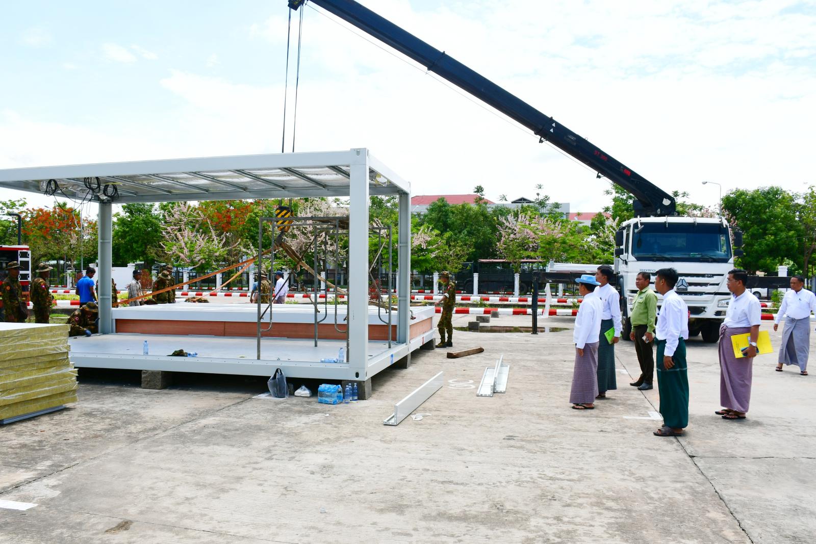 ဆက်လက်၍ နေပြည်တော်ကောင်စီဥက္ကဋ္ဌ ဦးသန်းထွန်းဦးသည် နေပြည်တော်ကောင်စီ ဇမ္ဗူသီရိခန်းမဝင်းအတွင်း Prefabricated Office များ တပ်ဆင်တည်ဆောက်နေမှုနှင့် ယာယီရုံးများဆောက်လုပ်ထားရှိပြီး ရုံးလုပ်ငန်းများ ဆောင်ရွက်နေမှုအခြေအနေများကို လှည့်လည်ကြည့်ရှုစစ်ဆေးရာ တာဝန်ရှိသူများမှ တင်ပြချက်များအပေါ် နေပြည်တော်ကောင်စီဥက္ကဋ္ဌက ရုံးလုပ်ငန်းများ စနစ်တကျဆောင်ရွက်ရေး၊ ရုံးခန်းများတွင် စနစ်တကျနေရာချထားရေး၊ ရုံးသုံးစက်ပစ္စည်းများအား စနစ်တကျထားရှိရေး၊ လျှပ်စစ်မီးကြိုးများ အန္တရာယ်မဖြစ်စေရန် စနစ်တကျသွယ်တန်းထားရှိရေး၊ ဝန်ထမ်းများ သက်သာချောင်ချိရေး ကိစ္စရပ်များ ဆောင်ရွက်ပေးရန်တို့ကို မှာကြားခဲ့သည်။