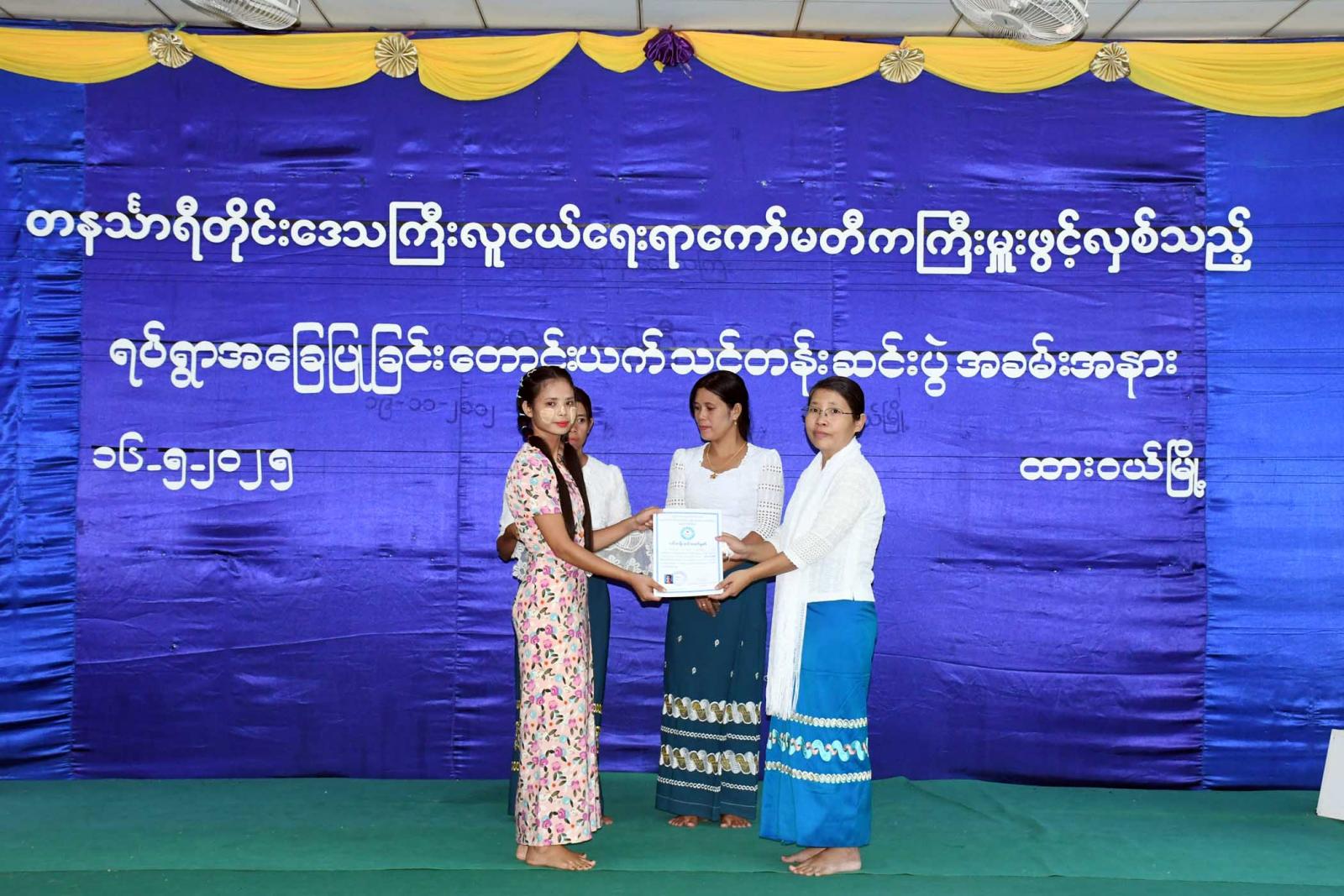 ထို့နောက်တိုင်းဒေသကြီးလူငယ်ရေးရာ ကော်မတီတွဲဘက်အတွင်းရေးမှူး၊ တိုင်းဒေသကြီး လူမှုဝန်ထမ်း ဦးစီးဌာန၊ ညွှန်ကြားရေးမှူးက သင်တန်းဖွင့်လှစ်သင်ကြားရခြင်းနှင့်ပတ်သက်၍ ရှင်းလင်းတင်ပြပြီး တိုင်းဒေသကြီးအစိုးရအဖွဲ့ လူမှုရေးရာဝန်ကြီးနှင့်တာဝန်ရှိသူများက သင်တန်းသူ(၂၀)ဦးအား သင်တန်းဆင်း လက်မှတ်များပေးအပ်ကာ သင်တန်းသူတစ်ဦးက ကျေးဇူးတင်စကား ပြန်လည် ပြောကြားသည်။