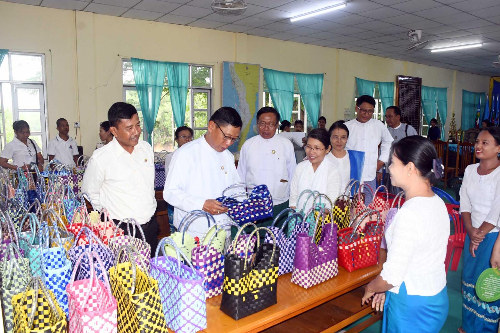 ဆက်လက်၍ တိုင်းဒေသကြီးအစိုးရအဖွဲ့ လူမှုရေးရာဝန်ကြီးက သင်တန်းသူများ ယက်လုပ်ထားသော ခြင်းတောင်းအား ကြည့်ရှုအားပေးပြီး သင်တန်းသူများအားရင်းရင်းနှီးနှီး နူတ်ဆက်ကြောင်း သတင်းရရှိသည်။