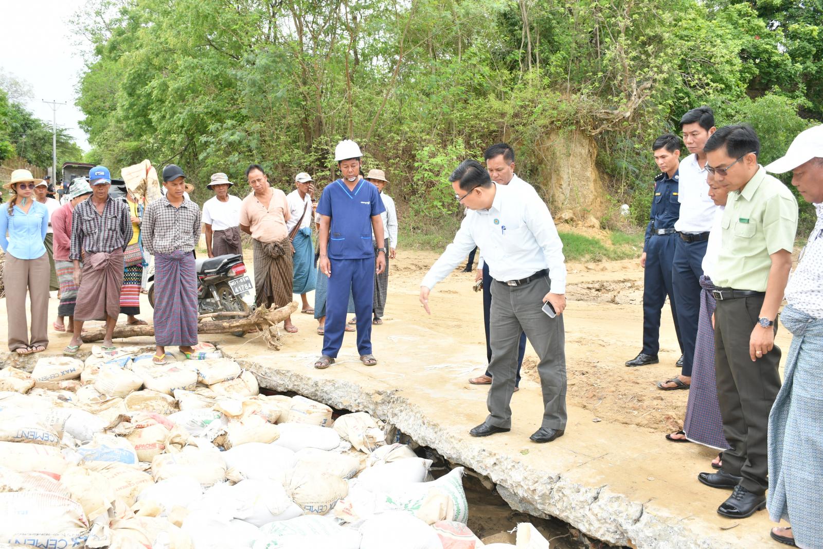 ဦးစွာ နေပြည်တော်ကောင်စီဝင် ဦးဇေယျာလင်းနှင့်တာဝန်ရှိသူများ မန္တလေးမြေငလျင်ဘေး ကြောင့်ပျက်စီးခဲ့သည့် မြောက်မြိုက်(ရှ)ကျေးရွာအနီး၊ မြောက်မြိုက်ချောင်းကူးရေကျော်တံတား ကျိုးပေါက်မှုအား သဲအိတ်များဖြင့်ယာယီပြန်လည်ပြုပြင်ဆောင်ရွက်နေမှုအား ကြည့်ရှုခဲ့ပြီး လိုအပ်သည်များကို သက်ဆိုင်ရာတာဝန်ရှိသူများအား ဆွေးနွေးမှာကြားခဲ့သည်။