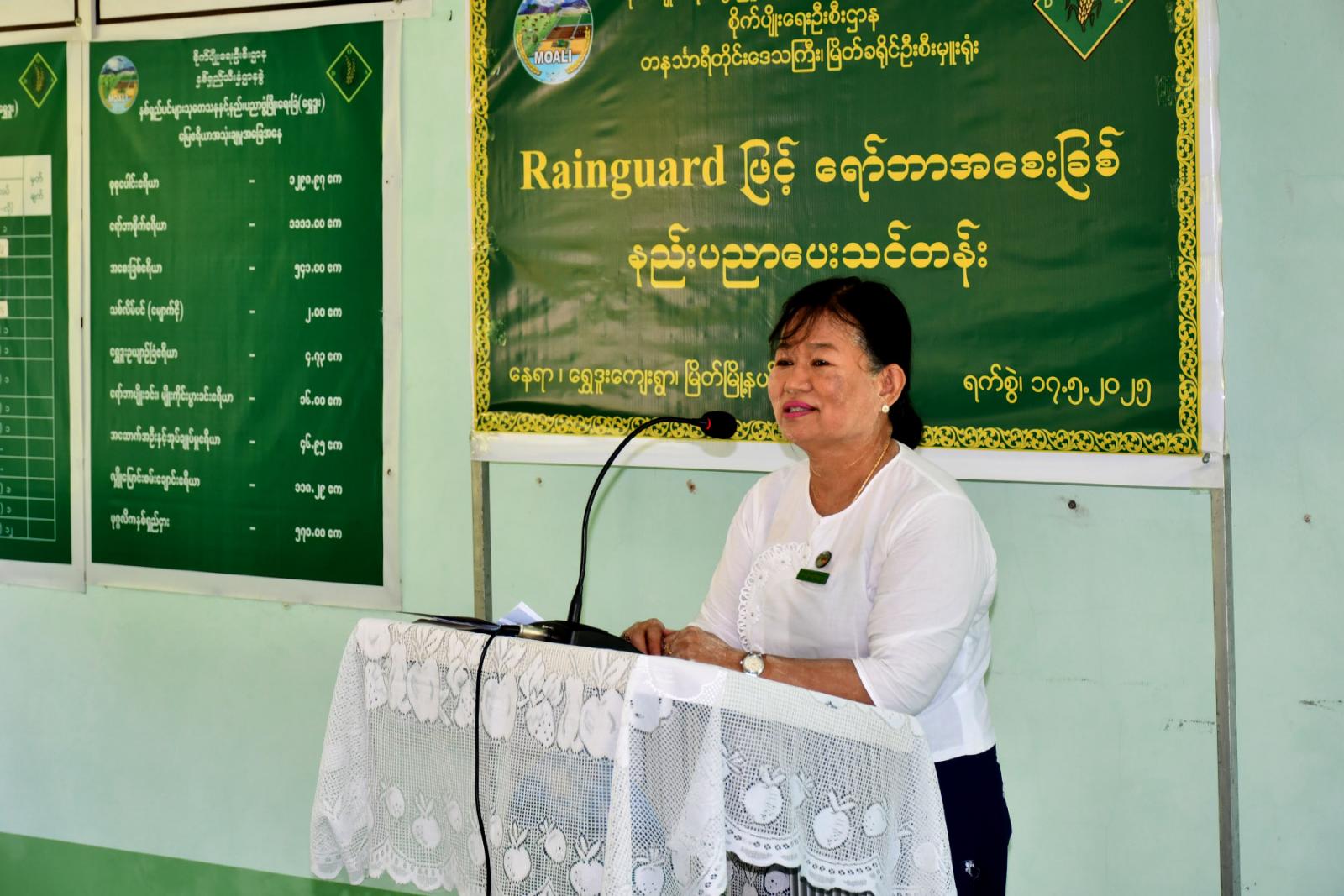 ထို့နောက် စိုက်ပျိုးရေးဦးစီးဌာန မြို့နယ်ဦးစီးမှူး ဦးဝင်းမြတ်စိုးက ရော်ဘာပင်ကို မိုးရာသီ မိုးကာ အစေးခြစ်စနစ်ဖြင့်ရော်ဘာအစေးခြစ်ခြင်း၊ ရော်ဘာပင်လုံးပတ်တစ်ဝက် ရက်ခြားရော်ဘာ အစေးခြစ်စနစ်၊ မိုးကာ အစေးခြစ်စနစ်ပုံစံများကို ရှင်းလင်းပြောကြားပြီး စိုက်ပျိုးရေးဦးစီးဌာန၊ နှစ်ရှည်ပင်များသုတေသနနှင့် နည်းပညာဖွံ့ဖြိုးရေးခြံ(ရွှေဒူး)မှ လက်ထောက်ဦးစီးမှူး ဦးသီဟမွန်က မိုးကာဖြင့်အစေးခြစ်စနစ် ဆောင်ရွက်ရွာတွင် အသုံးပြုရန် လိုအပ်သည့်ပစ္စည်းများနှင့် ဆောင်ရွက်ရမည့် နည်းလမ်းများကို ရှင်းလင်းပြောကြားသည်။
