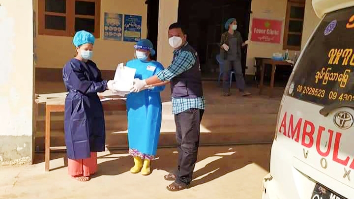 ဆေးရုံဆင်းခွင့်ရသူများအား မြို့နယ်ကျန်းမာရေးနှင့်ကုသရေးဦးစီးဌာနမှ Sister ဒေါ်တင်မိုးထွေးက ကျန်းမာရေးကောင်းမွန်ကြောင်း ထောက်ခံစာများ ပေးအပ်ပြီး မိမိတို့နေအိမ်တွင် နေထိုင်ရမည့် စည်းကမ်းချက်များကို မှာကြားကာ စေတနာ့ဝန်ထမ်းများက ကိုဗစ်-၁၉ ရောဂါကာကွယ် ထိန်းချုပ်ရေး အထောက်အကူပြုပစ္စည်းများကို အလှူရှင်များကိုယ်စား ထောက်ပံ့ပေးအပ်ခဲ့ကြ သည်။