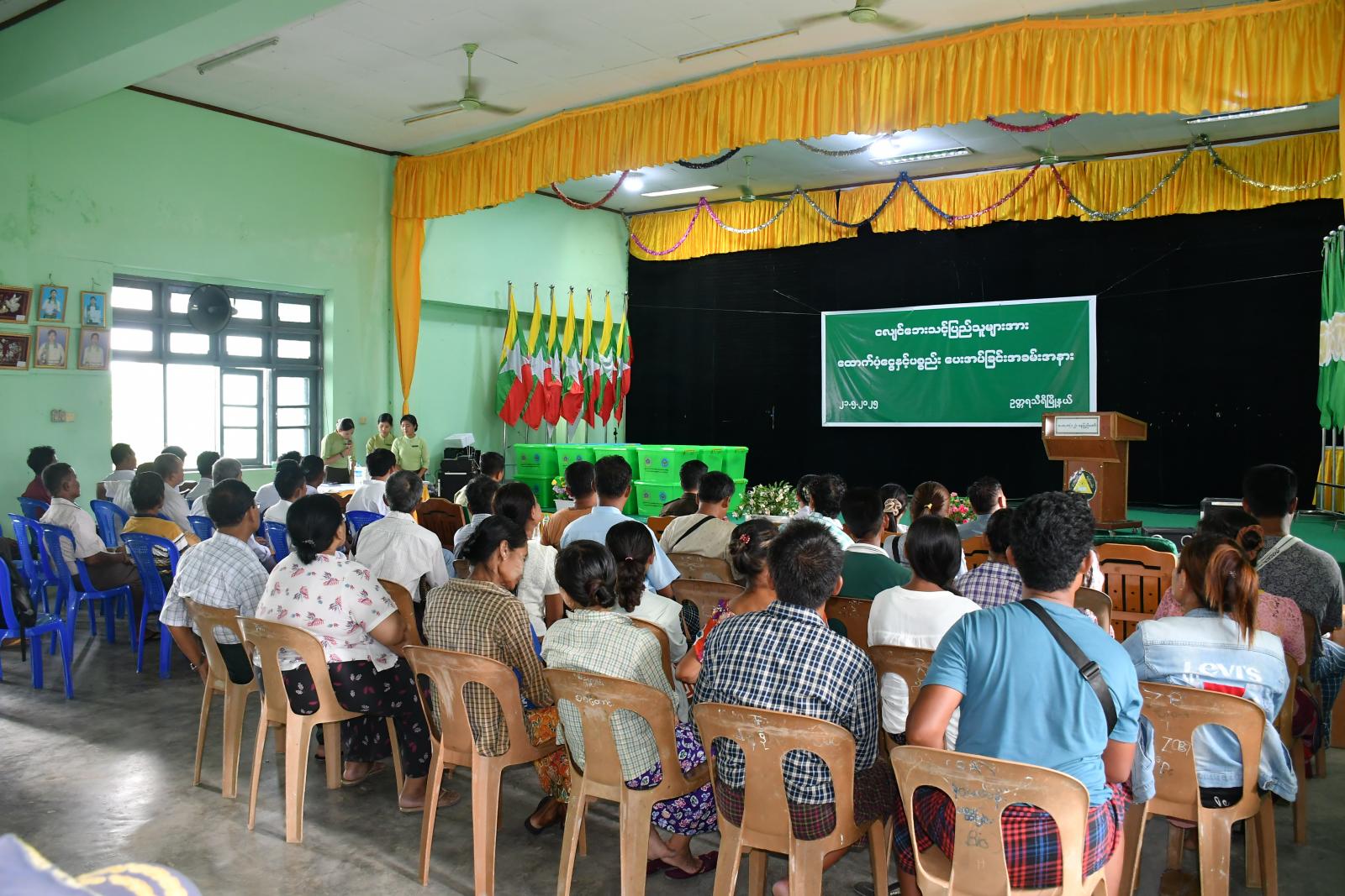 ယင်းနောက် ဒုတိယမြို့နယ်အုပ်ချုပ်ရေးမှူးနှင့် တာဝန်ရှိသူများက ငလျင်ဘေးသင့်ပြည်သူများအား ကယ်ဆယ်ရေးပစ္စည်းပုံးများနှင့် ဘေးအန္တရာယ်ဆိုင်ရာစီမံခန့်ခွဲမှုဦးစီးဌာနမှ ထောက်ပံ့သည့် ထောက်ပံ့ငွေများကိုပေးအပ်ရာ ငလျင်ဘေးသင့်ပြည်သူများကိုယ်စား တာဝန်ရှိသူများက လက်ခံရယူခဲ့ကြောင်း သိရသည်။