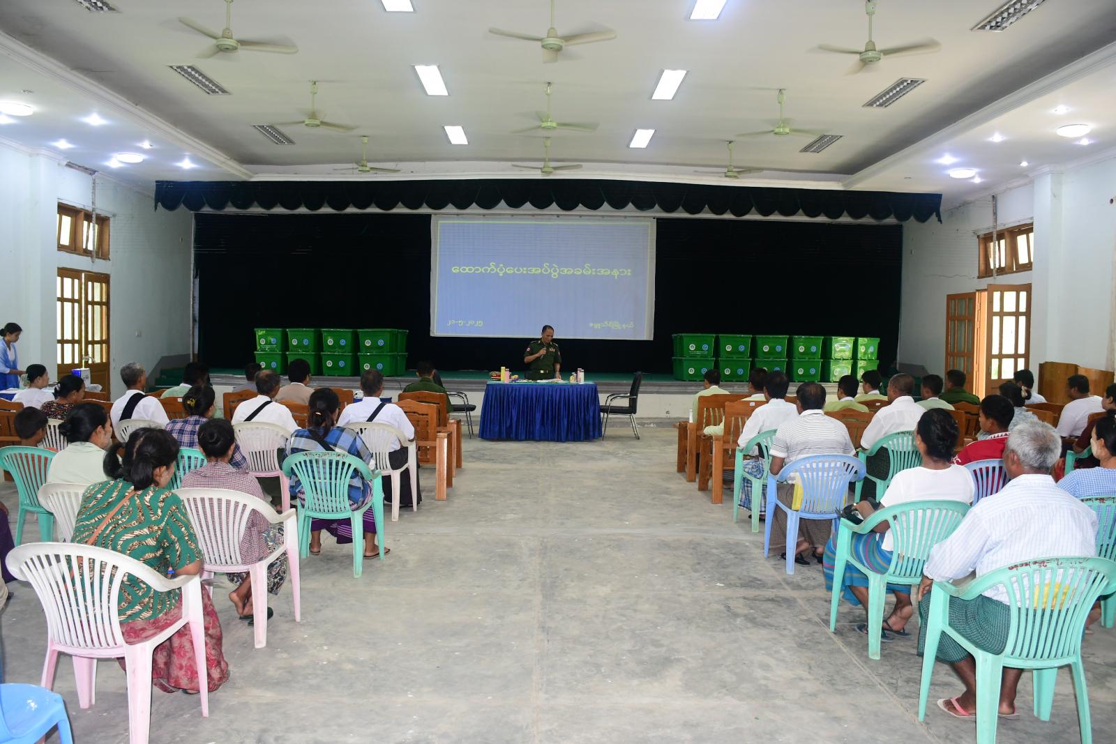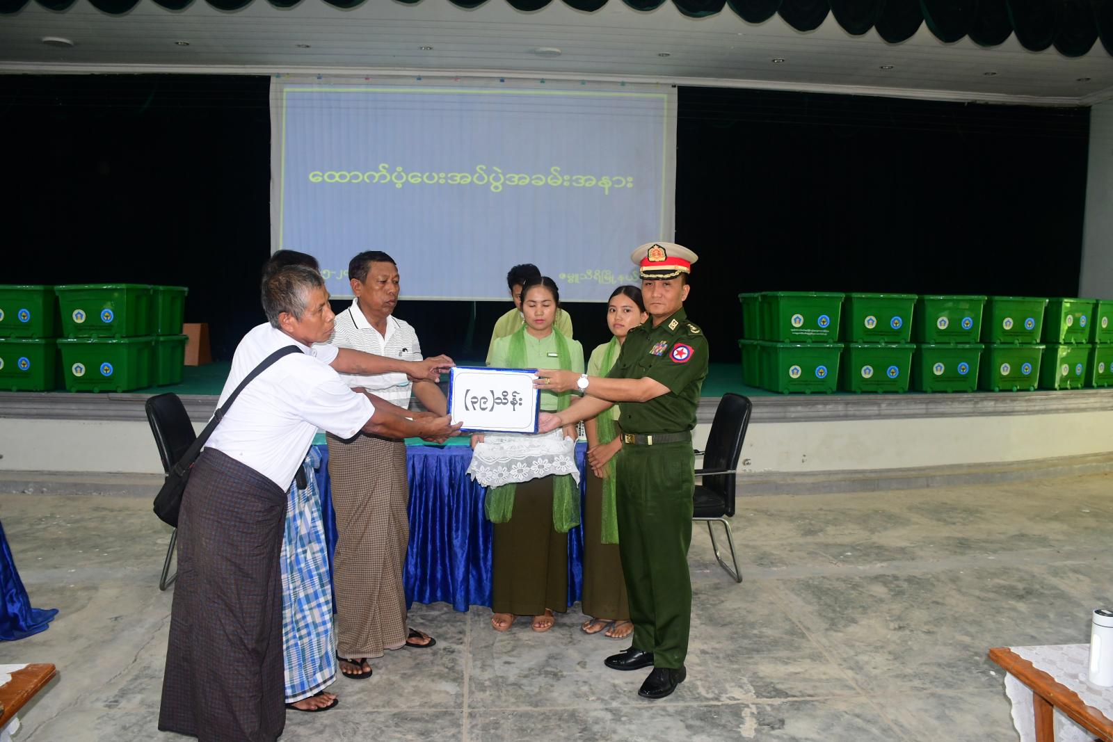 ယင်းနောက် နေပြည်တော်ကောင်စီဝင် ဗိုလ်မှူးကြီးရဲမိုးက ငလျင်ဘေးသင့်ပြည်သူများအား ကယ်ဆယ်ရေးပစ္စည်းပုံးများနှင့် ဘေးအန္တရာယ်ဆိုင်ရာစီမံခန့်ခွဲမှုဦးစီးဌာနမှ ထောက်ပံ့သည့် ထောက်ပံ့ငွေများကို ပေးအပ်ရာ ငလျင်ဘေးသင့်ပြည်သူများကိုယ်စား တာဝန်ရှိသူများက လက်ခံရယူခဲ့သည်။