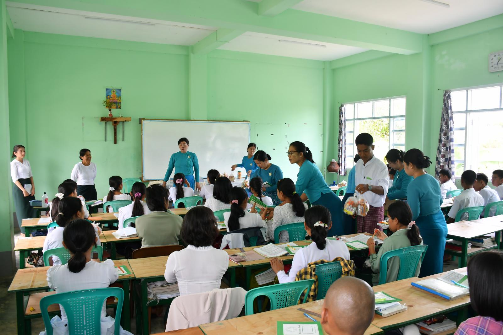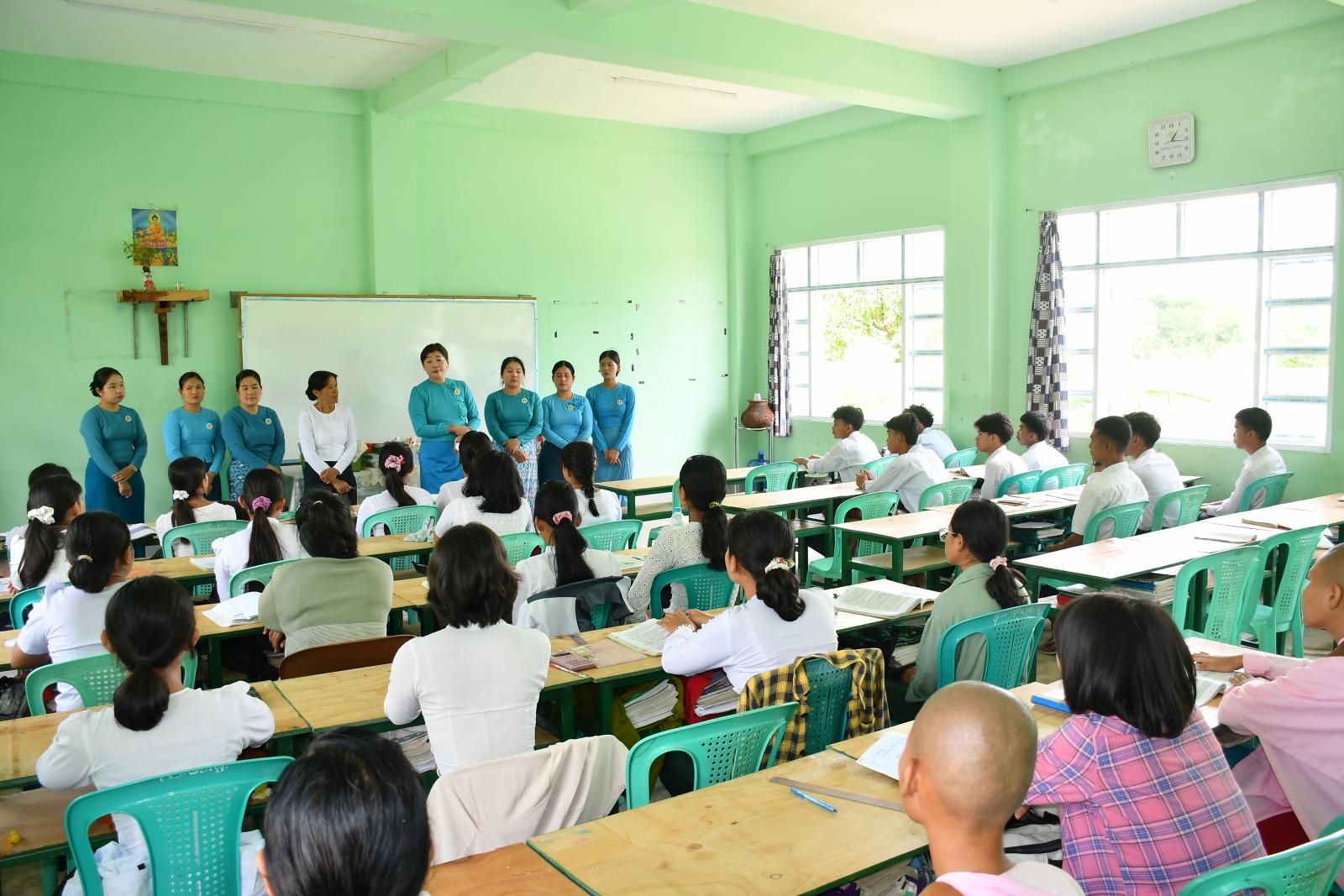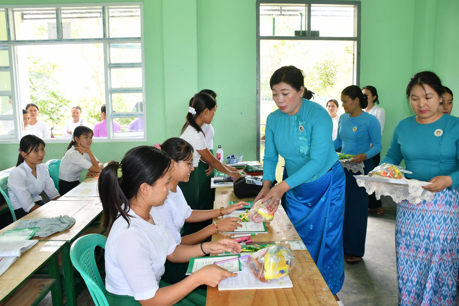 ဥတ္တရခရိုင် အမျိုးသမီးရေးရာအဖွဲ့ဥက္ကဋ္ဌနှင့် အဖွဲ့ဝင်များ၊ မြို့နယ်အမျိုးသမီးရေးရာအဖွဲ့ဝင်များ၊ ခရိုင်/မြို့နယ် မိခင်နှင့်ကလေးအဖွဲ့ဝင်များက ကျောင်းသား၊ ကျောင်းသူ(၇၂)ဦးအား စခန်းသွင်းလေ့ကျင့်သင်ကြားနေမှုနှင့် ကျောင်းအိပ်၊ ကျောင်းစားထားရှိမှု အခြေအနေများကိုကြည့်ရှုပြီး ဆရာ၊ ဆရာမများ၏ သင်ကြားမှုများကို စနစ်တကျလေ့လာ ကျက်မှတ်ရေး၊ စိတ်ဓာတ်တက်ကြွစွာဖြင့် အမှတ်ကောင်းရရှိအောင် ကြိုးစားဆောင်ရွက်ရေး၊ ကျန်းမာရေးဂရုစိုက် နေထိုင်ရေးစသည်တို့ကို ပြောကြားခဲ့ပြီး ရွှေဖီဦးလက်ဖက်ရည်ထုပ်များ၊ ခေါက်ဆွဲခြောက်၊ အချိုရည်၊ မုန့်မျိုးစုံ၊ ဗလာစာအုပ်၊ စာရေးကိရိယာပစ္စည်းများ ထောက်ပံ့ပေးအပ်ခဲ့ပါကြောင်း သိရသည်။