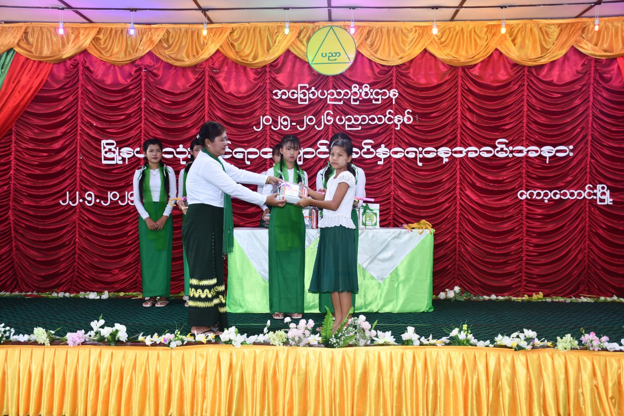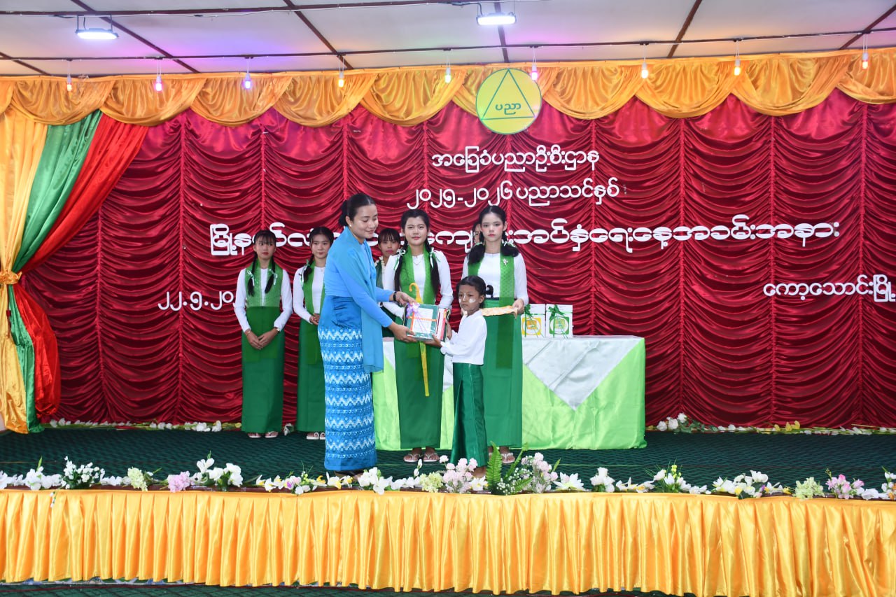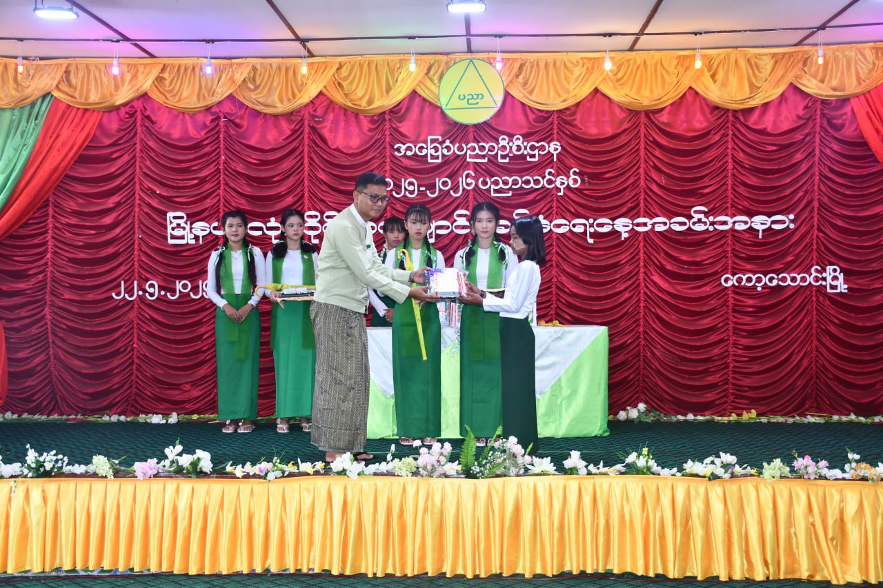 အဆိုပါအခမ်းအနားတွင် ခရိုင်စီမံအုပ်ချုပ်ရေးအဖွဲ့ဥက္ကဋ္ဌ ဦးစိုးအောင်မှ မြန်မာနိုင်ငံတော်ကြီးကို ခေတ်မှီဖွံ့ဖြိုးတိုးတက်သော နိုင်ငံတော်တစ်ရပ်တည်ဆောက်ရာမှာ ထူးချွန်တဲ့လူ့စွမ်းအား အရင်းအမြစ်ဖြစ်သော အသိ ပညာရှင်၊ အတတ်ပညာရှင်တွေ အများကြီးရှိရန် လိုအပ်ပါကြောင်း၊ အနာဂတ်နိုင်ငံတော်ကို တာဝန်ယူဆောင်ရွက်ကြရမည့် မျိုးဆက်သစ်လူငယ်များ အပါအဝင် တစ်နိုင်ငံလုံး၏ လူ့စွမ်းအားအရင်းအမြစ် ဖွံ့ဖြိုးတိုးတက်ရေးကိုလည်း အလေးထားအားပေး ဆောင်ရွက်ကြရမည် ဖြစ်ပါတယ်။ "ပညာရေးဖြင့်ခေတ်မှီဖွံ့ဖြိုးတိုးတက်သော နိုင်ငံတော်ကြီးတည်ဆောက်အံ့" ဟူသည့် ဆောင်ပုဒ်နဲ့အညီ အမျိုးသားပညာရည်မြင့်မားရေးကို အကောင် အထည်ဖော်ဆောင်ရွက်ကြရန် နိုင်ငံသားတိုင်းမှာ တာဝန်ရှိသည်ဟုခံယူကြရမည် ဖြစ်ကြောင်း၊ လက်ရှိတွင်မြန်မာနိုင်ငံပညာရေးစနစ် သင်ကြားသင်ယူမှုမြင့်မားလာပြီး ပညာရေးခေတ်မှီဖွံ့ဖြိုးတိုးတက်မြင့်မားစေရေးအတွက် နိုင်ငံတကာအဖွဲ့အစည်းများနှင့် ပူးပေါင်းခြင်း၊ အမျိုးသားမဟာဗျူဟာစီမံကိန်း NESPနှင့် ပညာရေးစေတနာရှင်များက ပူးပေါင်းဖြည့်ဆည်းဆောင်ရွက်ပေးလျက်ရှိကြောင်း၊ ကျောင်းနေရွယ်ကလေးများ ကျောင်းနေနိုင်ဖို့၊ ပညာသင်ယူနိုင်ဖို့ ပံ့ပိုးပေးခြင်းဖြင့် ရင်ဆိုင်နေရသည့် အမျိုးမျိုးသော စိန်ခေါ်မှုတွေကို တုံ့ပြန်အနိုင်ယူဖို့ လူ့စွမ်းအားအရင်းအမြစ်များကို စွမ်းကုန်ဖွံ့ဖြိုးအောင် ဆောင်ရွက်ဖြစ်ပါကြောင်းအမှာစကား ပြောကြားခဲ့သည်။