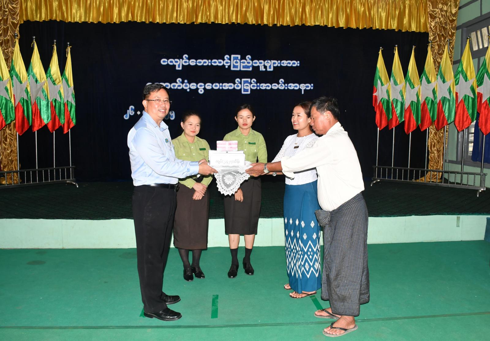 အဆိုပါ အခမ်းအနားသို့ နေပြည်တော်ကောင်စီဝင် ဦးဇေယျာလင်း၊ မြို့နယ်စီမံအုပ်ချုပ်ရေးအဖွဲ့ ဥက္ကဋ္ဌ ဦးအောင်သူနှင့်အဖွဲ့ဝင်များနှင့် မြို့နယ်အဆင့်ဌာနဆိုင်ရာဝန်ထမ်းများ၊ ရပ်ကွက်အုပ်ချုပ်ရေးမှူးများ၊ မြို့နယ်အမျိုးသမီးရေးရာအဖွဲ့ဝင်များ၊ မြို့နယ်မိခင်နှင့်ကလေး စောင့်ရှောက်ရေး အသင်းဝင်များ၊ ရပ်မိ/ရပ်ဖများ၊ ငလျင်ဘေးသင့် ပြည်သူများ တက်ရောက်ခဲ့ပြီး နေပြည်တော်ကောင်စီဝင် ဦးဇေယျာလင်းက ငလျင်ဘေးသင့်ပြည်သူများအတွက် ထောက်ပံ့ပေးအပ်ခြင်းနှင့် အားပေးစကားပြောကြား၍လည်းကောင်း၊ တောင်သူများ သီးနှံစိုက်ပျိုးရေးတွင် သဘာဝမြေဩဇာအသုံးပြု စိုက်ပျိုးနိုင်ရေး၊ တောင်သူ သီးနှံထွက်ကုန်များ ကုန်ကြမ်းအဆင့်မှ ကုန်ချောအဆင့် ပြောင်းလဲထုတ်လုပ်ရောင်းချနိုင်ရေး၊ အသေးစား၊ အငယ်စား၊ အလတ်စား (MSME) လုပ်ငန်းအောင်မြင်ရေး၊ မြိုနယ်ကုန်စည်ဒိုင်ဖွင့်လှစ်မှုကြောင့် စိုက်ပျိုးရေးတောင်သူများ ရရှိမည့်အကျိုးကျေးဇူးများနှင့် ကျောင်းသား၊ ကျောင်းသူများ ကျောင်းအပ်နိုင်ရေး ရှင်းလင်းပြောကြားခဲ့ပြီးနောက် နေပြည်တော်ကောင်စီဝင်နှင့် ခရိုင်စီမံအုပ်ချုပ်ရေးအဖွဲ့ဥက္ကဋ္ဌ ဦးမြတ်အောင်ဋ္ဌေးတို့က ငလျင်ဘေးသင့်စာရင်းကောက်ယူရေးအဖွဲ့ ခေါင်းဆောင်များထံ ငလျင်ဘေးသင့် ပြိုကျပျက်စီးနေအိမ် (၁၅၇) လုံး၊ တစ်စိတ် တစ်ပိုင်းပျက်စီးနေအိမ် (၂၇၄၅) လုံး၊ စုစုပေါင်းလူဦးရေ ကျား/ မ (၁၃၈၀၉) ဦးအတွက် လူတစ်ဦးလျှင် ထောက်ပံ့ငွေ (၇၀,၀၀၀) ကျပ်နှုန်း၊ စုစုပေါင်းငွေကျပ် (၉၆၆,၆၃၀,၀၀၀) ကျပ် ထောက်ပံ့ငွေများ ပေးအပ်ခဲ့ပြီး ငလျင်ဘေးသင့် ပြည်သူများ၏ ကိုယ်စား ဒေါ်ခင်မာရီက ကျေးဇူးတင်စကား ပြန်လည်ပြောကြားခဲ့သည်။
