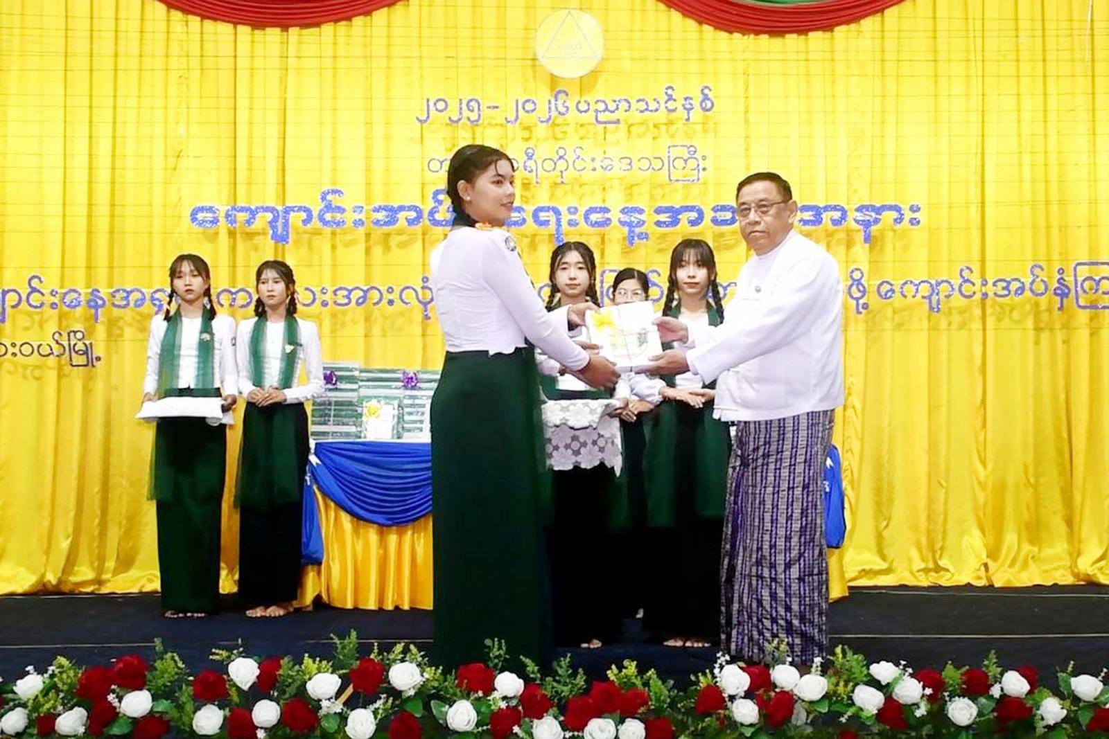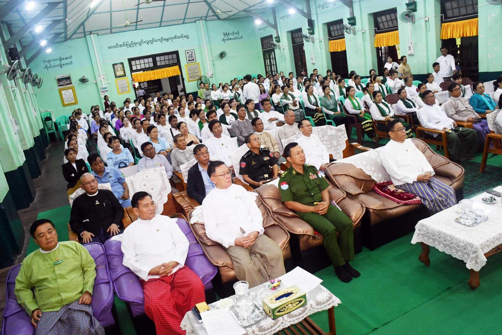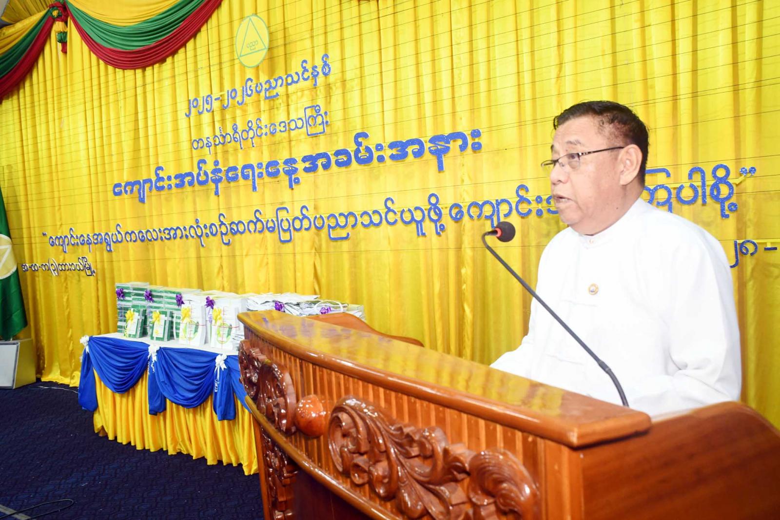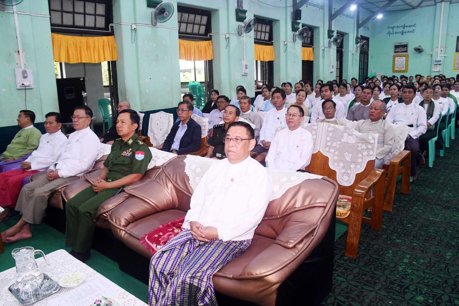 ထို့နောက် တိုင်းဒေသကြီးပညာရေးညွှန်ကြားရေးမှူး ဦးဝင်းနောင်က ကျောင်းအပ်နှံရေးနှင့် ပတ်သက်၍ ရှင်းလင်းတင်ပြပြီး တိုင်းဒေသကြီးဝန်ကြီးချုပ်၊ တိုင်းဒေသကြီး တရားလွှတ်တော်တရားသူကြီးချုပ် တိုင်းဒေသကြီးလုံခြုံရေးနှင့် နယ်စပ်ရေးရာဝန်ကြီးတို့က ပညာရေးဝန်ကြီးဌာနက ထောက်ပံ့သည့် မူလတန်း၊ အလယ်တန်းနှင့်အထက်တန်းအဆင့်အတွက် ကျောင်းသုံးပုံနှိပ်စာအုပ်များနှင့် ဗလာစာအုပ်များ၊ မူလတန်းအဆင့်အတွက် ကျောင်းဝတ်စုံများ ပေးအပ်သည်။