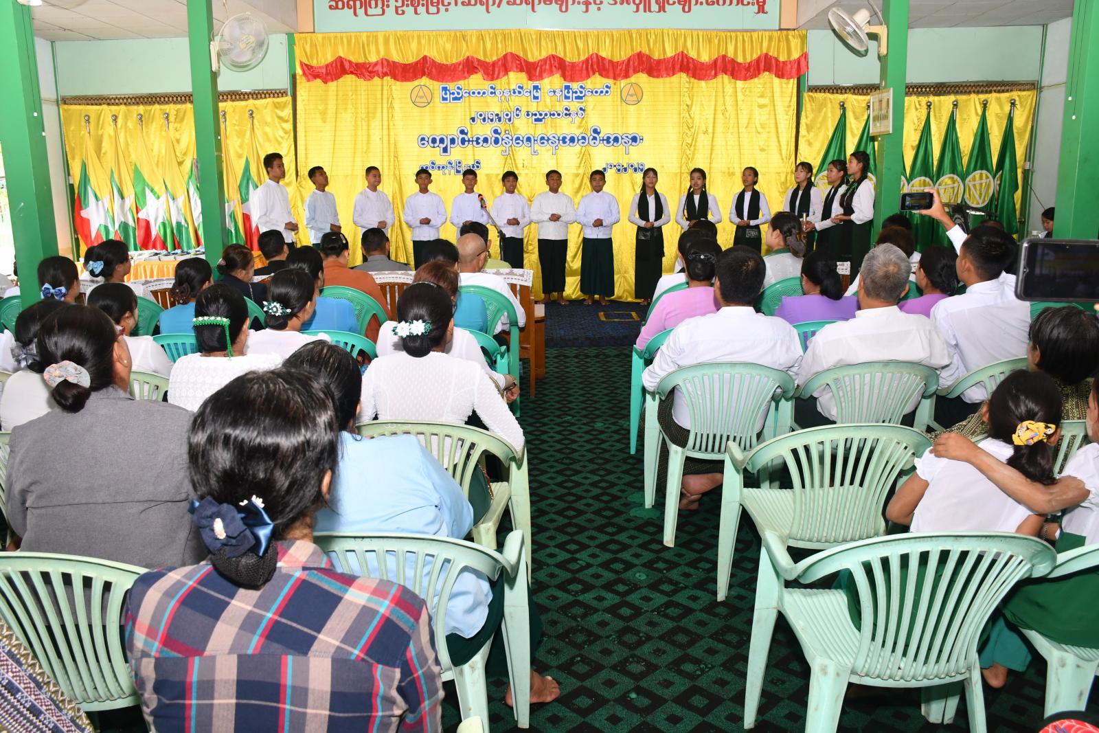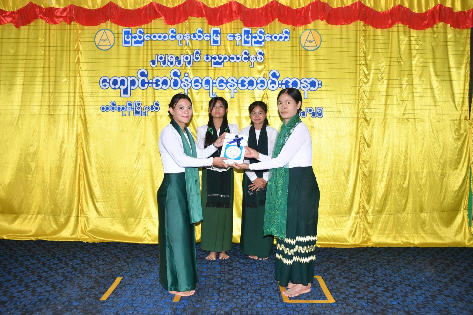 ထို့နောက် ခရိုင်ပညာရေးမှူး၊ မြို့နယ်စီမံအုပ်ချုပ်ရေးအဖွဲ့ဥက္ကဋ္ဌ၊ မြို့နယ်ပညာရေးမှူး ဒေါ်သီသီကြိုင်တို့က နိုင်ငံတော်မှ(အခမဲ့)ဖြန့်ဝေသော ပုံနှိပ်၊ ဗလာစာအုပ်၊ ခဲတံ၊ ဘောပင်များနှင့် ကျောင်းဝတ်စုံများအား ပေးအပ်ရာ ကျောင်းအုပ် ဆရာ/ဆရာမကြီးများက လက်ခံရယူခဲ့ပြီး အမှတ်(၁)အခြေခံပညာအထက်တန်းကျောင်းမှ ကျောင်းသား၊ ကျောင်းသူများက “ဇာတိမာန်” သီချင်းသီဆို၍ အခမ်းအနားကို အောင်မြင်စွာကျင်းပခဲ့သည်။