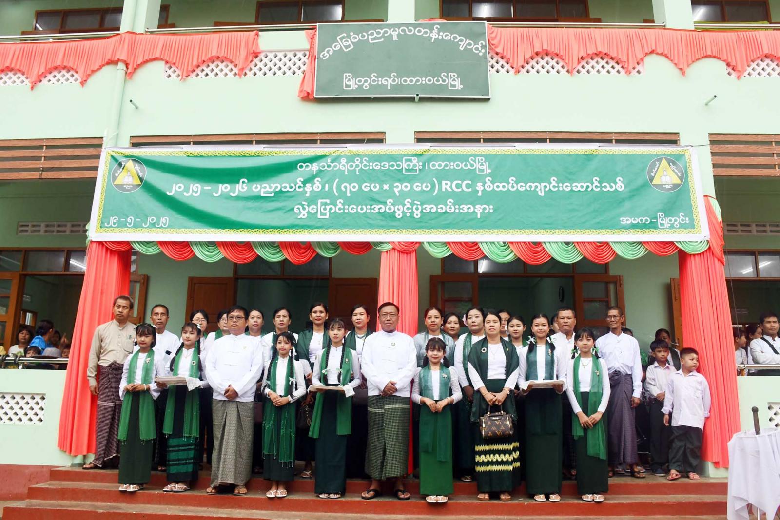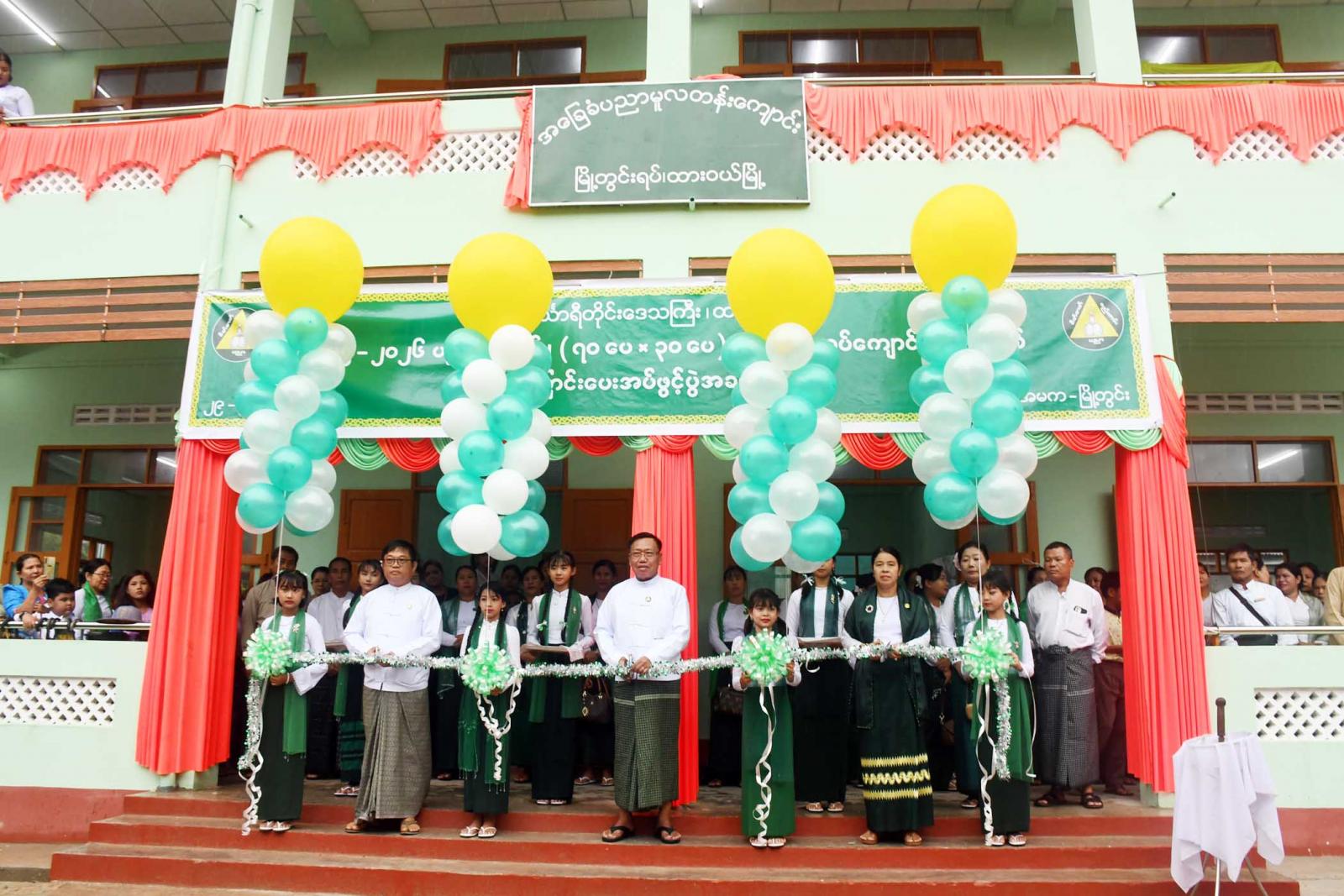 ရှေးဦးစွာ တိုင်းဒေသကြီးပညာရေးညွှန်ကြားရေးမှူး ဦးဝင်းနောင်၊ ခရိုင်ပညာရေးမှူးဦးဆန်းဦး၊ မြို့နယ်ပညာရေးမှူး ဒေါ်ခင်မေသိန်းတို့က ကျောင်းဆောင်သစ်အား ဖဲကြိုးဖြတ်ဖွင့်လှစ်ပေးပြီး စုပေါင်းမှတ်တမ်းဓာတ်ပုံ ရိုက်ကူးကြသည်။