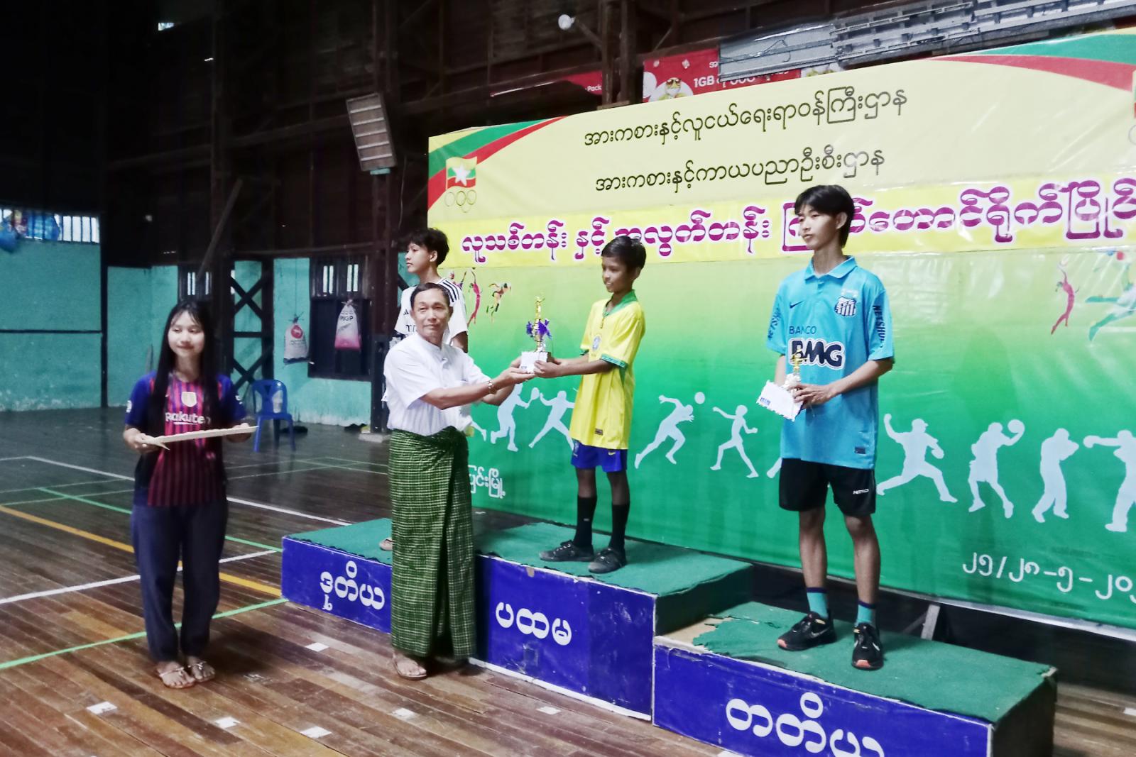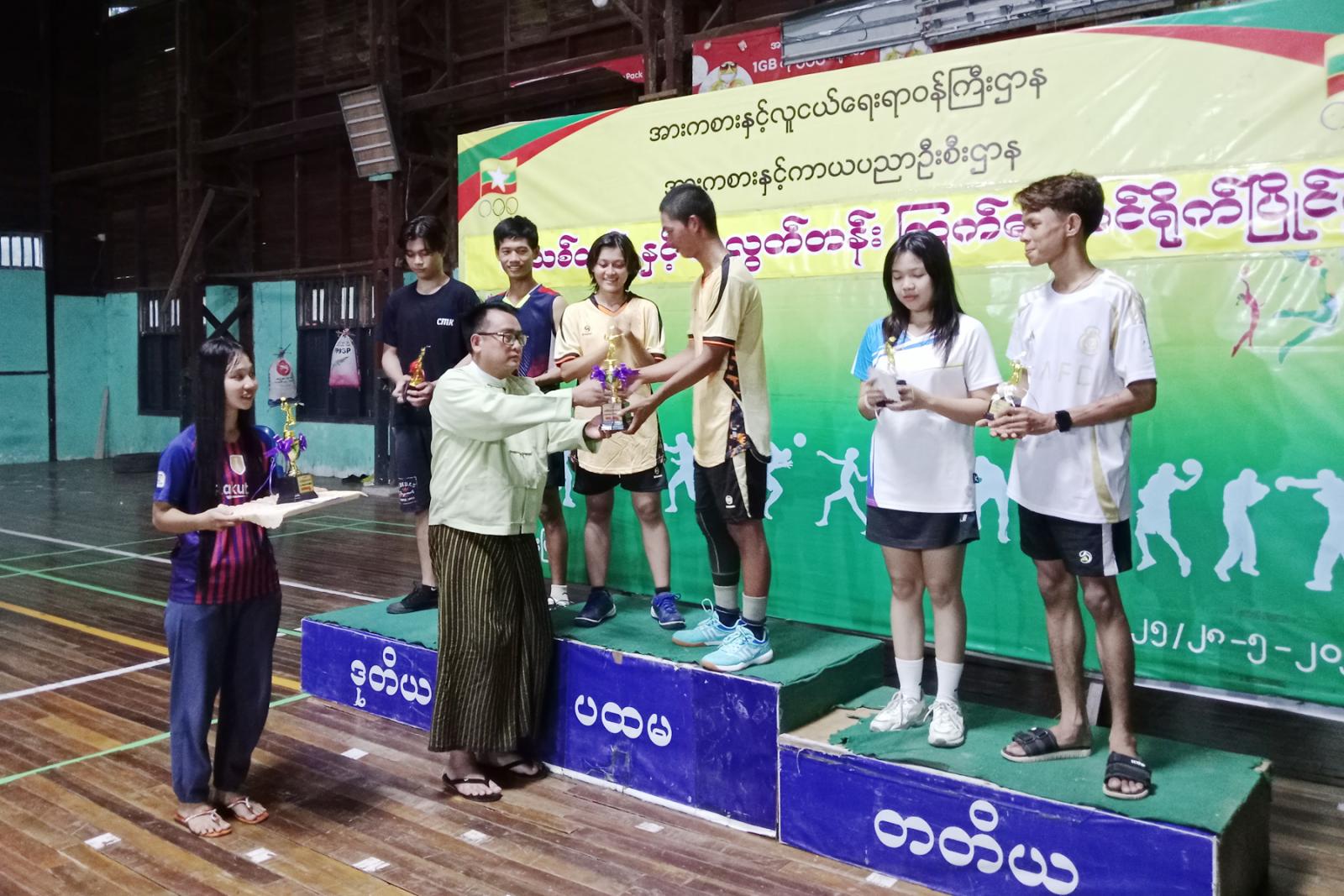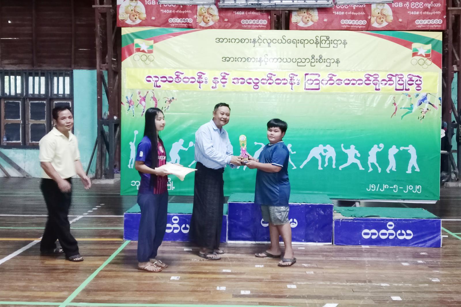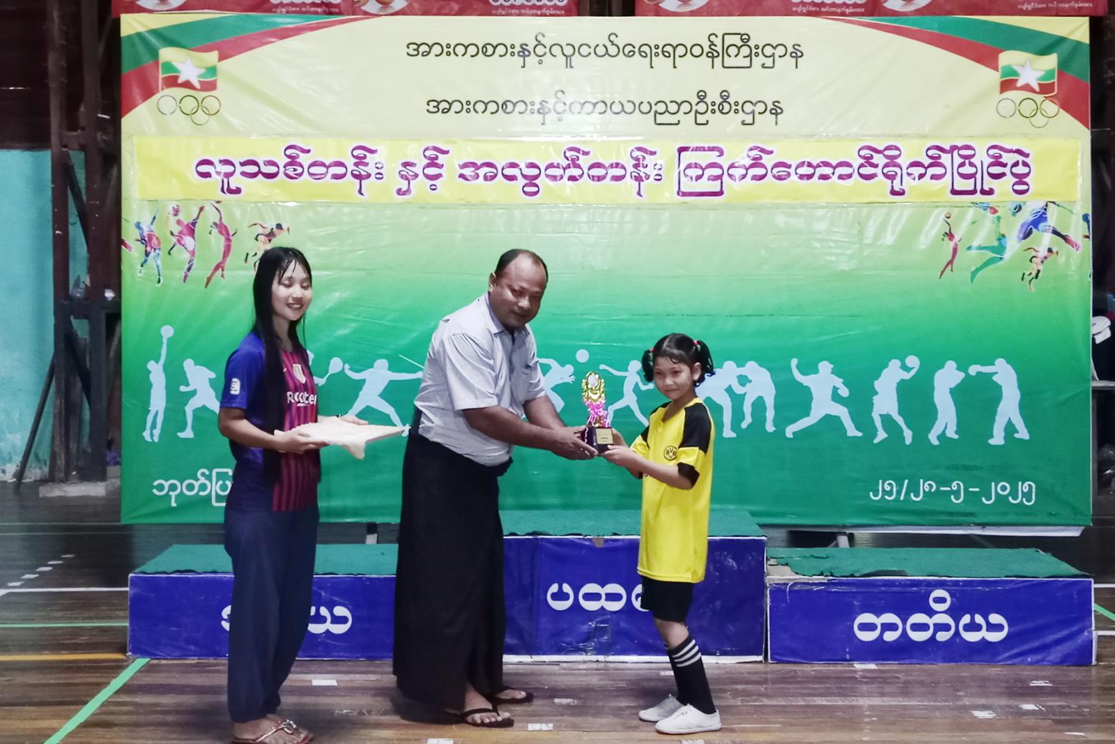 ဆက်လက်၍ ဆုချီးမြှင့်ကိုကျင်းပရာ ပြိုင်ပွဲအသီးသီးတွင်အနိုင်ရဗိုလ်စွဲခဲ့သည့် အားကစားသမားများကို ပြိုင်ပွဲများအလိုက် ပထမ၊ဒုတိယ၊တတိယဆုရရှိသည့် အားကစားသမားများနှင့်အကောင်းဆုံအားကစားသမားဆုရရှိသူများကို မြို့နယ်စီမံအုပ်ချုပ်ရေး အဖွဲ့ဥက္ကဋ္ဌဦးညီညီနှင့်တာဝန်ရှိသူများက ဆုများအသီးသီးပေး အပ်ချီးမြှင့်ခဲ့ကြကြောင်းသိရသည်။