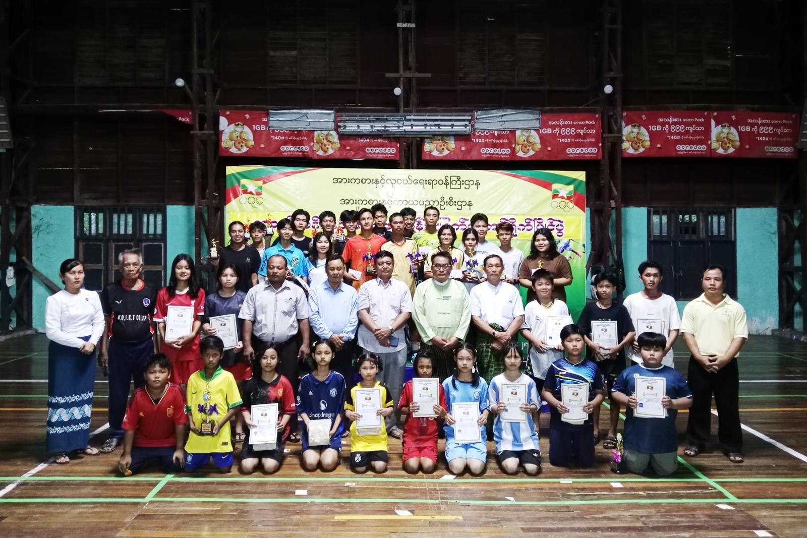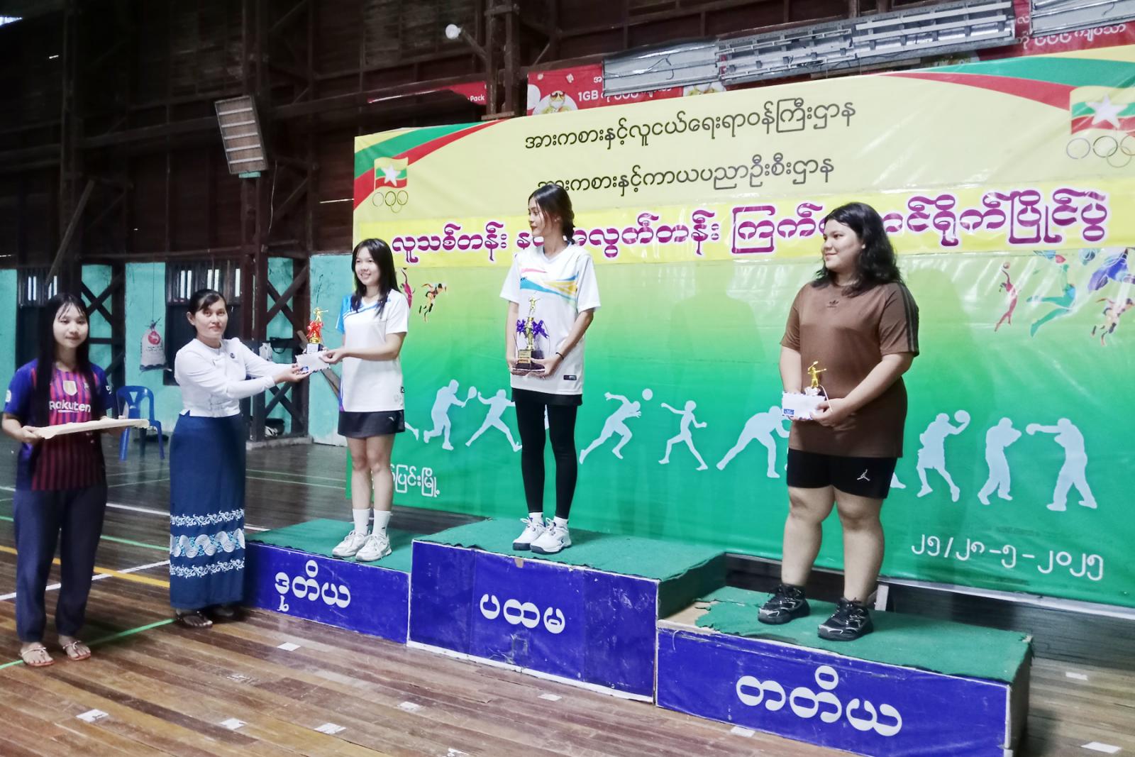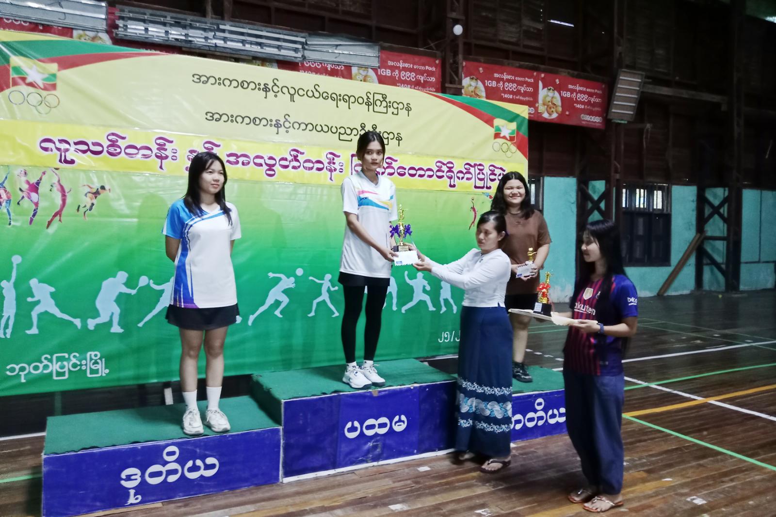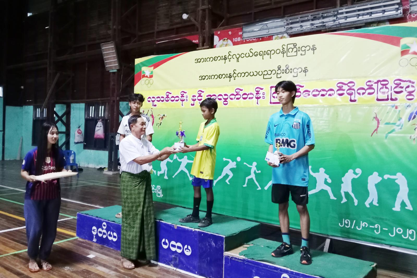 ဆက်လက်၍ ဆုချီးမြှင့်ကိုကျင်းပရာ ပြိုင်ပွဲအသီးသီးတွင်အနိုင်ရဗိုလ်စွဲခဲ့သည့် အားကစားသမားများကို ပြိုင်ပွဲများအလိုက် ပထမ၊ဒုတိယ၊တတိယဆုရရှိသည့် အားကစားသမားများနှင့်အကောင်းဆုံအားကစားသမားဆုရရှိသူများကို မြို့နယ်စီမံအုပ်ချုပ်ရေး အဖွဲ့ဥက္ကဋ္ဌဦးညီညီနှင့်တာဝန်ရှိသူများက ဆုများအသီးသီးပေး အပ်ချီးမြှင့်ခဲ့ကြကြောင်းသိရသည်။