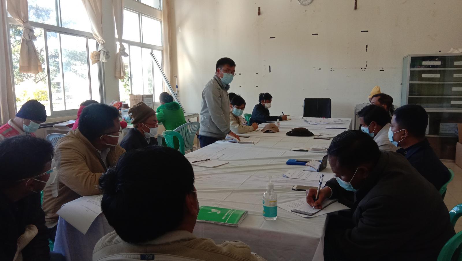 ရှမ်းပြည်နယ် ပလောင်ကိုယ်ပိုင်အုပ်ချုပ်ခွင့်ရဒေသ နမ့်ဆန်မြို့နယ်အတွင်း ကိုဗစ်-၁၉ ရောဂါ ကူးစက်ပျံ့နှံ့မှုကို ကာကွယ်ထိန်းချုပ်ရေးအတွက် ရှေ့ဆက်ဆောင်ရွက်ရမည့် လုပ်ငန်းများအား မြို့နယ် ကိုဗစ်-၁၉ ကာကွယ်ထိန်းချုပ်ကုသရေးကော်မတီတို့က ယမန်နေ့မွန်းလွဲ (၂)နာရီတွင် မြို့နယ်ပြည်သူ့ဆေးရုံ၌ ပြုလုပ်သည်။