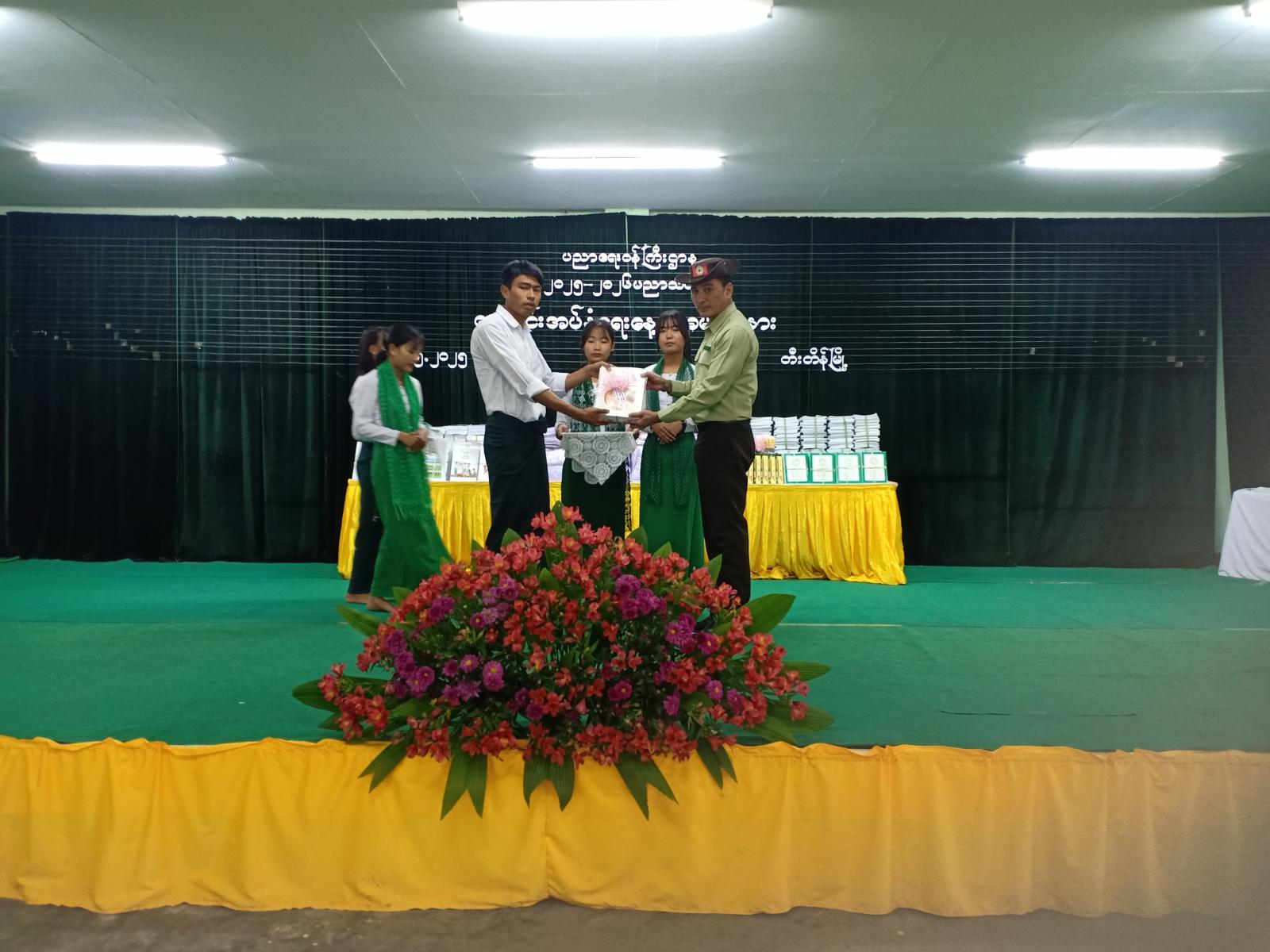 ဆက်လက်၍ ခရိုင်ပညာရေးရုံးမှ လက်ထောက်ညွှန်ကြားရေးမှူး ဒေါ်မန်းဂိုးကျိန်က ကျောင်းအပ်နှံရေးနေ့ အခမ်းအနားကျင်းပရခြင်းအကြောင်း ရှင်းလင်းတင်ပြီး တာဝန်ရှိသူများက ပညာရေးဌာနမှ အခမဲ့ပေးအပ်သောကျောင်းသုံးပုံနှိပ်စာအုပ်၊ ဗလာစာအုပ်၊ စာရေးကိရိယာများနှင့် ကျောင်းဝတ်စုံတို့အား ကျောင်းသား၊ကျောင်းသူများထံပေးအပ်ကြသည်။