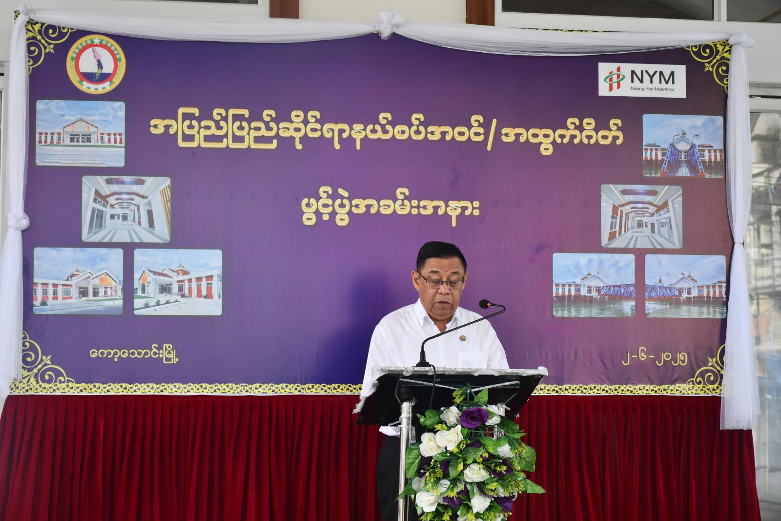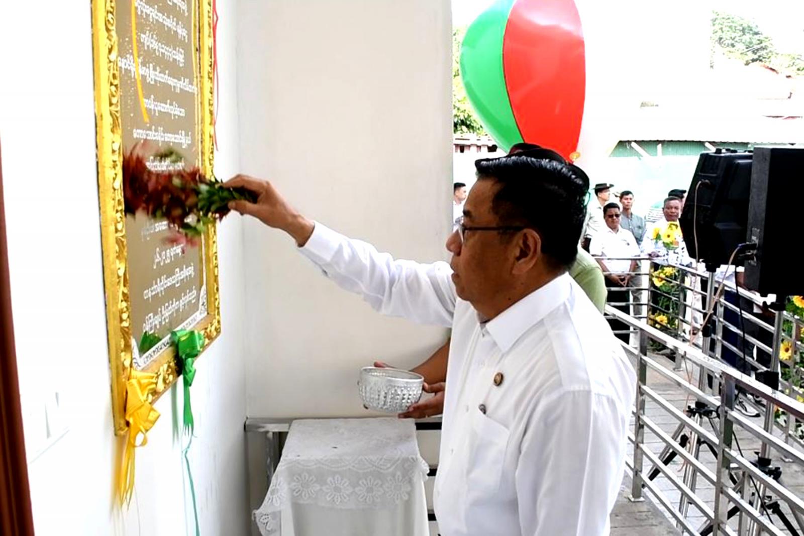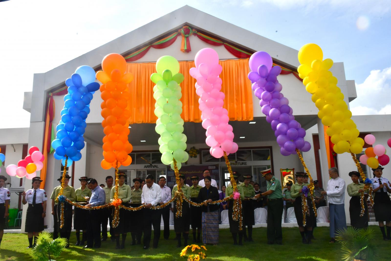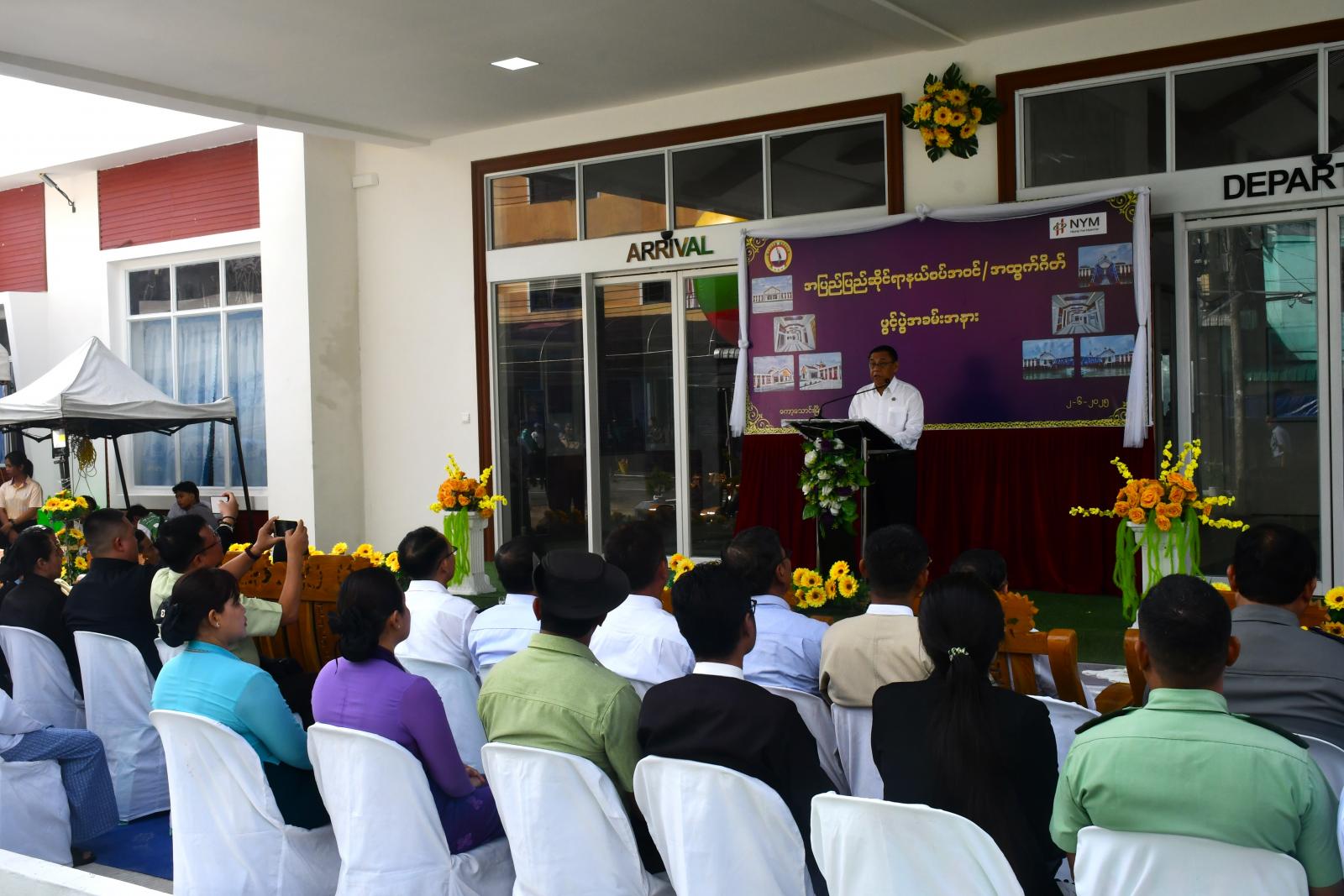 အဆောက်အဦသစ်အား တိုင်းဒေသကြီးဝန်ကြီးချုပ် ဦးမြတ်ကို၊ တိုင်းဒေသကြီးတရားသူကြီးချုပ်၊ တိုင်းဒေသကြီး ဝန်ကြီးများနှင့်တာဝန်ရှိသူများက ဖဲကြိုးဖြတ်ဖွင့်လှစ်ပေးကြပြီး တိုင်းဒေသကြီးဝန်ကြီးချုပ် ဦးမြတ်ကိုက အပြည်ပြည်ဆိုင်ရာနယ်စပ်ဝင်/ထွက်ပေါက်ဂိတ် အဆောက်အဦသစ် ဆိုင်းဘုတ်အား စက်ခလုတ်နှိပ်၍ ဖွင့်လှစ်ပေးသည်။