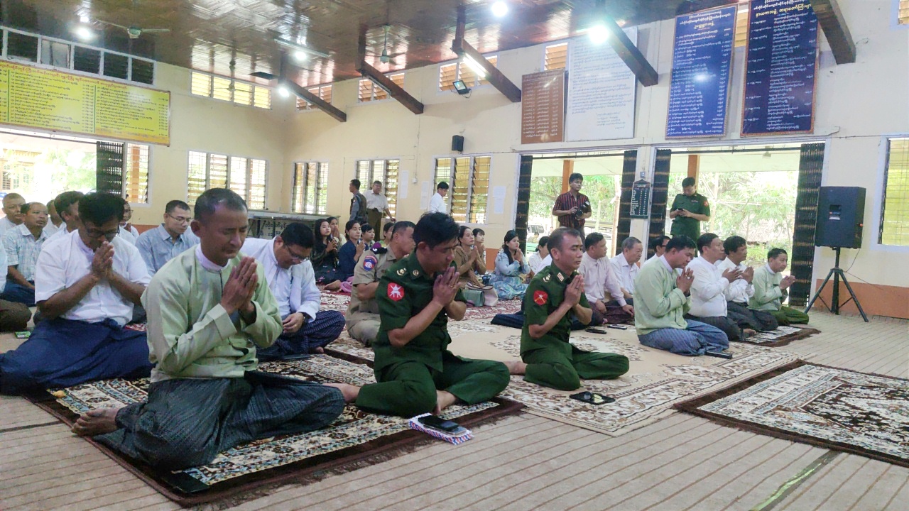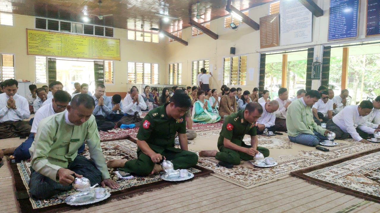 ဆက်လက်၍ ခရိုင်စီမံအုပ်ချုပ်ရေးအဖွဲ့ဥက္ကဋ္ဌ ဦးသောင်းတင်ထွေး၊ အမှတ်(၅) စစ်အုပ်ချုပ်ရေးနယ်မြေစစ်နယ်မြေမှူး၊ ခရိုင်စီမံအုပ်ချုပ်ရေးအဖွဲ့ဝင်များ၊ မြို့နယ်စီမံအုပ်ချုပ်ရေး အဖွဲ့ဥက္ကဋ္ဌ ဦးကျော်နိုင်၊ ခရိုင်/မြို့နယ်အဆင့်ဌာနဆိုင်ရာအကြီးအကဲများ၊ မြို့မိမြို့ဖများမှ လှူဖွယ်ဝတ္တုပစ္စည်းများ ဆက်ကပ်လှူဒါန်းခဲ့ကြပြီးနောက်ကျောင်းထိုင်းဘုန်းကြီး သင်တန်းကျောင်း နာယကအဖွဲ့ ဥက္ကဋ္ဌ ဆရာတော် ဘဒ္ဒန္တဣန္ဒာဝုဓမှ ဩဝါဒကထာ မိန့်ကြားချီးမြှင့်ခဲ့ပြီး သင်တန်းဆင်းလက်မှတ်များကို ဆက်ကပ်ပေးအပ်ခဲ့ကြောင်း သိရသည်။
