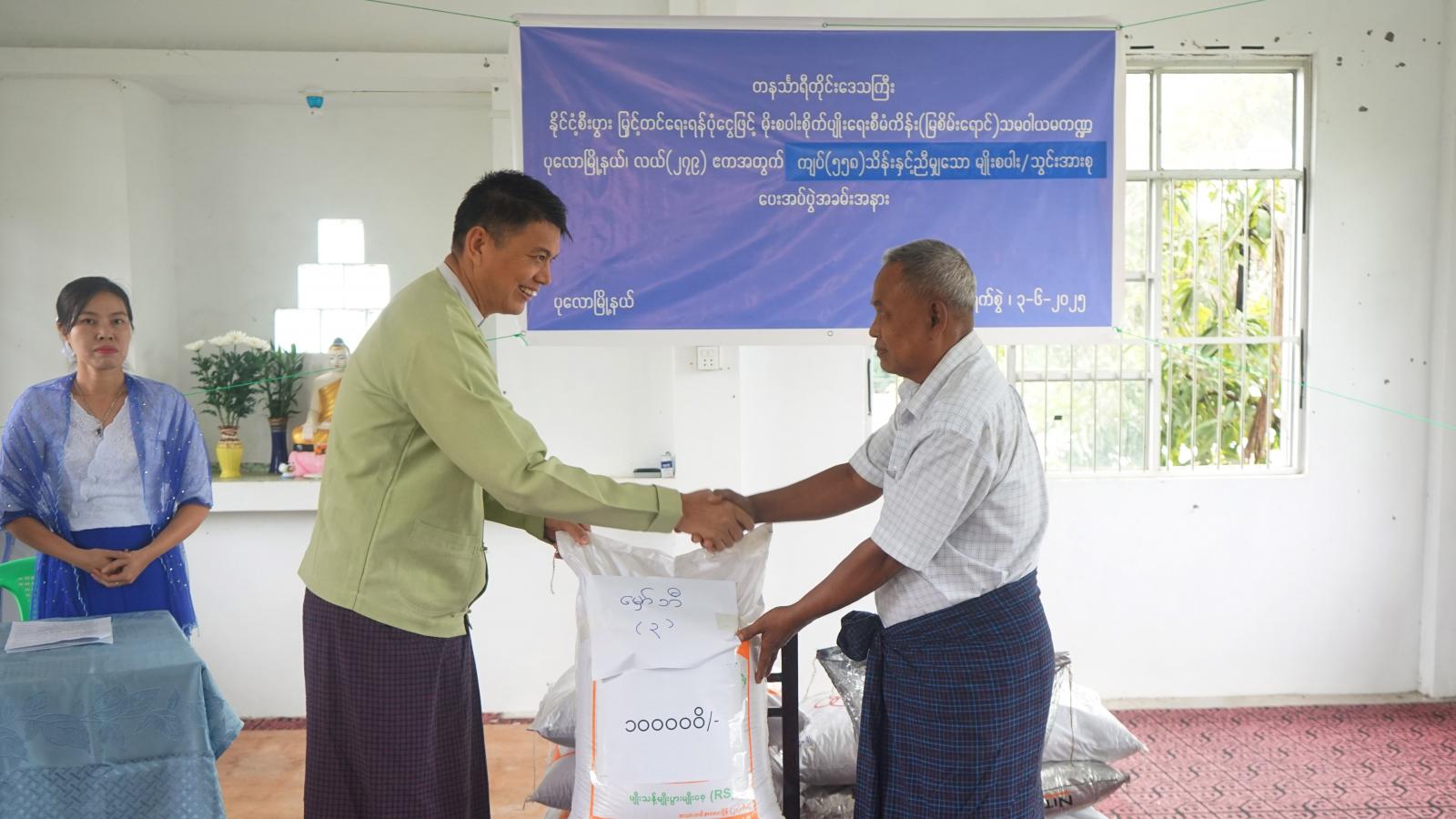 တနင်္သာရီတိုင်းဒေသကြီး၊ ပုလောမြို့နယ်၌ နိုင်ငံစီးပွားမြှင့်တင်ရေးရန်ပုံငွေဖြင့် မိုးစပါးစိုက်ပျိုးရေး စီမံကိန်း(မြစိမ်းရောင်) သမဝါယမကဏ္ဍ တောင်သူများအား မျိုးစပါးသွင်းအားစု မတည်ငွေ ပေးအပ်ပွဲကို ဇွန်လ ၃ ရက်နေ့ နံနက် ၁၀ နာရီက မြို့နယ်သမဝါယမဦးစီးဌာန၌ ကျင်းပပြုလုပ်ခဲ့သည်။