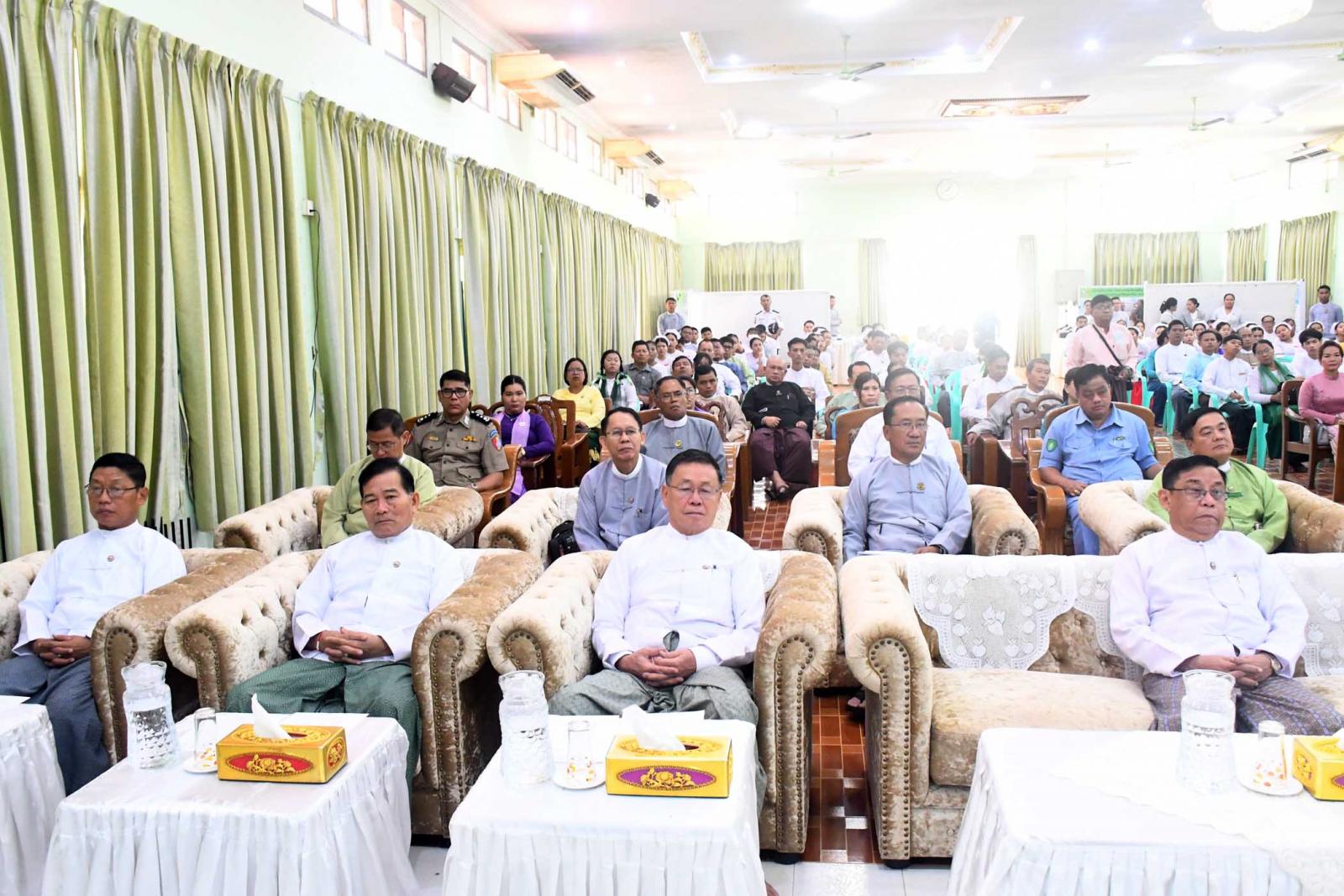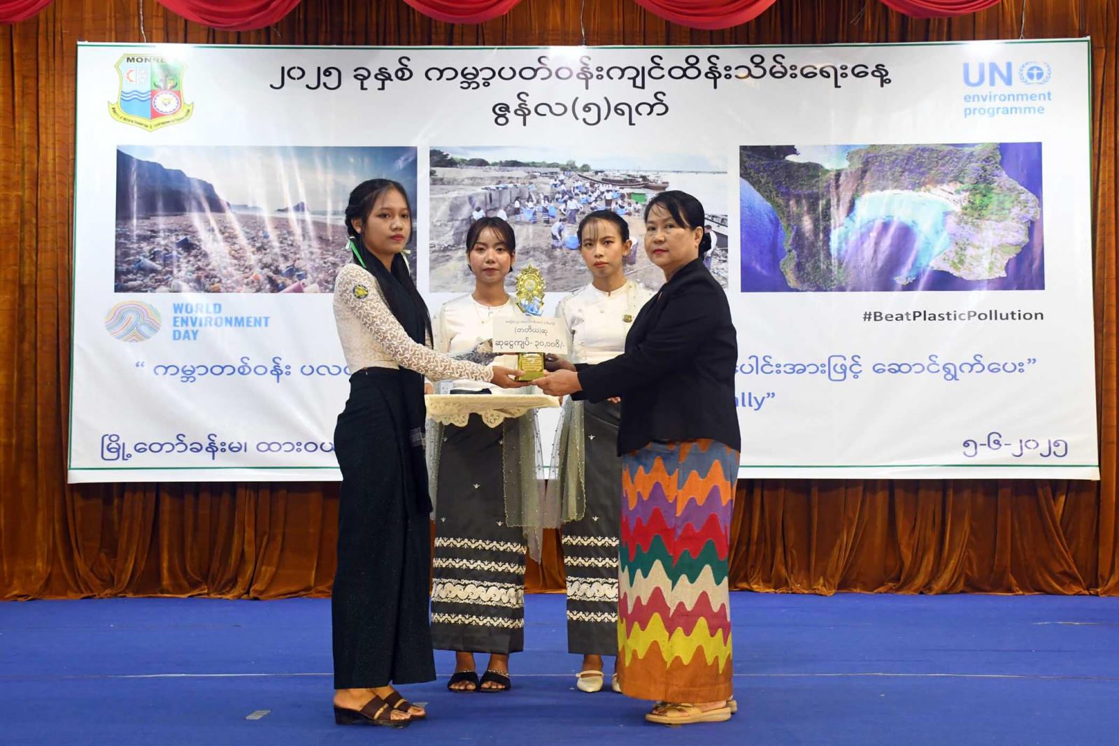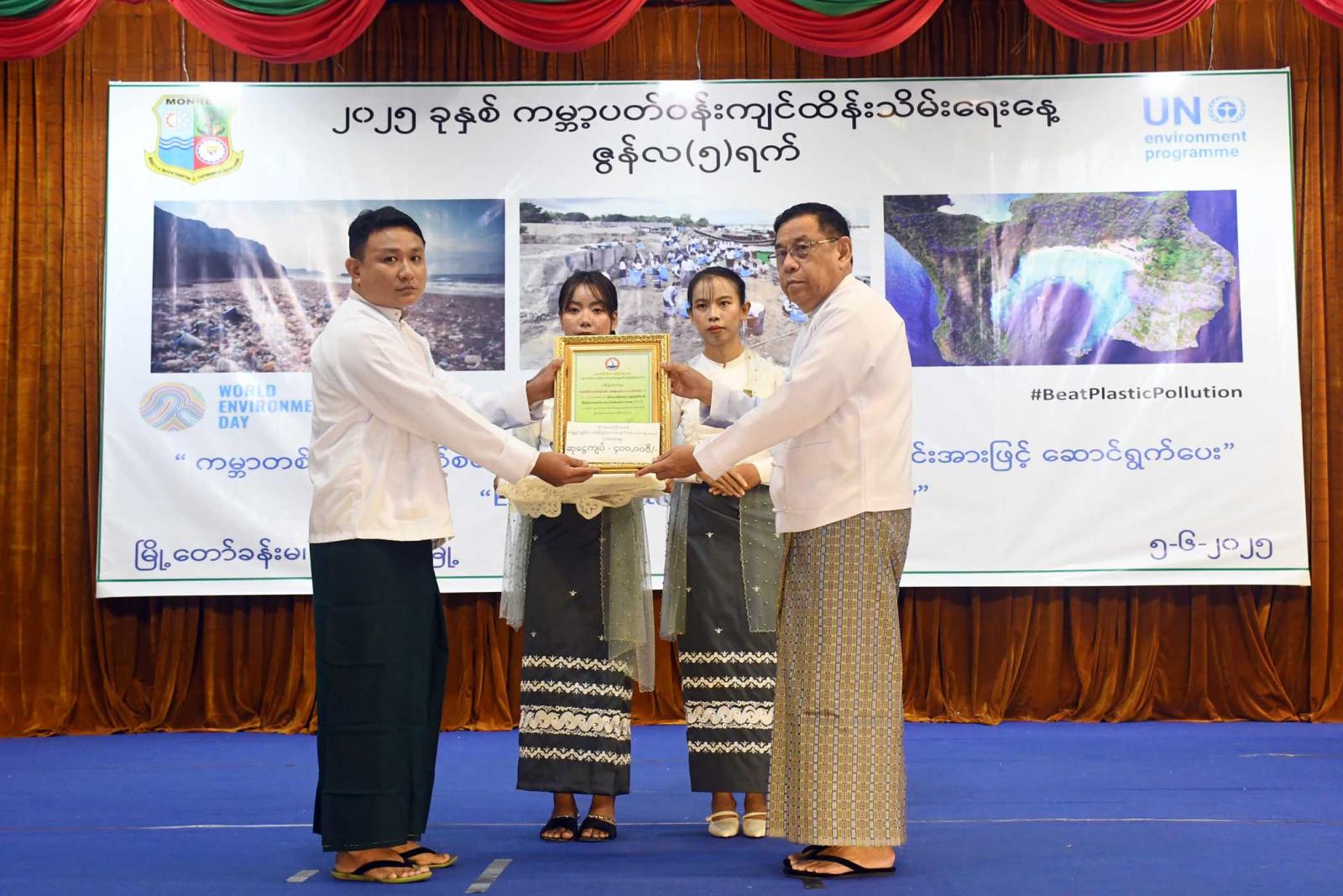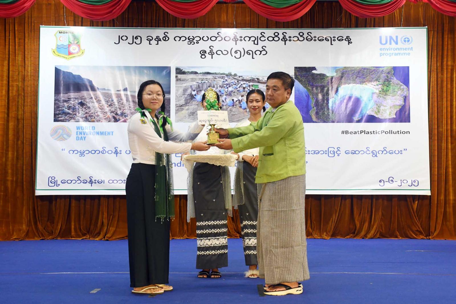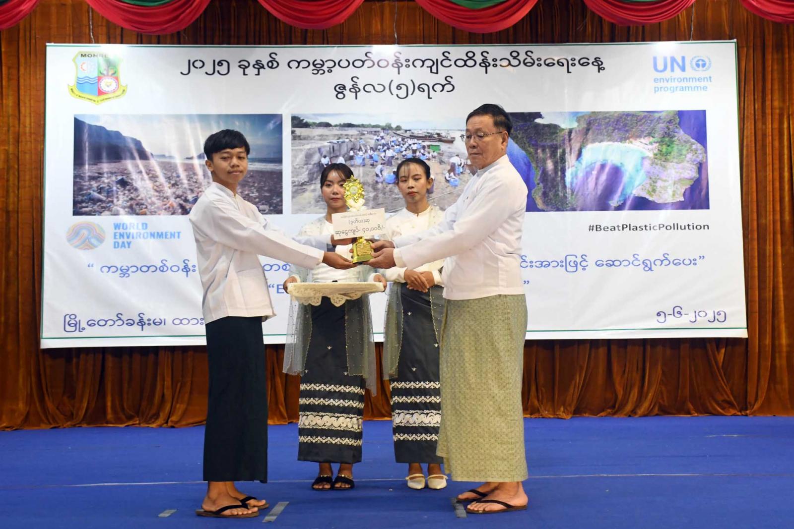 ဆက်လက်၍ တိုင်းဒေသကြီးဝန်ကြီးချုပ်၊ တိုင်းဒေသကြီးတရားလွှတ်တော်တရားသူကြီးချုပ်နှင့် တာဝန်ရှိသူများက ပတ်ဝန်းကျင်စီမံခန့်ခွဲမှုကောင်းမွန်သော နေရာဒေသ(စံပြကျေးရွာ)ဆုနှင့် အခြေခံပညာအထက်တန်းအဆင့်၊ အလယ်တန်းအဆင့်၊ မူလတန်းအဆင့် သန့်ရှင်း၍စိမ်းလန်းစိုပြည်သောကျောင်းဆု ရရှိသည့်ကျောင်းများနှင့်ကမ္ဘာ့ပတ်ဝန်းကျင်ထိန်းသိမ်းရေးနေ့ အထိမ်းအမှတ် အခြေခံပညာအထက်တန်းအဆင့်၊ အလယ်တန်းအဆင့် စာစီစာကုံးပြိုင်ပွဲနှင့် သရုပ်ဖော်ပန်းချီ ပြိုင်ပွဲတို့တွင် ဆုရရှိသူများအား ဆုများချီးမြှင့်ပြီး စုပေါင်းမှတ်တမ်းတင်ဓာတ်ပုံရိုက်ကူးကာ ကမ္ဘာ့ပတ်ဝန်းကျင်ထိန်းသိမ်းရေးနေ့ အထိမ်းအမှတ်ပြခန်းများအား လှည့်လည်ကြည့်ရှုအားပေးကြကြောင်း သိရသည်။