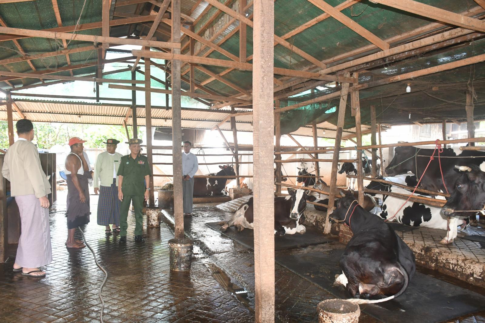 နေပြည်တော်ကောင်စီဝင်ဗိုလ်မှူးကြီးရဲမိုးသည် တာဝန်ရှိသူများနှင့်အတူ ယမန်နေ့နံနက်ပိုင်းက ပျဉ်းမနားမြို့နယ်၊ ကင်ပွန်းတန်းအုပ်စု၊ တပ်ပိုးကျေးရွာရှိ ဦးသိန်းဆိုင် နို့စားနွားမွေးမြူရေးခြံသို့ ရောက်ရှိကြရာ တာဝန်ရှိသူများက လုပ်ငန်းဆောင်ရွက်နေမှုအခြေအနေများ၊ နို့စားနွားများ မွေးမြူထားရှိမှု၊ နွားသားပေါက်များ မွေးမြူထားရှိမှုနှင့် နေ့စဉ်နို့ထုတ်လုပ်ရရှိမှုအခြေအနေများအား ရှင်းလင်းတင်ပြခဲ့သည်။