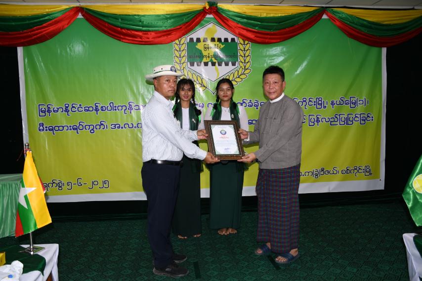 ဆက်လက်ပြီး စစ်ကိုင်းတိုင်းဒေသကြီးအစိုးရအဖွဲ့ လူမှုရေးရာဝန်ကြီး ဦးညွန့်ဝင်းအောင်က မြန်မာနိုင်ငံဆန်စပါးကုန်သည်များအသင်းဥက္ကဋ္ဌ ဦးအောင်မြင့်အား ဂုဏ်ပြုမှတ်တမ်းလွှာ ပေးအပ်ပြီး ကျေးဇူးတင်စကား ပြန်လည်ပြောကြားခဲ့သည်။