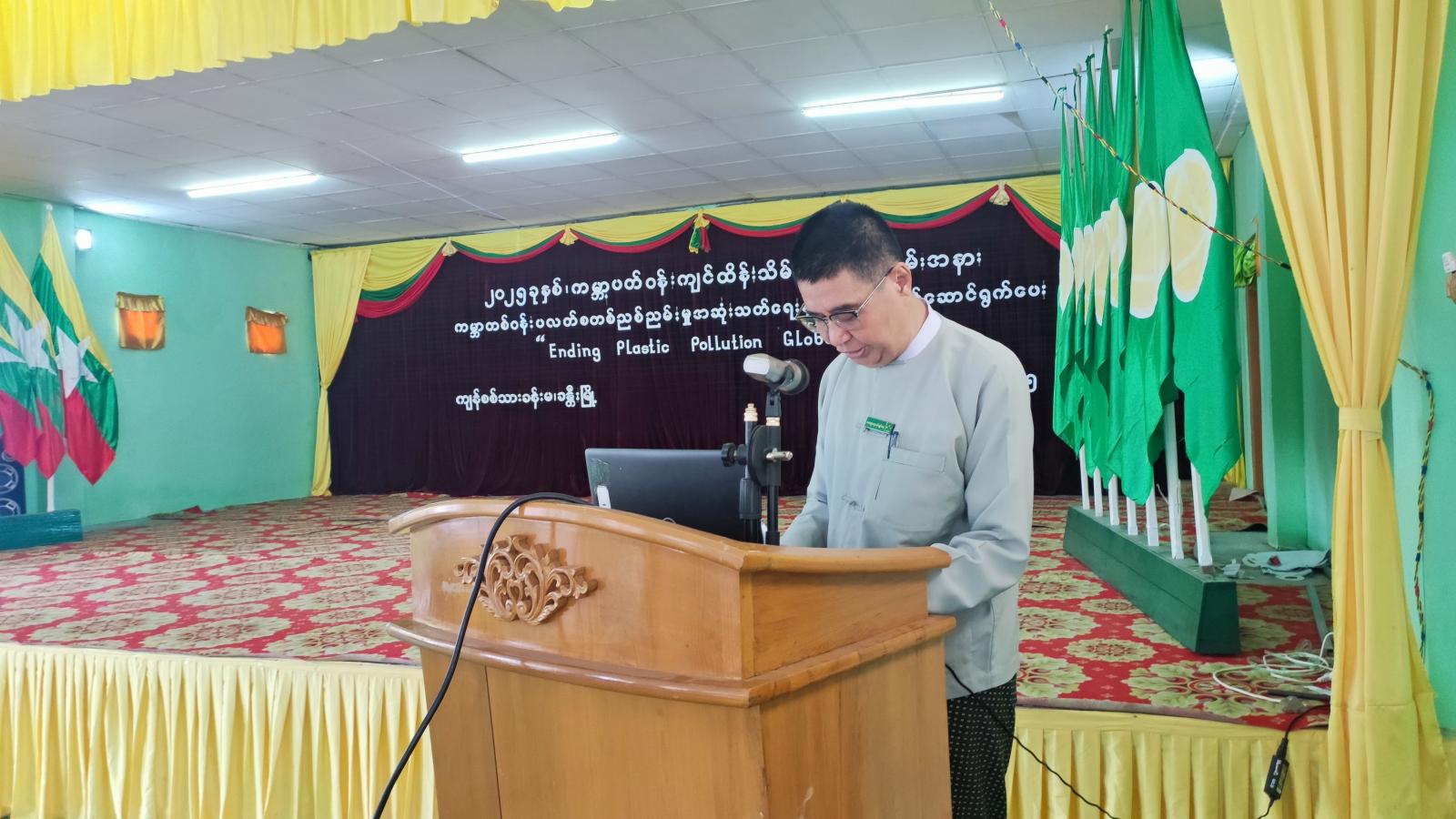 ဦးစွာ ခန္တီးခရိုင်အထွေထွေအုပ်ချုပ်ရေးဦးစီးဌာန၊ ဒုတိယညွှန်ကြားရေးမှူး ဦးကံထူးကအဖွင့်အမှာစကားပြောကြားပြီး ခန္တီးခရိုင်ပတ်ဝန်းကျင်ထိန်းသိမ်းရေးဦးစီးဌာန၊ တာဝန်ခံအရာရှိ ဦးတင့်လွင်ထွန်းက ၂၀၂၅ခုနှစ်၊ ကမ္ဘာ့ပတ်ဝန်းကျင်ထိန်းသိမ်းရေးနေ့ဆောင်ပုဒ်ဖြစ်သည့် ကမ္ဘာတစ်ဝန်း ပလတ်စတစ်ညစ်ညမ်းမှု အဆုံးသတ်ရေး စုပေါင်းအားဖြင့်ဆောင်ရွက်ပေး Ending Plastic Pollution Globally နှင့်ပတ်သက်၍ရှင်းလင်းပြောကြားကာ ကုလသမဂ္ဂ အတွင်းရေးမှူးချုပ်နှင့် UNမှ ပေးပို့သည့် သဝဏ်လွှာ Video Clip အား ပြသခဲ့သည်။