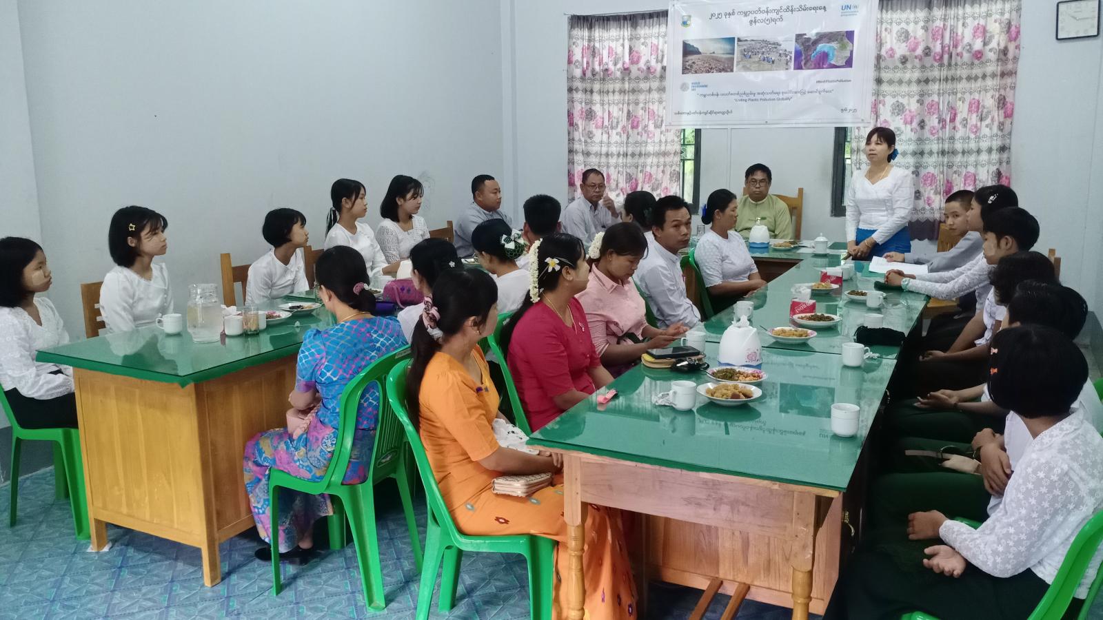 ဆက်လက်၍ ကမ္ဘာ့ပတ်ဝန်းကျင်ထိန်းသိမ်းရေးနေ့ အခမ်းအနားကျင်းပရာ ခရိုင်စီမံအုပ်ချုပ်ရေးအဖွဲ့ဥက္ကဋ္ဌ ဦးစောထွန်းဦးက အဖွင့်အမှားစကားပြောကြားသည်။ ထို့နောက် ခရိုင်ပတ်ဝန်း ကျင်ထိန်းသိမ်းရေးဦးစီးဌာန ခရိုင်တာဝန်ခံဦးညီညီစိုးက ကမ္ဘာ့ပတ်ဝန်းကျင်ထိန်းသိမ်းရေးနေ့ ဖြစ်ပေါ်လာပုံနှင့် ရောင်စုံပန်းချီပြိုင်ပွဲ ကျင်းပရခြင်းရည်ရွယ်ချက်များကို ရှင်းလင်းပြောကြားပြီး ပန်းချီဆရာကြီး ဦးစိုးမြင့်ဝေက ရောင်စုံပန်းချီပြိုင်ပွဲ ဆုရွေးချယ်ခြင်းနှင့်ပတ်သက်၍ ရှင်းလင်းပြောကြားကာ ခရိုင်ပြန်ကြားရေးနှင့်ပြည်သူ့ဆက်ဆံရေးဦးစီးဌာန လက်ထောက်ညွှန်ကြားရေးမှူး ဒေါ်နန်းမြင့်က ဂုဏ်ပြုနှုတ်ဆက်စကားပြောကြားခဲ့သည်။