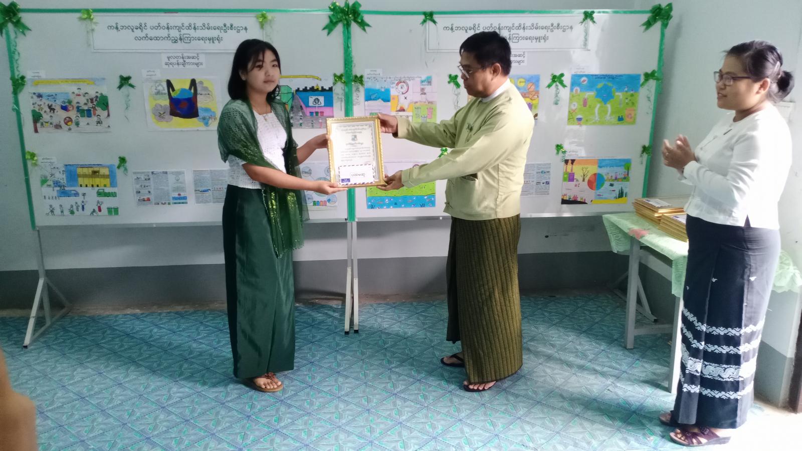 ထို့နောက် ကမ္ဘာ့ပတ်ဝန်းကျင်ထိန်းသိမ်းရေးနေ့ အထိမ်းအမှတ် ရောင်စုံပန်းချီပြိုင်ပွဲ အလယ်တန်းဆင့်နှင့်မူလတန်းဆင့် ပန်းချီပြိုင်ပွဲတွင် ဆုရရှိသောကျောင်းသားကျောင်းသူများအား ခရိုင်စီမံအုပ်ချုပ်ရေးအဖွဲ့ဥက္ကဋ္ဌနှင့် ခရိုင်တာဝန်ခံတို့က ဆုများအသီးသီးချီးမြင့်ပေးအပ်ပြီး ဆုရရှိသူများကိုယ်စား အလယ်တန်းဆင့်ပန်းချီပြိုင်ပွဲတွင် ပထမဆုရရှိသော မခင်ထက်တုဟန်က ကျေးဇူးတင်စကားပြောကြားခဲ့ကြောင်း သိရသည်။
