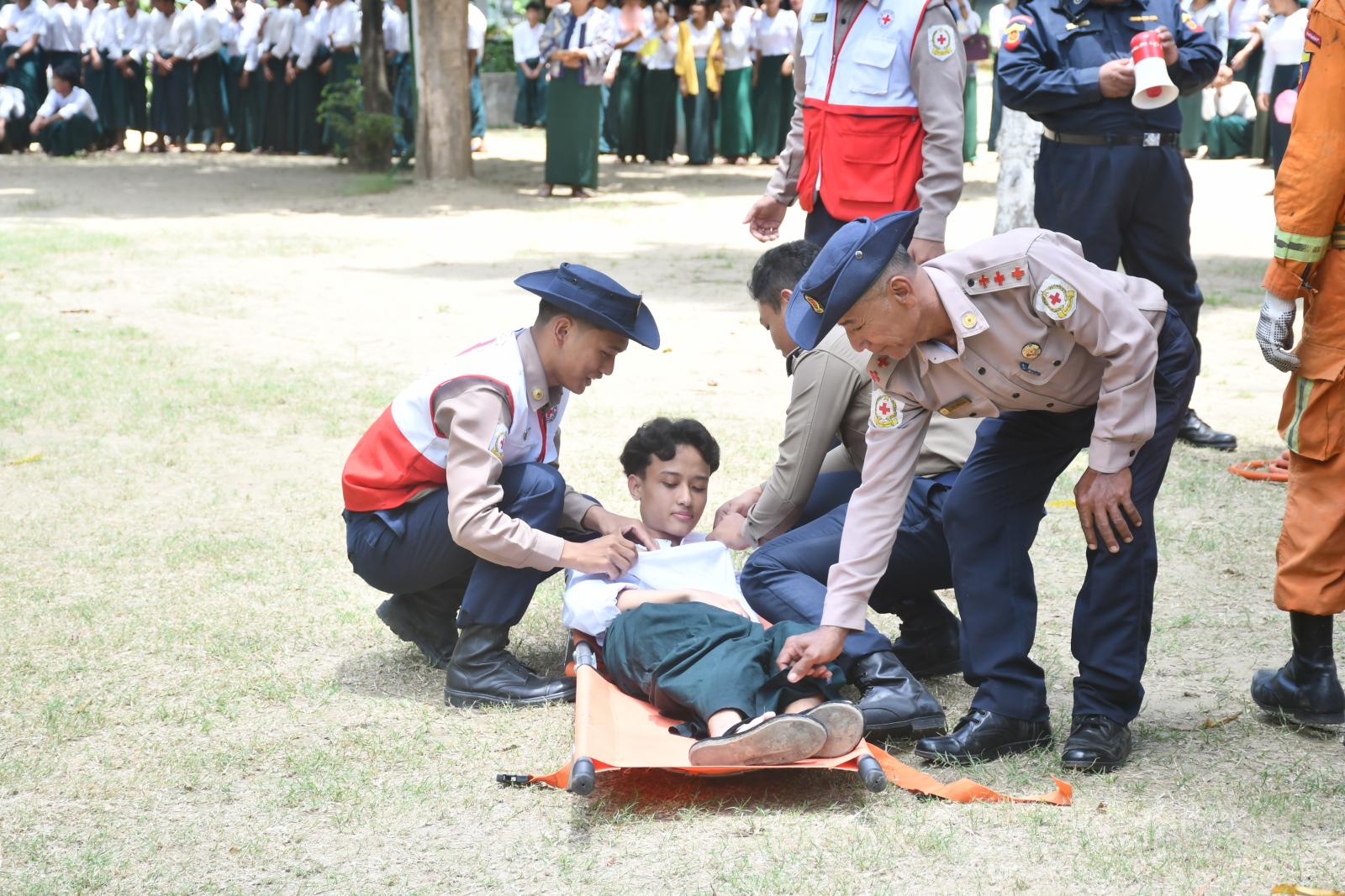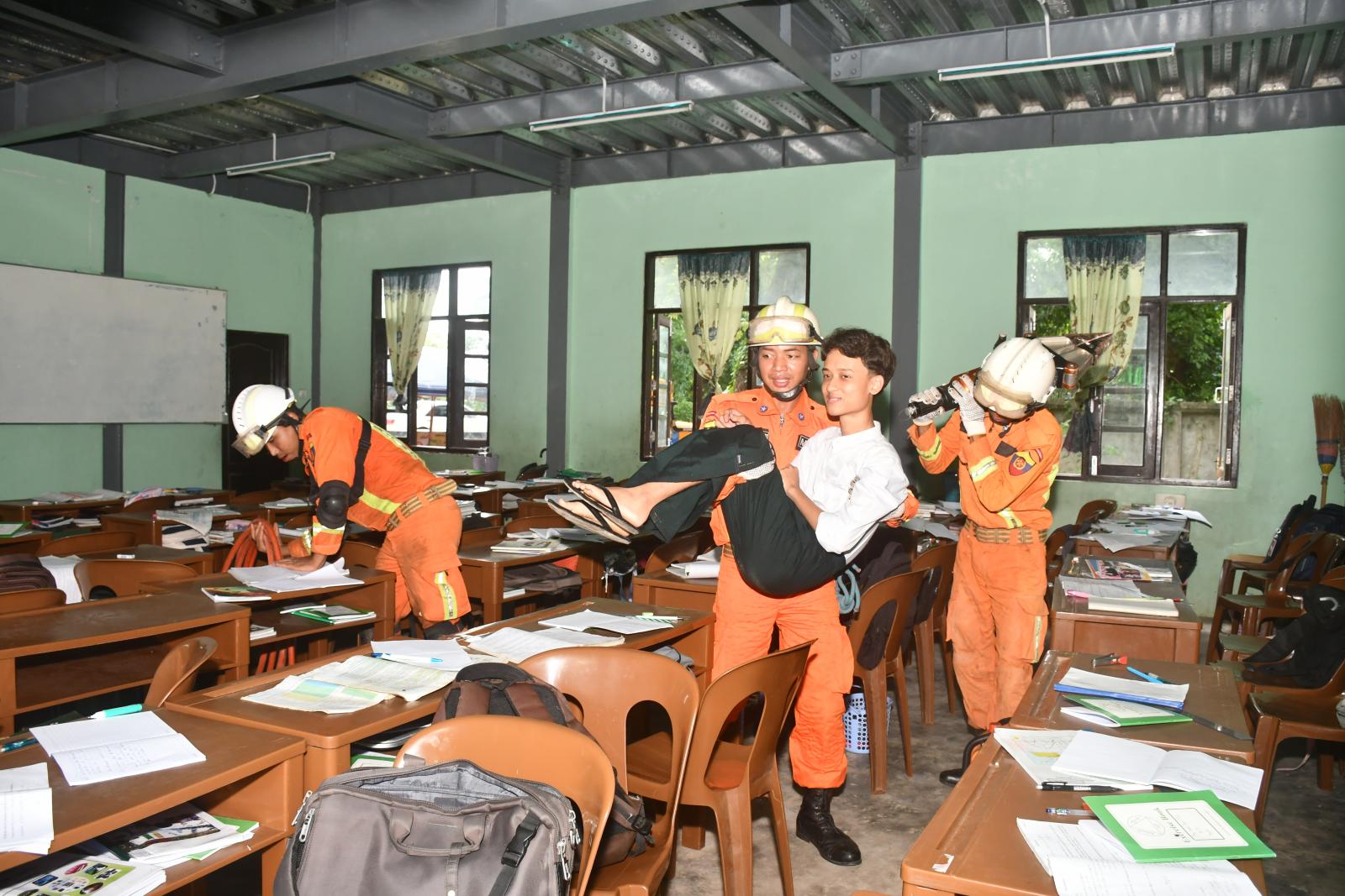 ယင်းနောက် ငလျင်ဘေးသဏ္ဌာန်တူ ဇာတ်တိုက်လေ့ကျင့်ခြင်းဆောင်ရွက်မှုအဖြစ် ငလျင်လှုပ်ခတ်ခြင်း အကြောင်း အချက်ပေးခြင်းနှင့်အတူ ကျောင်းသား ကျောင်းသူများက အဆောက်အအုံနှင့် လွတ်ကင်း ရာကွင်းပြင်နေရာများတွင် နေရာယူခြင်းတို့ကို သရုပ်ပြသကြပြီး ကယ်ဆယ်ရေးအဖွဲ့ဝင်များက ရှာဖွေကယ်ဆယ်ရေးလုပ်ငန်းများ သရုပ်ပြခြင်း၊ ကြက်ခြေနီတပ်ဖွဲ့ဝင်များက ရှေးဦးသူနာပြုစုခြင်း သရုပ်ပြ သခြင်းနှင့် ဘေးကင်းလုံခြုံသည့်နေရာများသို့ ပို့ဆောင်ပေးခြင်း စသည့်သရုပ်ပြသမှုများ ဆောင်ရွက် ခဲ့ကြသည်။