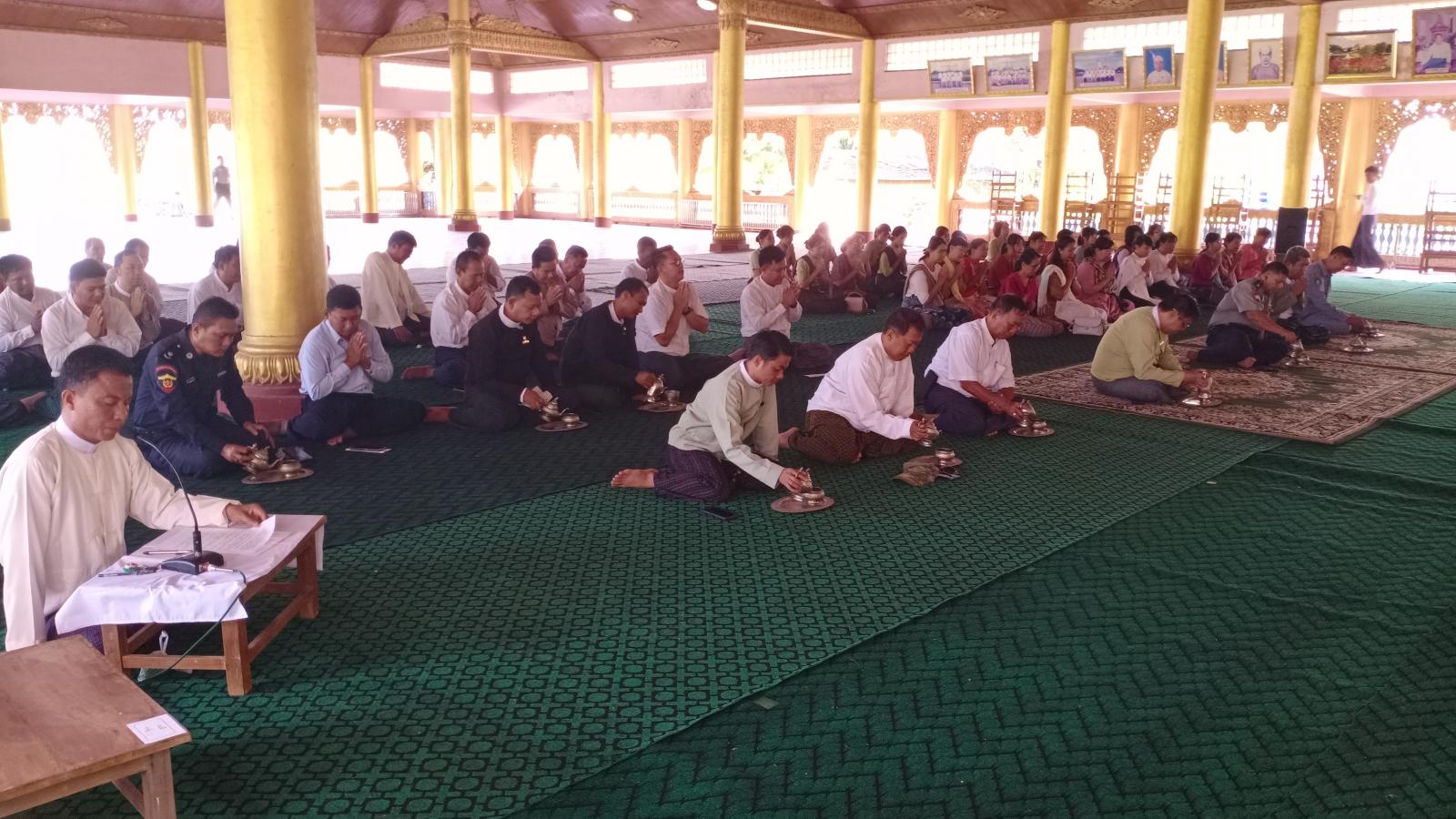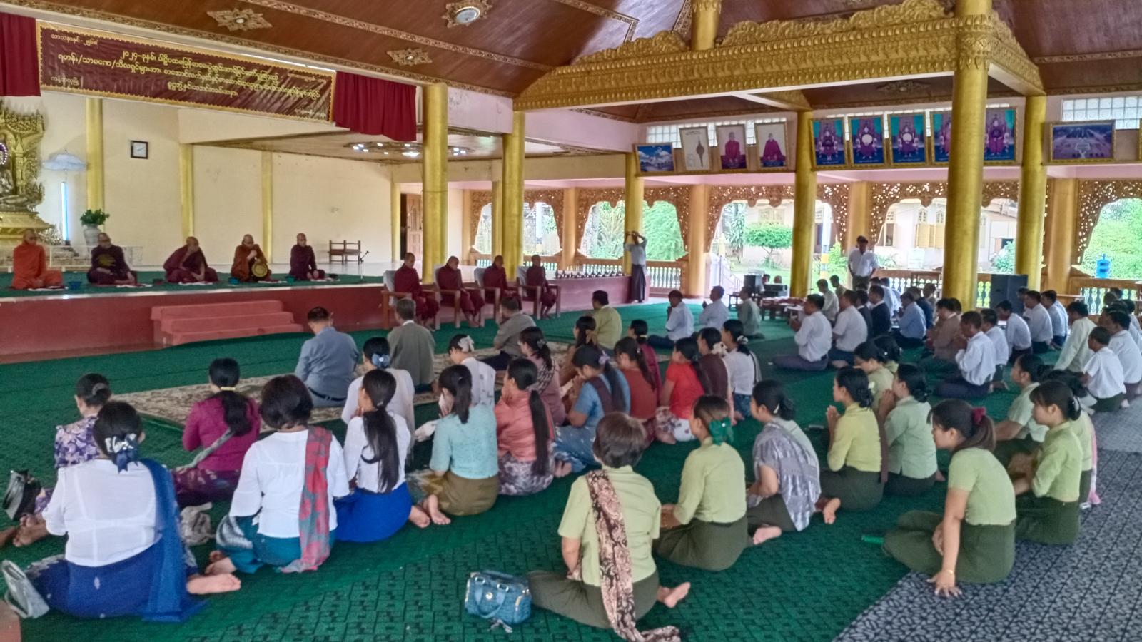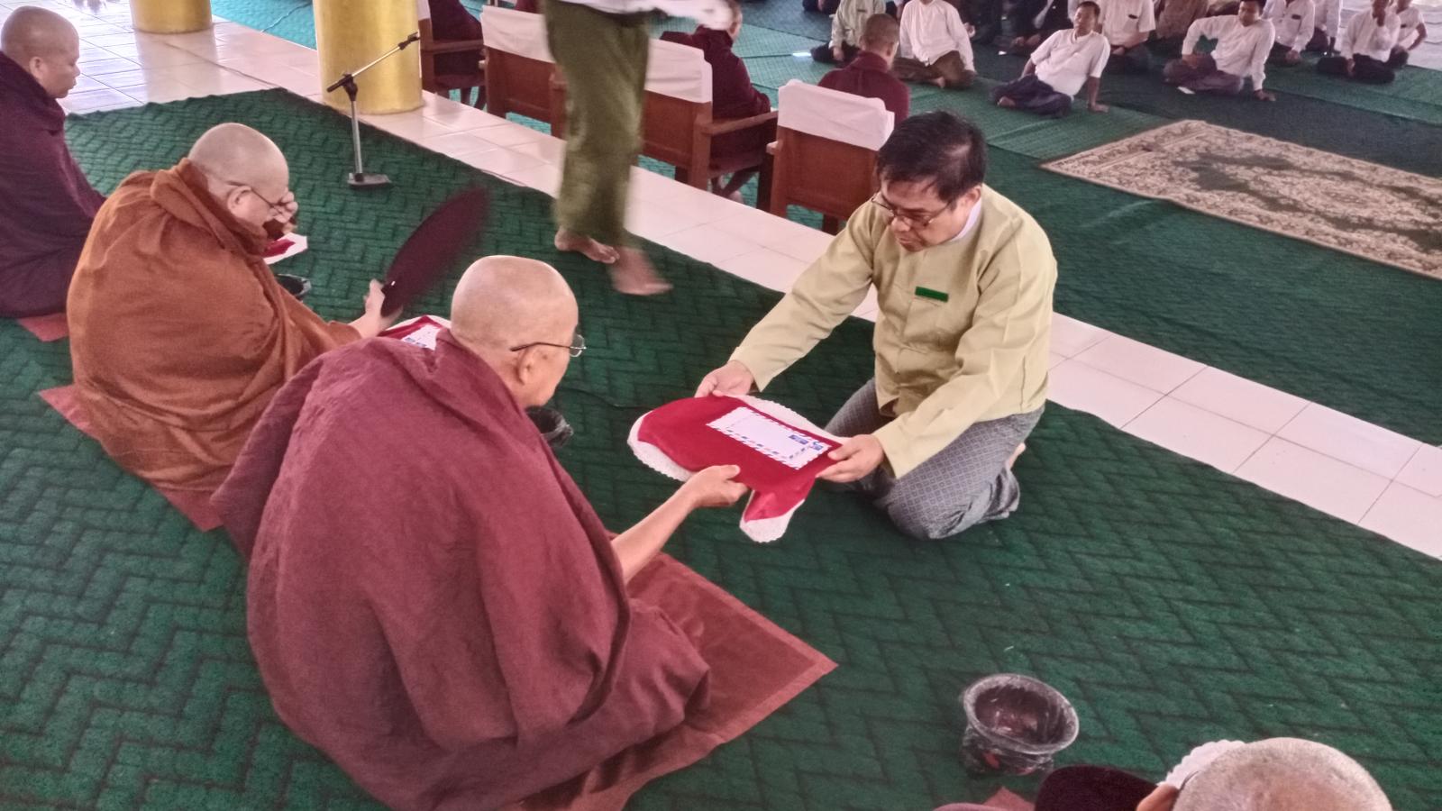 ရှေးဦးစွာ မြို့နယ်သံဃနာယကအဖွဲ့ဥက္ကဋ္ဌ နတ်ပေးကျောင်းတိုက်ကြီး၏ ဦးစီးပဓာန နာယက အဂ္ဂမဟာသဒ္ဓမ္မဇောတိကဓဇ ဘဒ္ဒန္တဣန္ဒောဘာသ ထံမှ ငါးပါးသီလခံယူဆောက်တည်ကြပြီး ခရိုင်စီမံအုပ်ချုပ်ရေးအဖွဲ့ဥက္ကဋ္ဌ ဦးစောထွန်းဦးနှင့်တာဝန်ရှိသူများက ဆရာတော်များထံ လှူဖွယ်ဝတ္ထုငွေများ ဆက်ကပ်လှူဒါန်းကြသည်။ ထို့နောက် နိုင်ငံတော်ဗဟိုသံဃဝန်ဆောင် မြို့ဦးရွာမ ပရိယတ္တိစာသင်တိုက်ကြီး၏ ဦးစီးပဓာနနာယက မဟာသဒ္ဓမ္မဇောတိကဓဇ ဘဒ္ဒန္တတေဇိန္ဒသာရက ဩဝါဒစကားမိန့်ကြားပြီး စာအောင်သံဃာတော်များထံ စာအောင် လက်မှတ်နှင့်စာအောင်ဆုငွေများ ဆက်ကပ်လှူဒါန်းကြသည်။