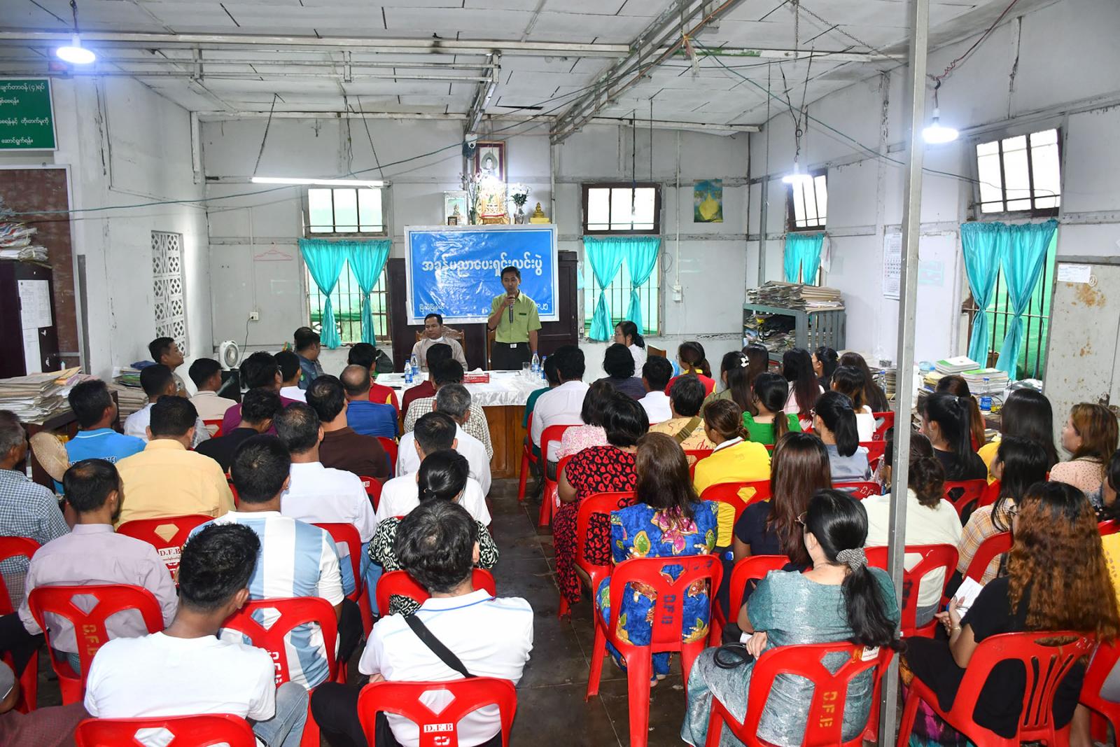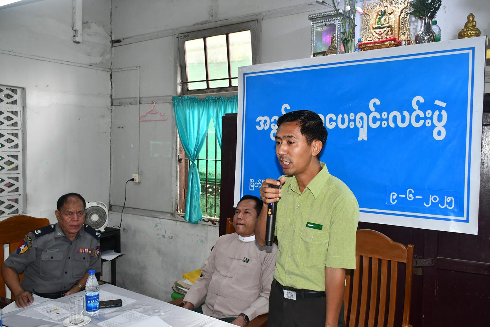 ထို့နောက် မြို့နယ်အခွန်ဦးစီးဌာနမှူး ဦးထက်နေဟိဏ်းက အခွန်ထမ်းဆောင်ထိုက်သူများ အခွန်လွတ်ကင်းမှု၊ လျော့နည်းမှု၊ ရှောင်တိမ်းမှုမရှိစေရေး၊ ဥပဒေနှင့်အညီ အခွန်ပေးဆောင်နိုင်စေရေး၊ ပြေစာများအပေါ်တွင် အခွန်အမှတ်တံဆိပ် ပြည့်ဝစွာ ကပ်နှိပ်ရောင်းချစေရေး၊ ကျပ်သိန်း (၂၀၀) ထက်ပိုသည့် ငွေပေးချေမှုများအတွက် မြန်မာနိုင်ငံ ဗဟိုဘဏ်၏ အမိန့်ကြေညာစာအမှတ် (၄၃/၂၀၂၁) နှင့် အညီ လိုက်နာဆောင်ရွက်ကြရန်နှင့် အခွန်ဆိုင်ရာကိစ္စရပ်များကို အကျယ်တဝင့် ရှင်းလင်းပြောကြားသည်။